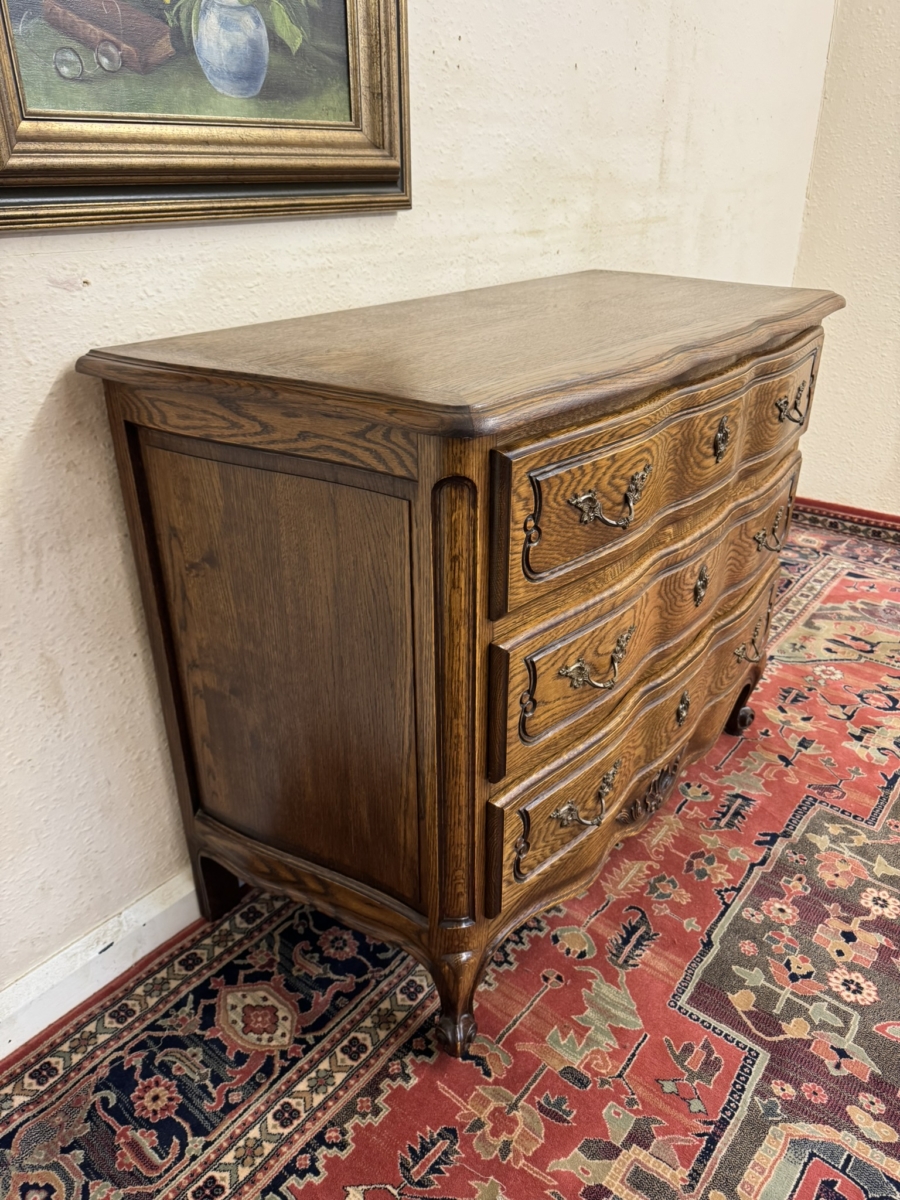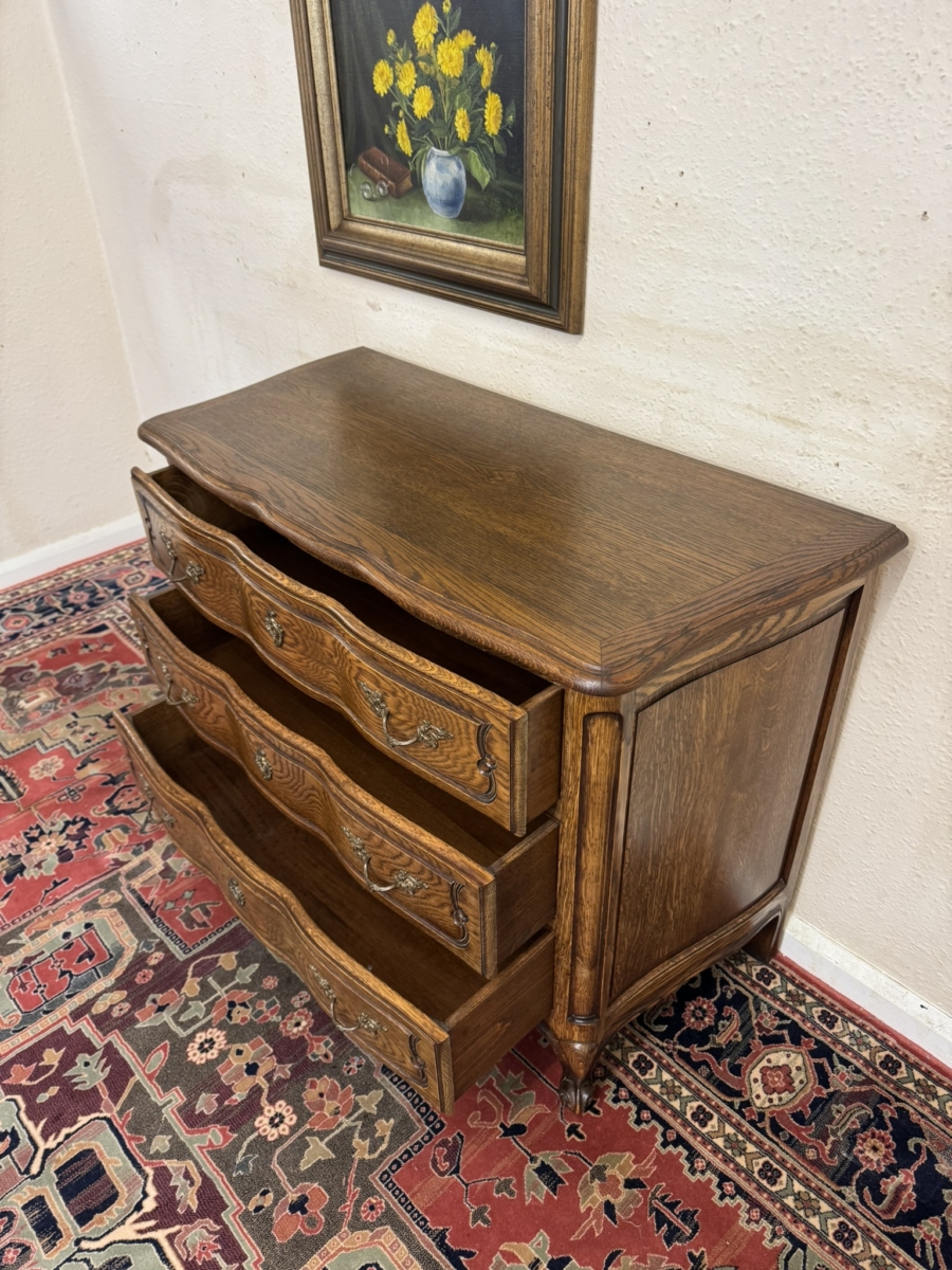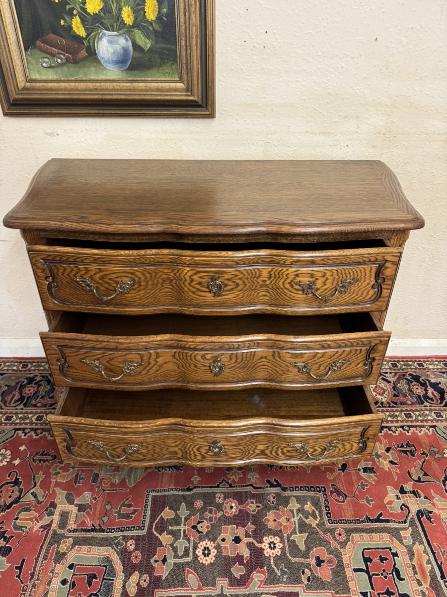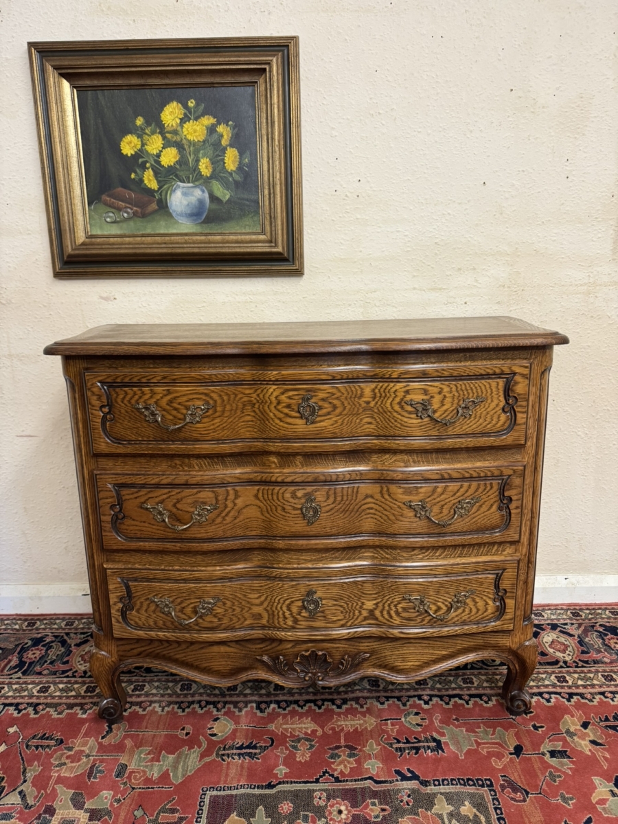 This fantastic French chest of drawers is in excellent condition. The shaped over sailing top sits above three serpentine shaped drawers, each drawer having a pair of ornate brass handles, brass escutcheon and carving. Shaped sides, shaped skirt with central decorative carving and standing on two carved cabriole shaped legs to the front.