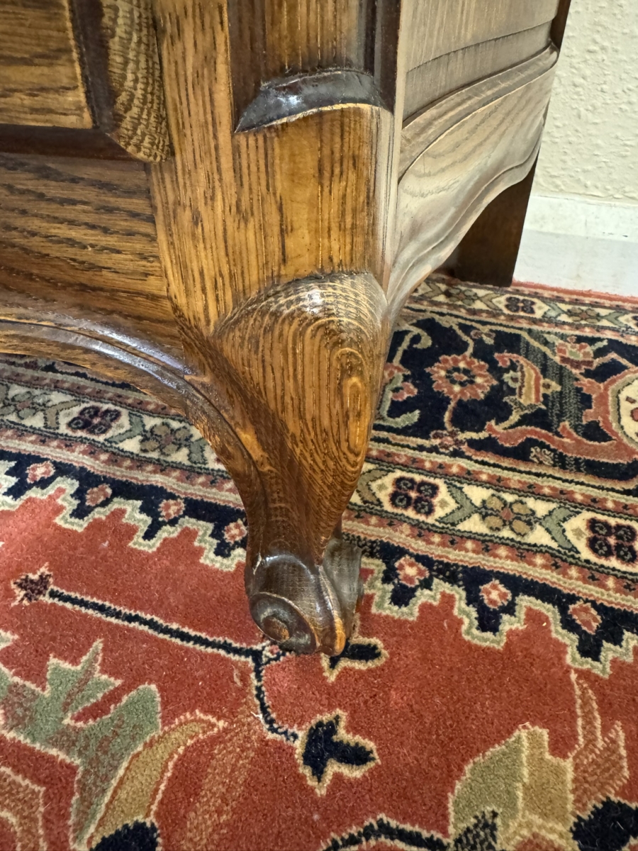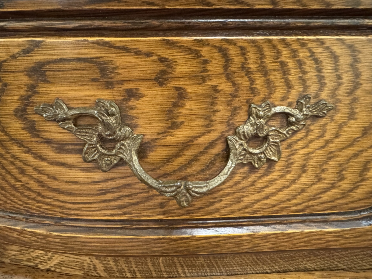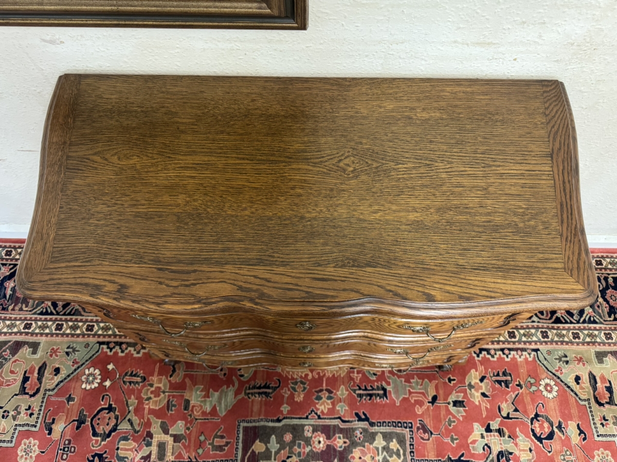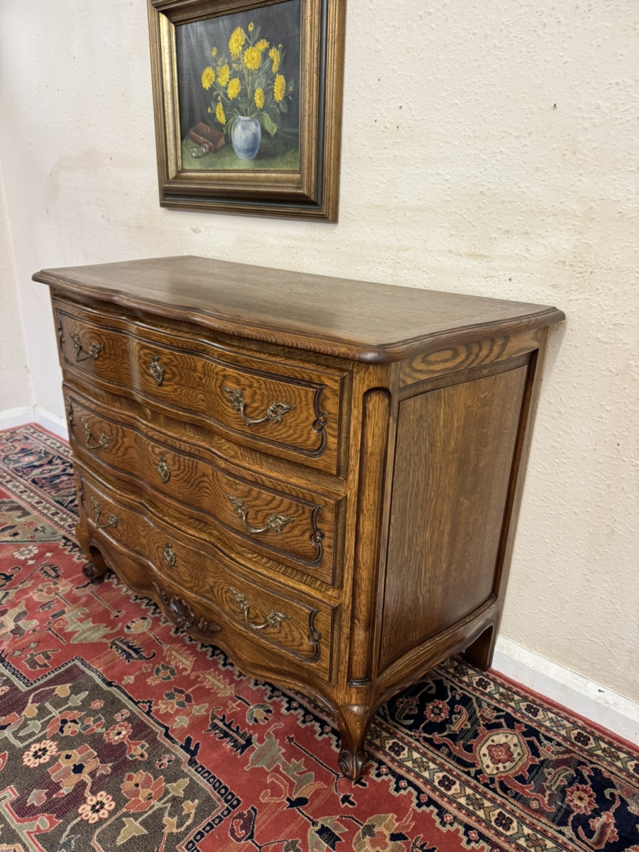 This fantastic French chest of drawers is in excellent condition. The shaped over sailing top sits above three serpentine shaped drawers, each drawer having a pair of ornate brass handles, brass escutcheon and carving. Shaped sides, shaped skirt with central decorative carving and standing on two carved cabriole shaped legs to the front.
