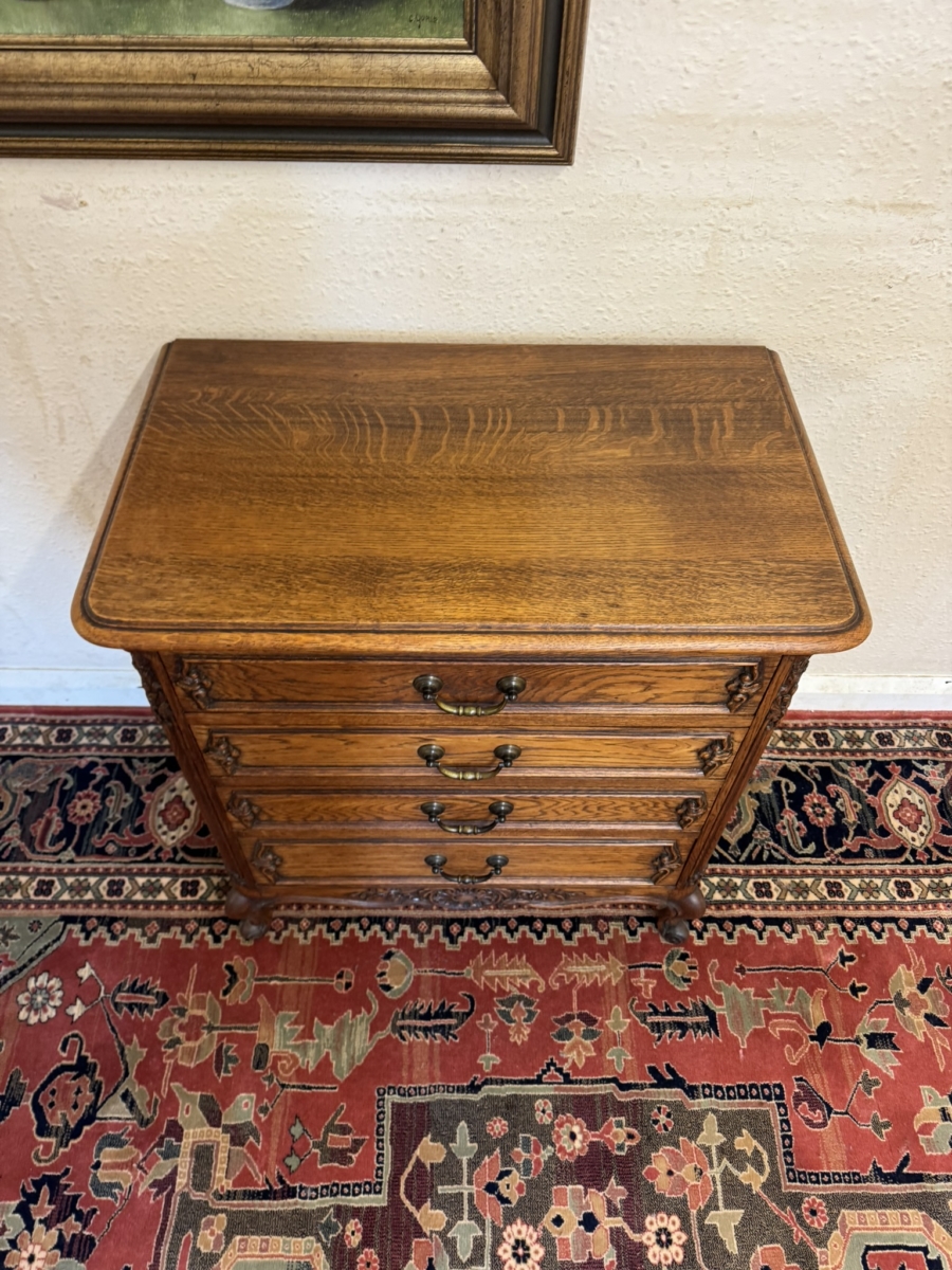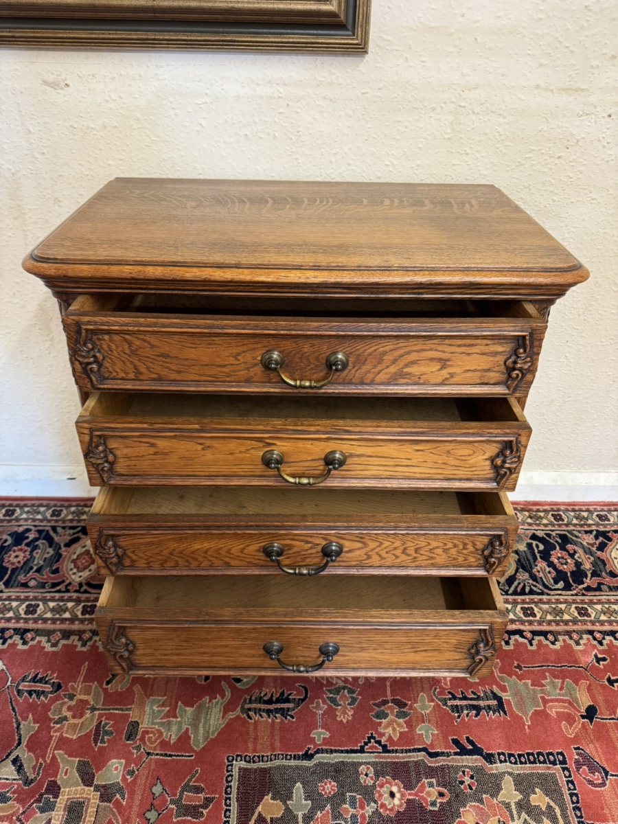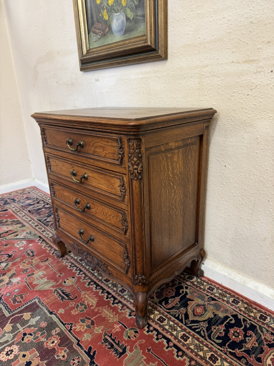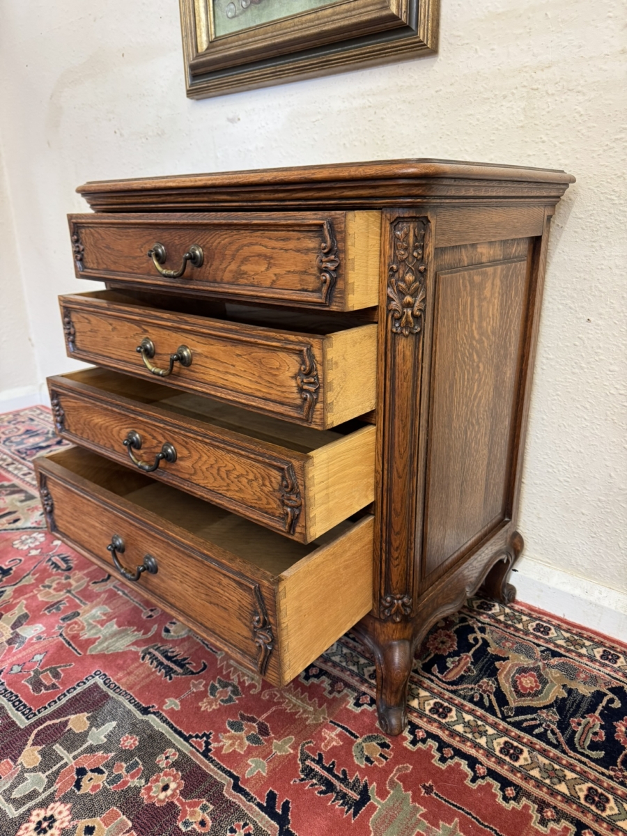 This neat sized chest is in excellent condition and made in fabulous oak. The over sailing top has curved corners to the front. Below are four carved drawers, each drawer having a brass drop handle, there are carvings to the sides of the drawers. Recessed panelled sides, shaped skirt with central ornate carving and standing on four carved cabriole shaped legs.