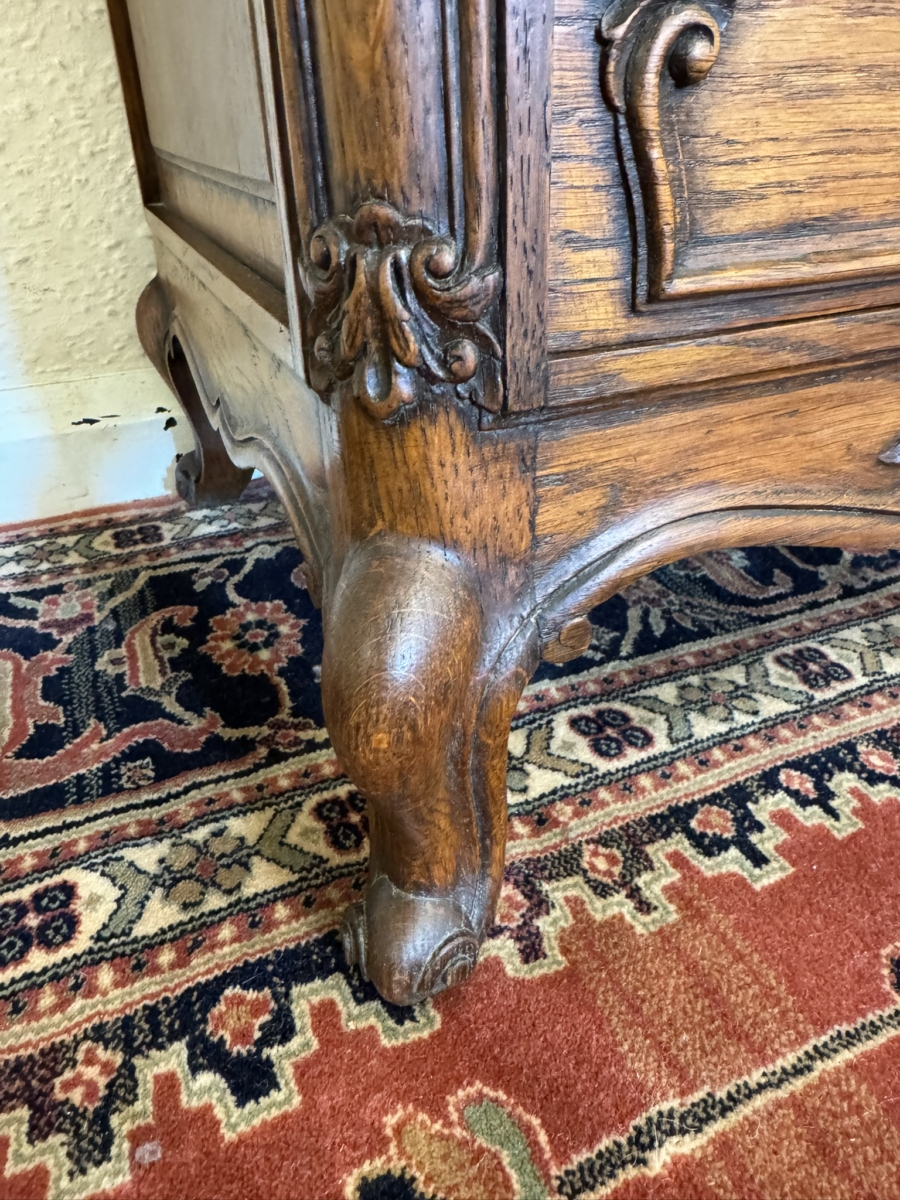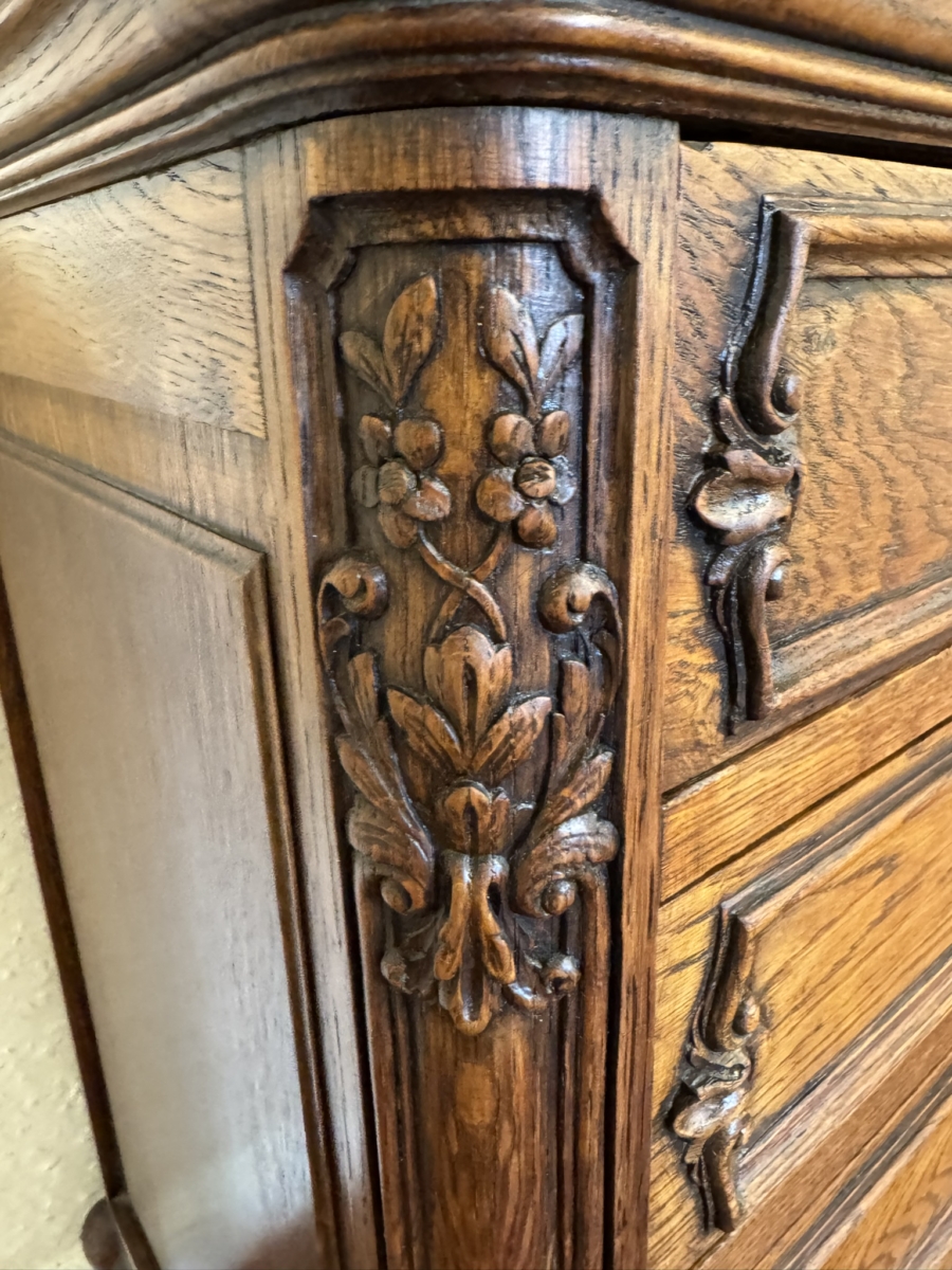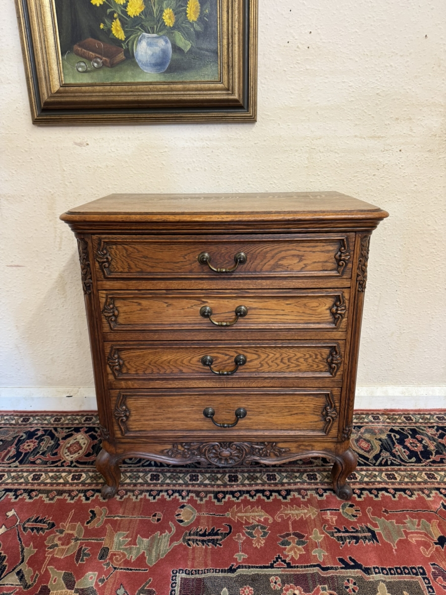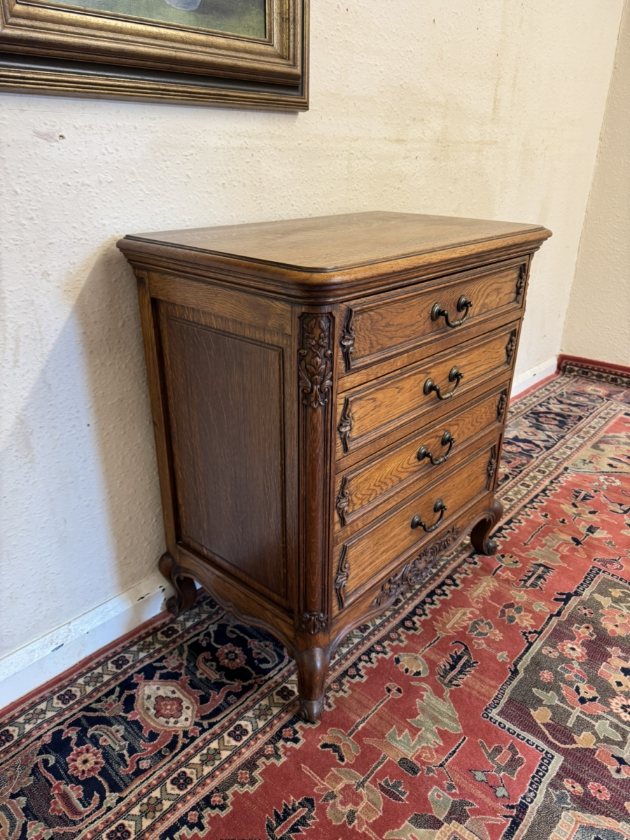 This neat sized chest is in excellent condition and made in fabulous oak. The over sailing top has curved corners to the front. Below are four carved drawers, each drawer having a brass drop handle, there are carvings to the sides of the drawers. Recessed panelled sides, shaped skirt with central ornate carving and standing on four carved cabriole shaped legs.