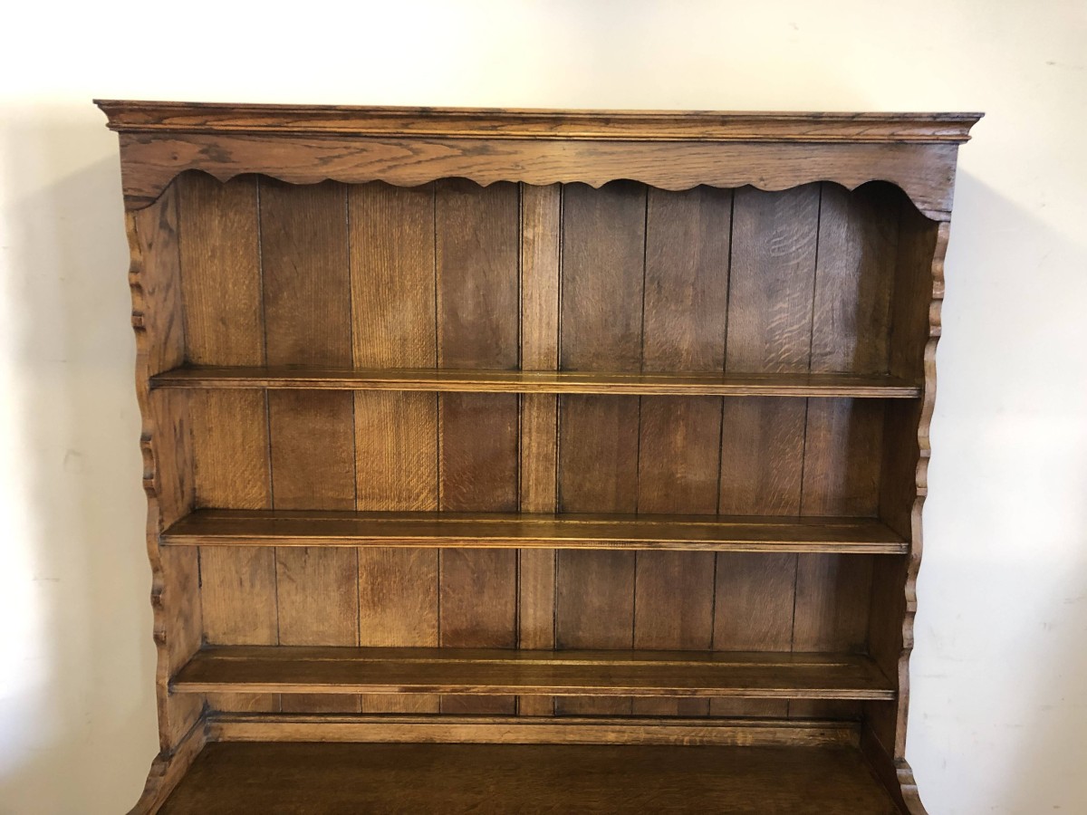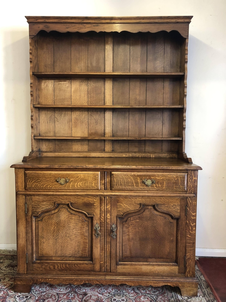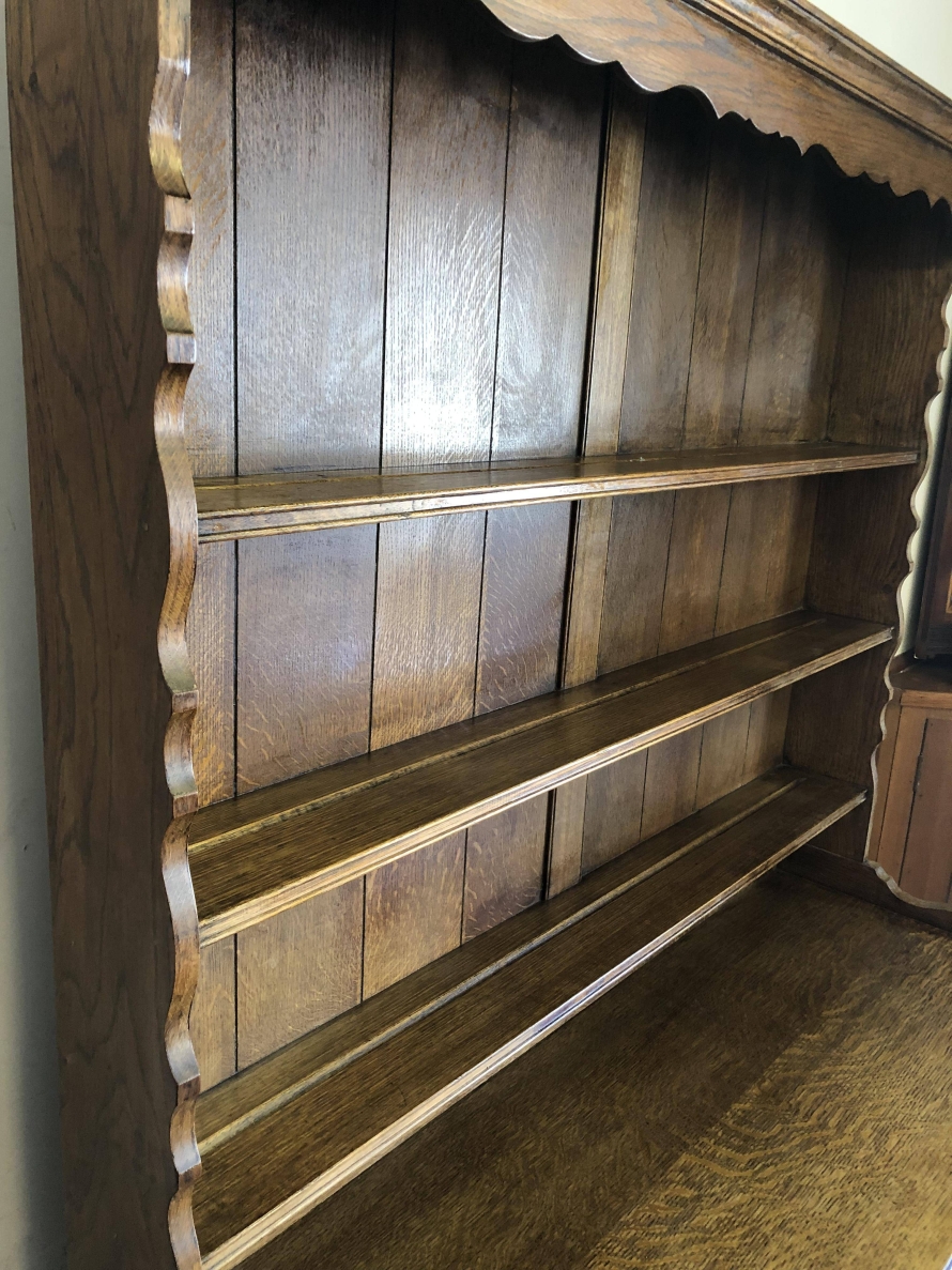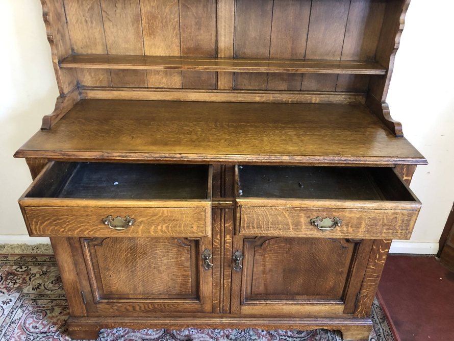We are delighted to offer this great golden oak dresser. The removable plate rack back has wavy a prison top and sides, there are three shelves and a panelled back. The base has an over sailing top which sits above two drawers, each drawer having decorative brass handle. Below are a pair of recessed panelled cupboard doors, each door having decorative brass handle, the doors open to reveal a shelf. Shaped skirt to the sides and front this lovely item sits on bracket feet.