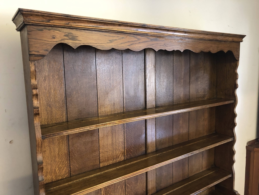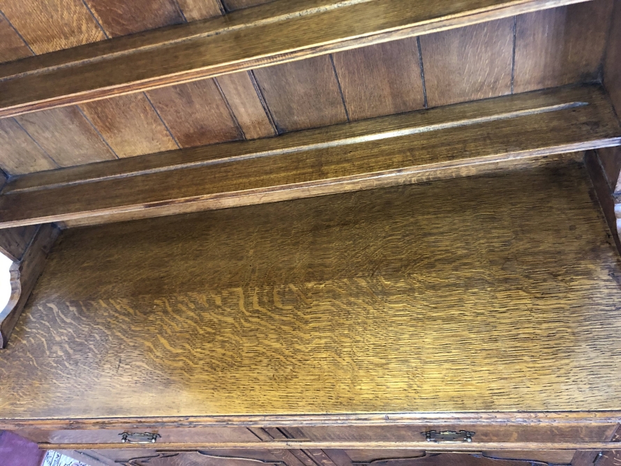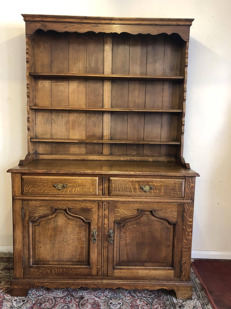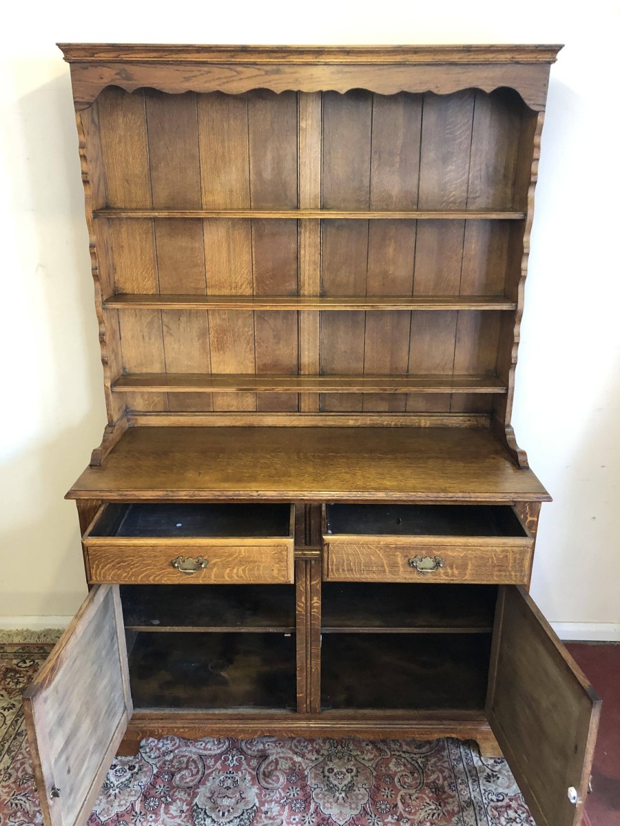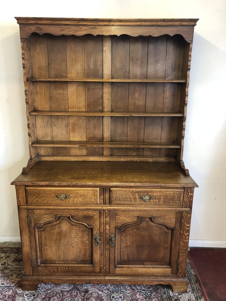 We are delighted to offer this great golden oak dresser. The removable plate rack back has wavy a prison top and sides, there are three shelves and a panelled back. The base has an over sailing top which sits above two drawers, each drawer having decorative brass handle. Below are a pair of recessed panelled cupboard doors, each door having decorative brass handle, the doors open to reveal a shelf. Shaped skirt to the sides and front this lovely item sits on bracket feet.