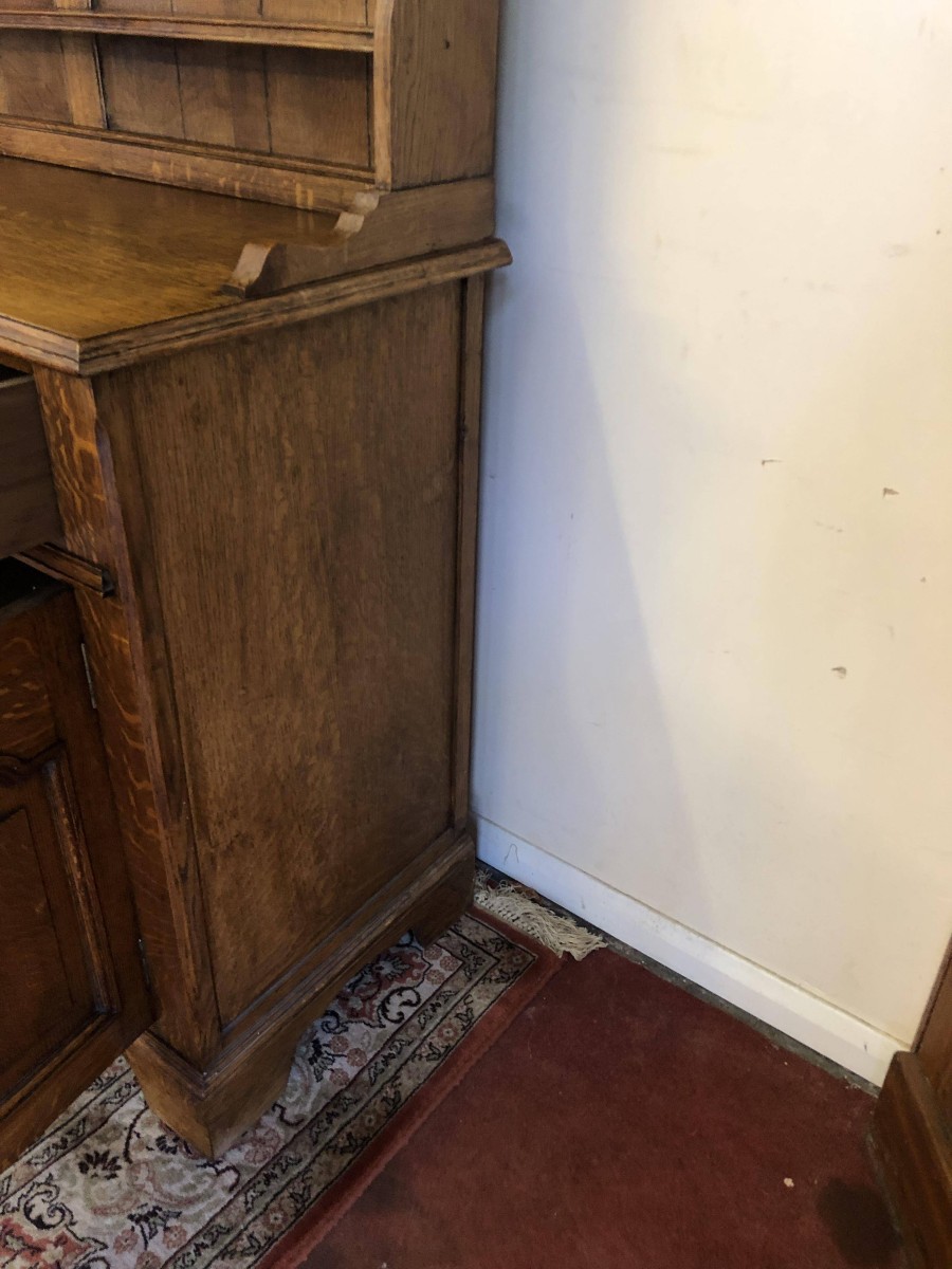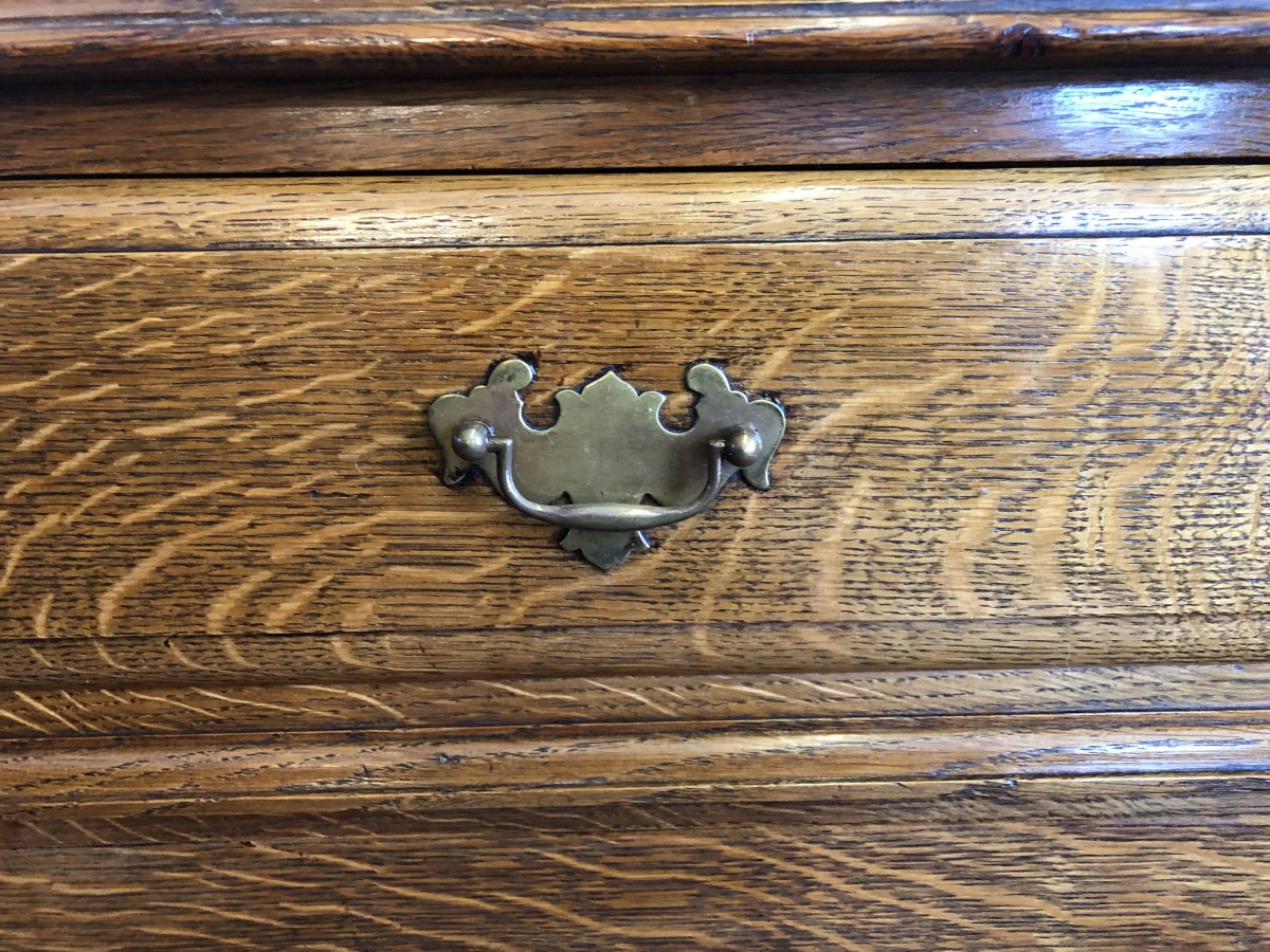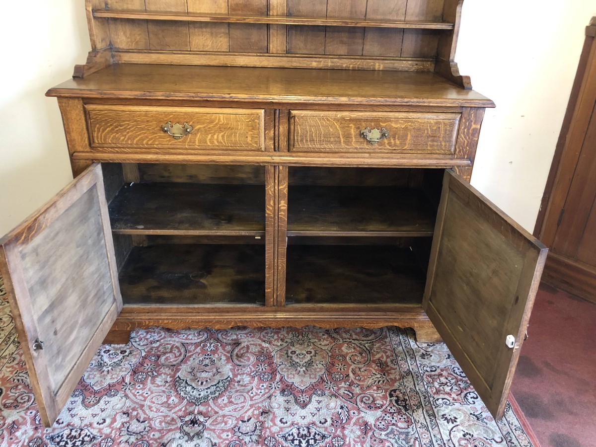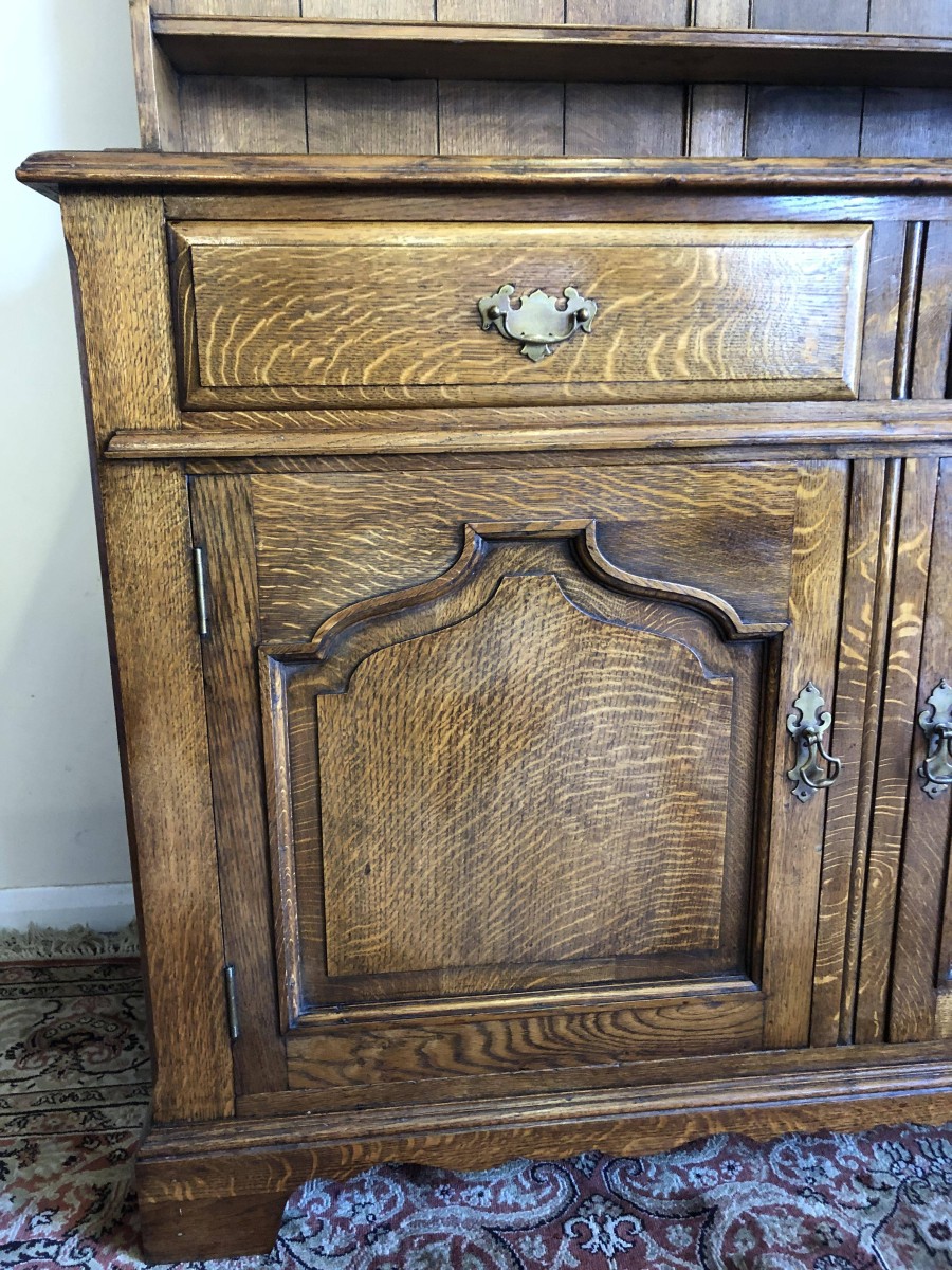 We are delighted to offer this great golden oak dresser. The removable plate rack back has wavy a prison top and sides, there are three shelves and a panelled back. The base has an over sailing top which sits above two drawers, each drawer having decorative brass handle. Below are a pair of recessed panelled cupboard doors, each door having decorative brass handle, the doors open to reveal a shelf. Shaped skirt to the sides and front this lovely item sits on bracket feet.