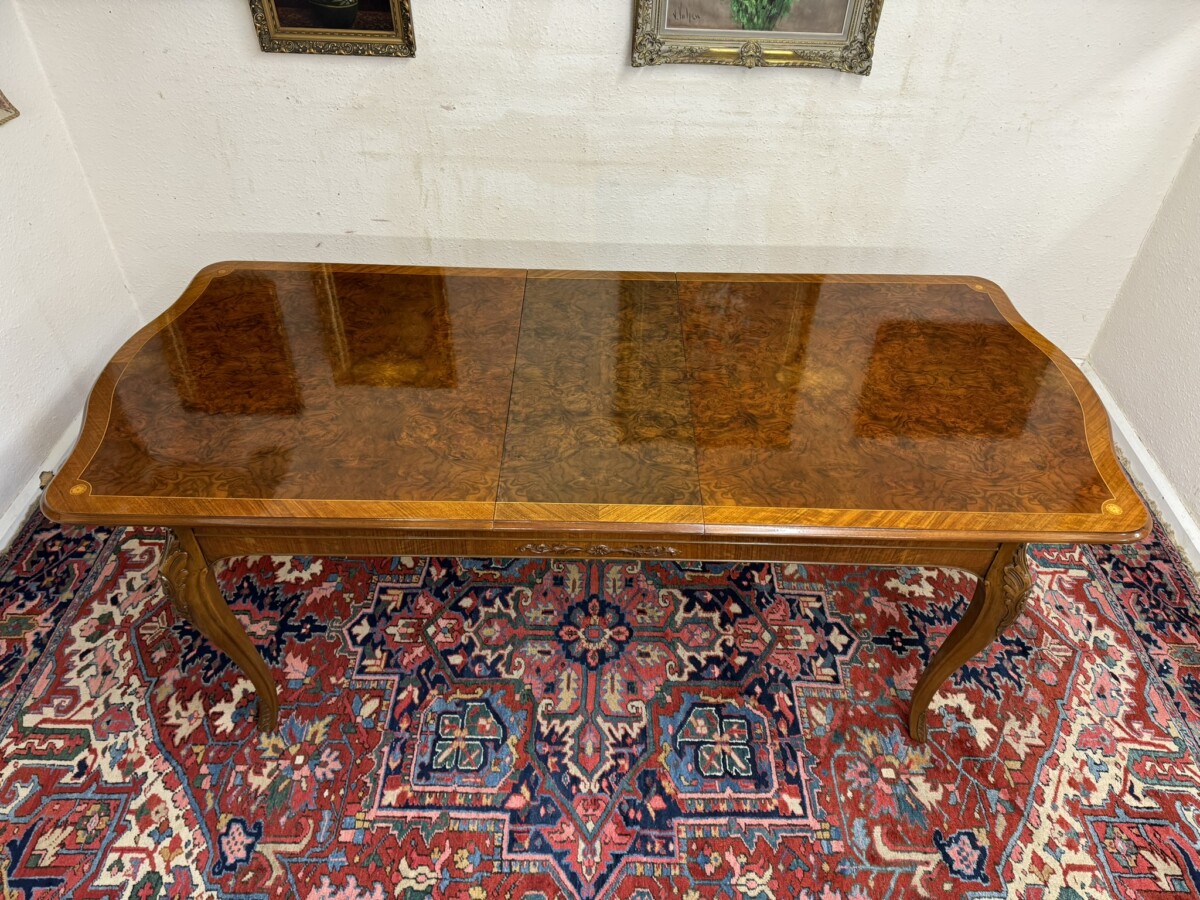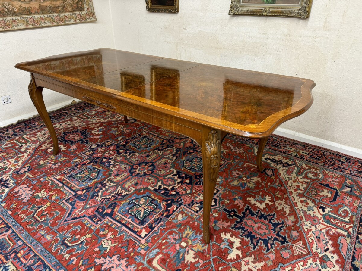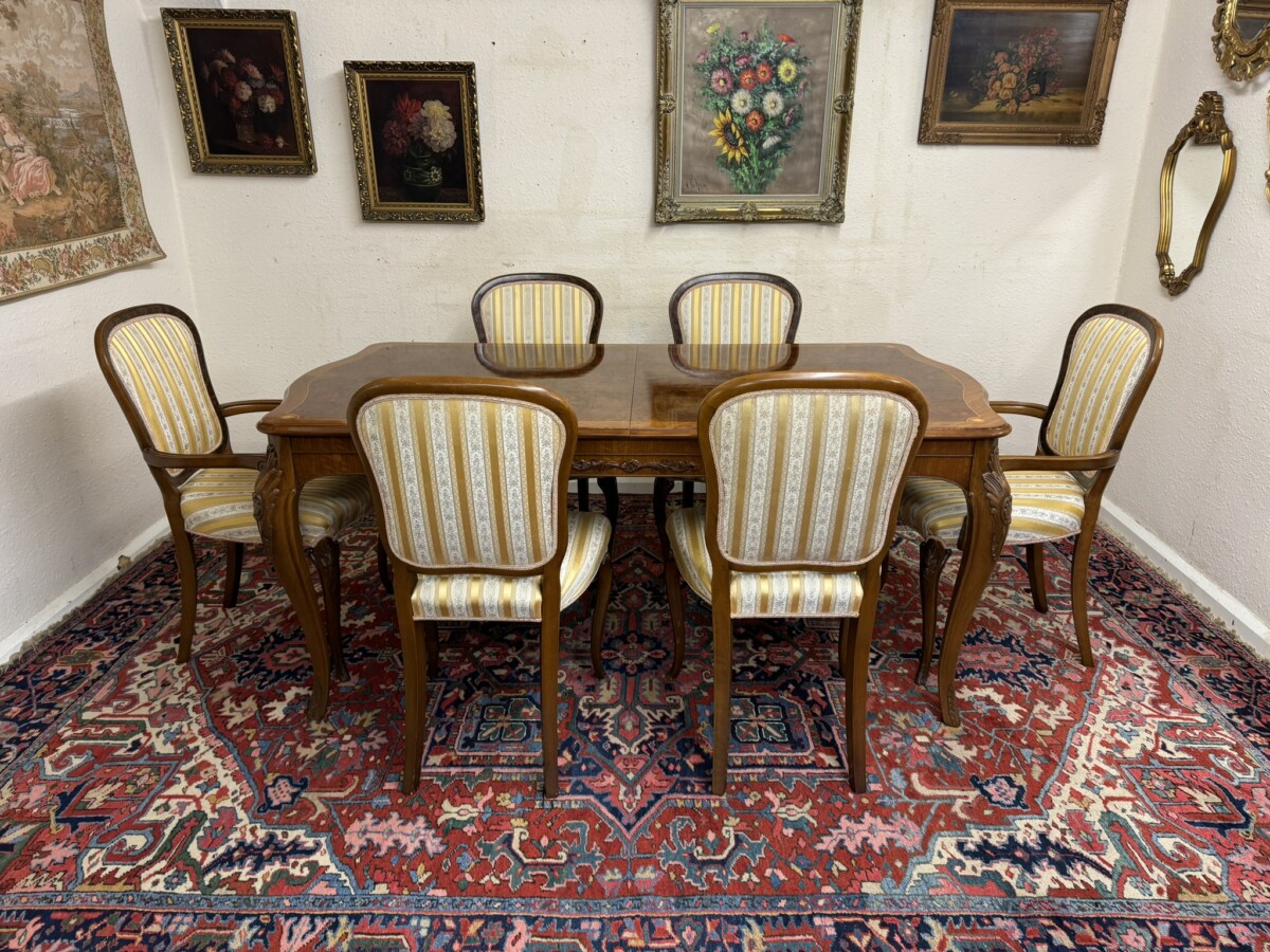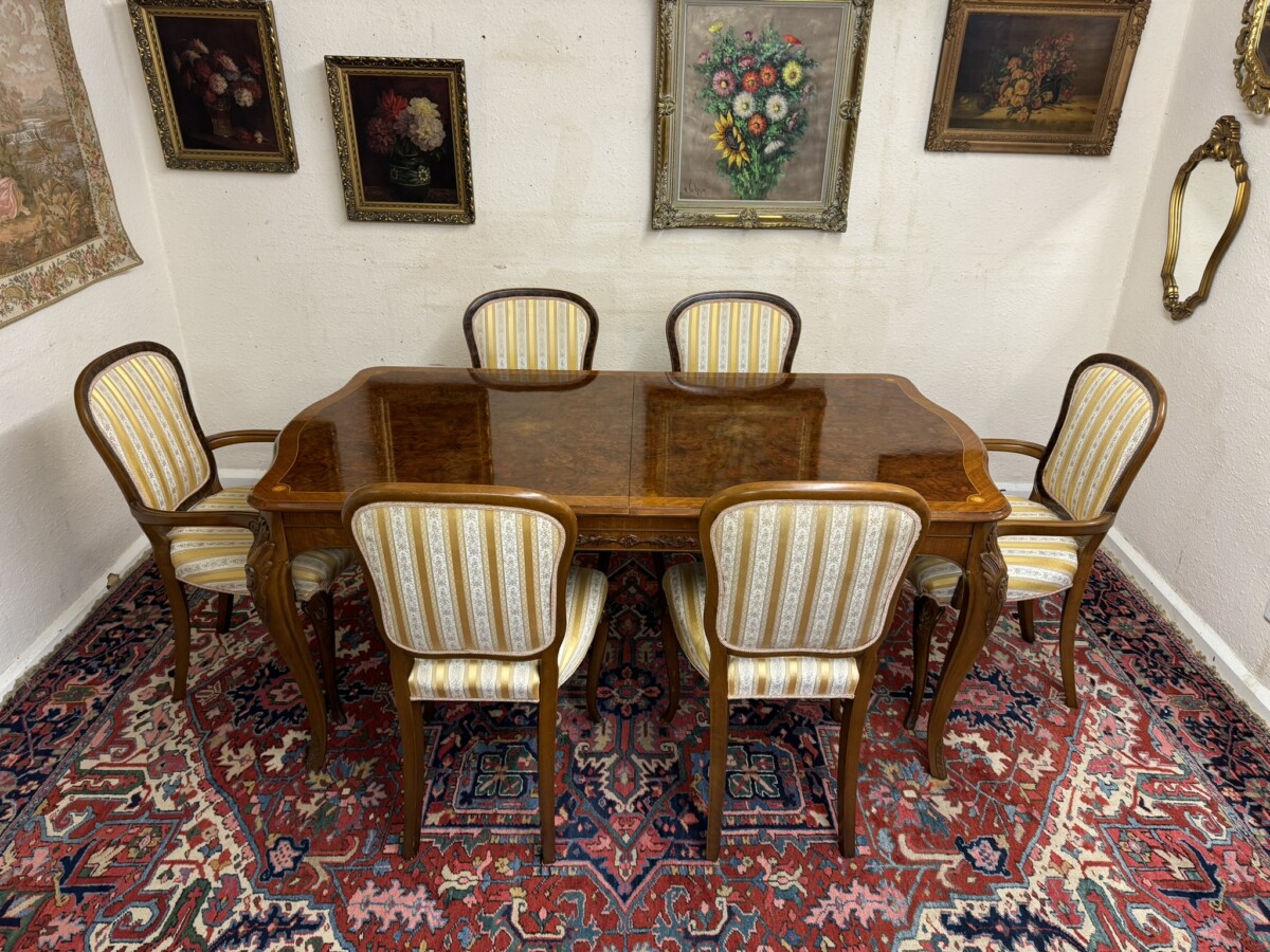 This fabulous quality table and chairs is produced by the renowned H and L Epstein furniture makers of London and dates circa 1950. The fabulous table has curved ends, inlaid decoration and a striking patina. There is a hidden leaf which is stored under the table to extend the tables length. The table stands on four elegant carved cabriole shaped legs. Two carved armchairs and four single chairs all having striking burr walnut edging to the back, upholstered cushioned back rest and seat and standing on four carved cabriole shaped legs to the front. An exceptional quality table and chairs. There are table top protectors.