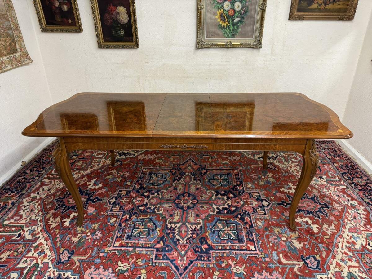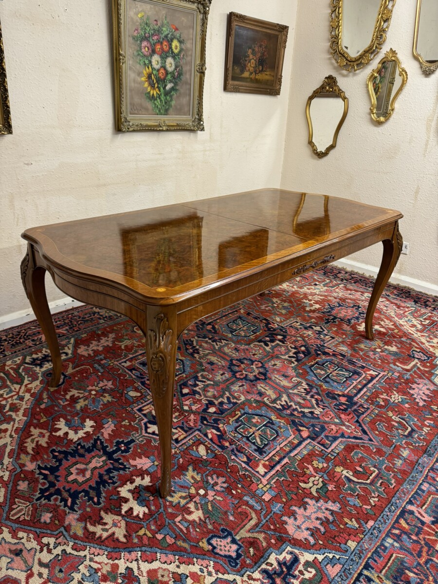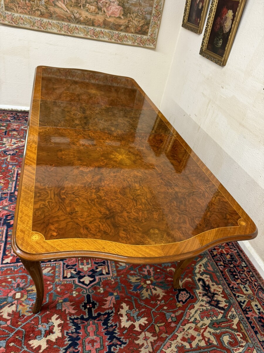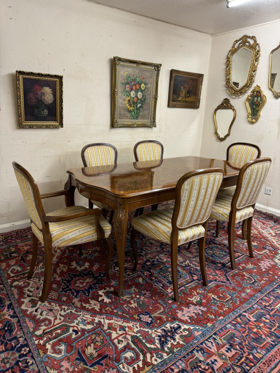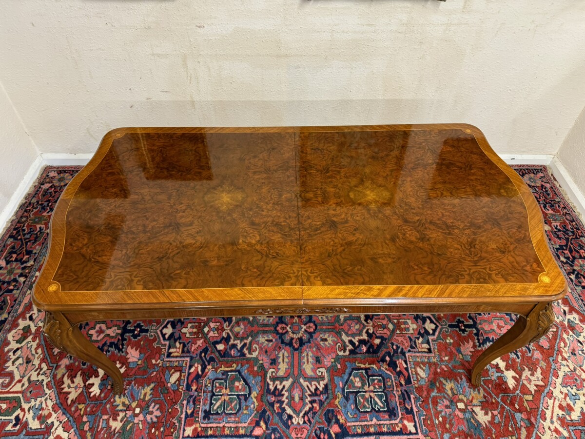 This fabulous quality table and chairs is produced by the renowned H and L Epstein furniture makers of London and dates circa 1950. The fabulous table has curved ends, inlaid decoration and a striking patina. There is a hidden leaf which is stored under the table to extend the tables length. The table stands on four elegant carved cabriole shaped legs. Two carved armchairs and four single chairs all having striking burr walnut edging to the back, upholstered cushioned back rest and seat and standing on four carved cabriole shaped legs to the front. An exceptional quality table and chairs. There are table top protectors.