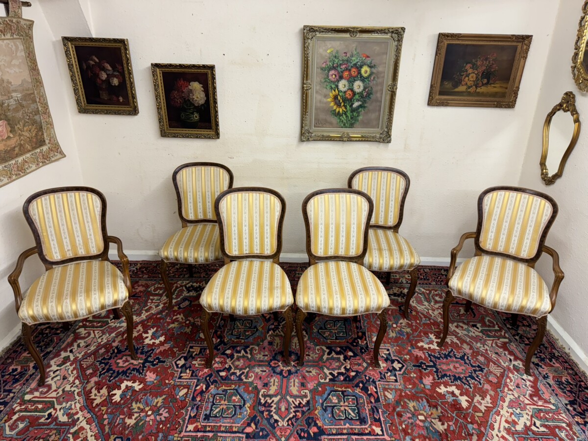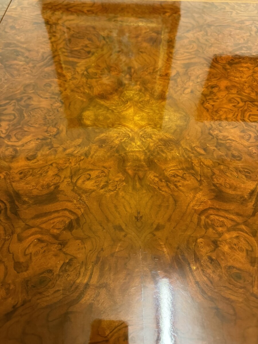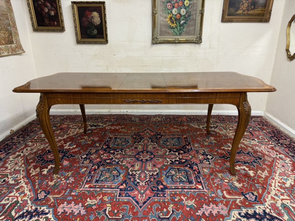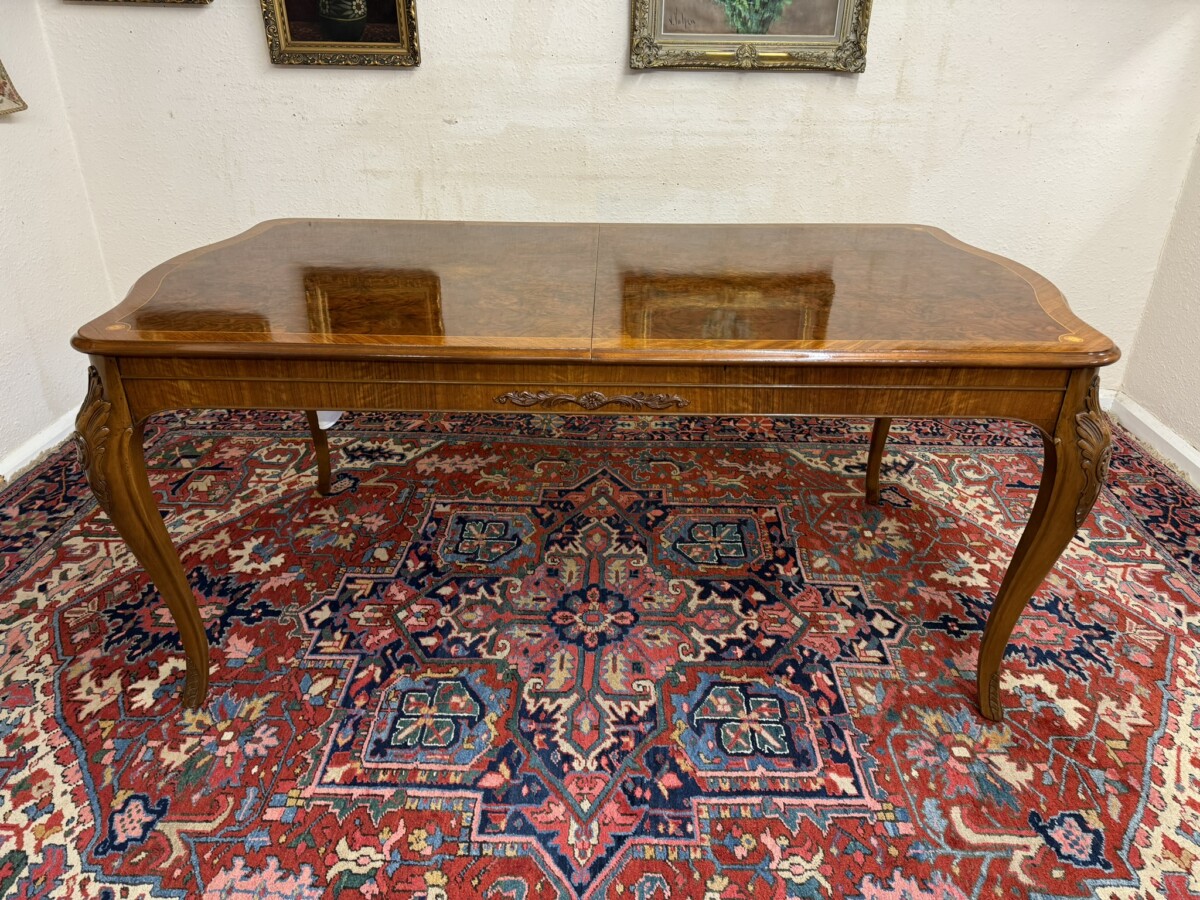 This fabulous quality table and chairs is produced by the renowned H and L Epstein furniture makers of London and dates circa 1950. The fabulous table has curved ends, inlaid decoration and a striking patina. There is a hidden leaf which is stored under the table to extend the tables length. The table stands on four elegant carved cabriole shaped legs. Two carved armchairs and four single chairs all having striking burr walnut edging to the back, upholstered cushioned back rest and seat and standing on four carved cabriole shaped legs to the front. An exceptional quality table and chairs. There are table top protectors.