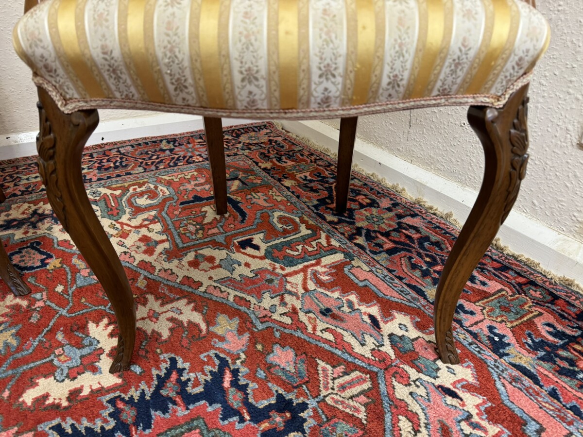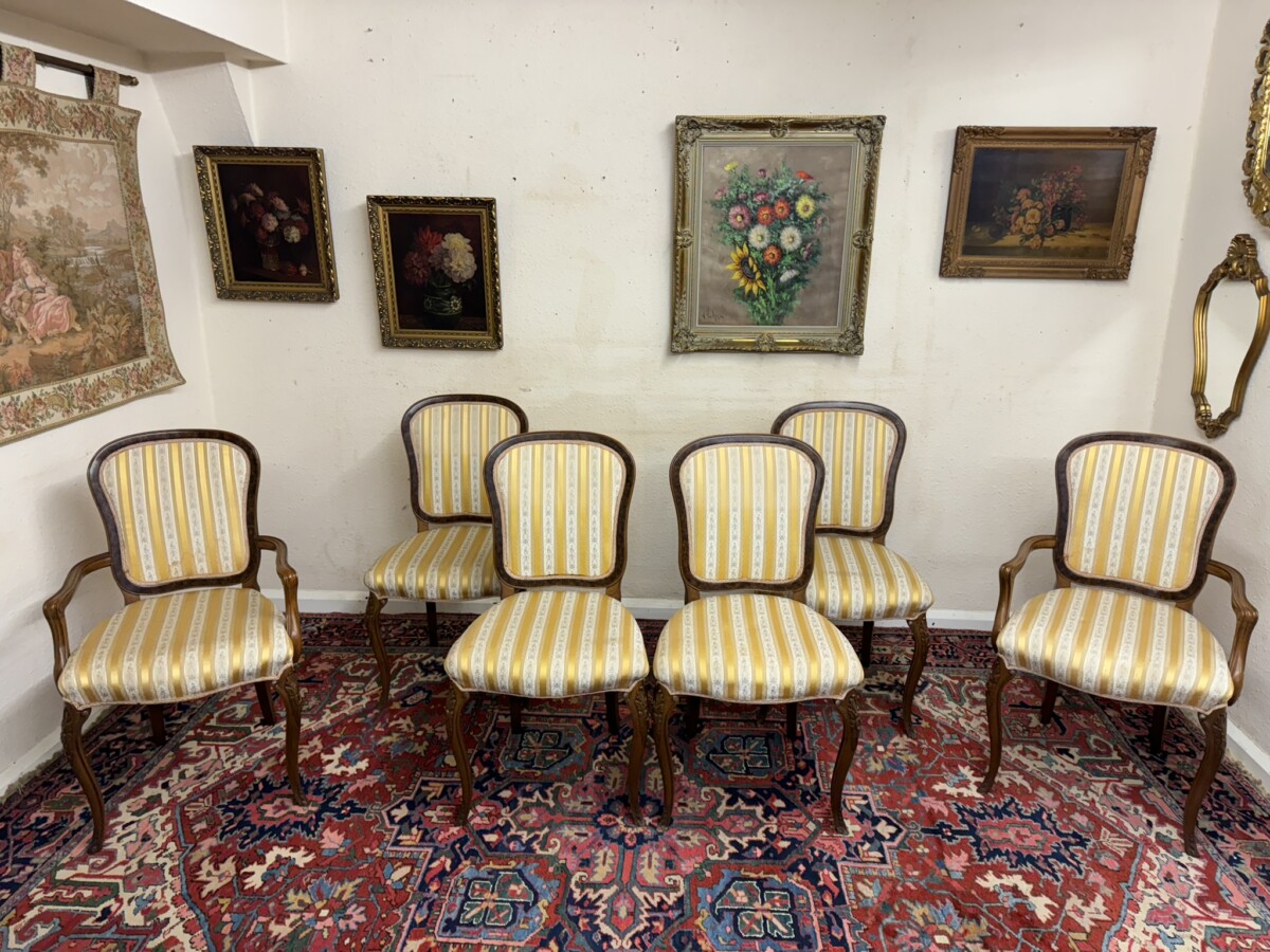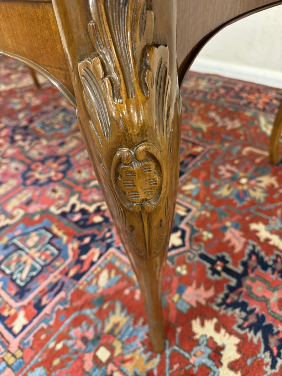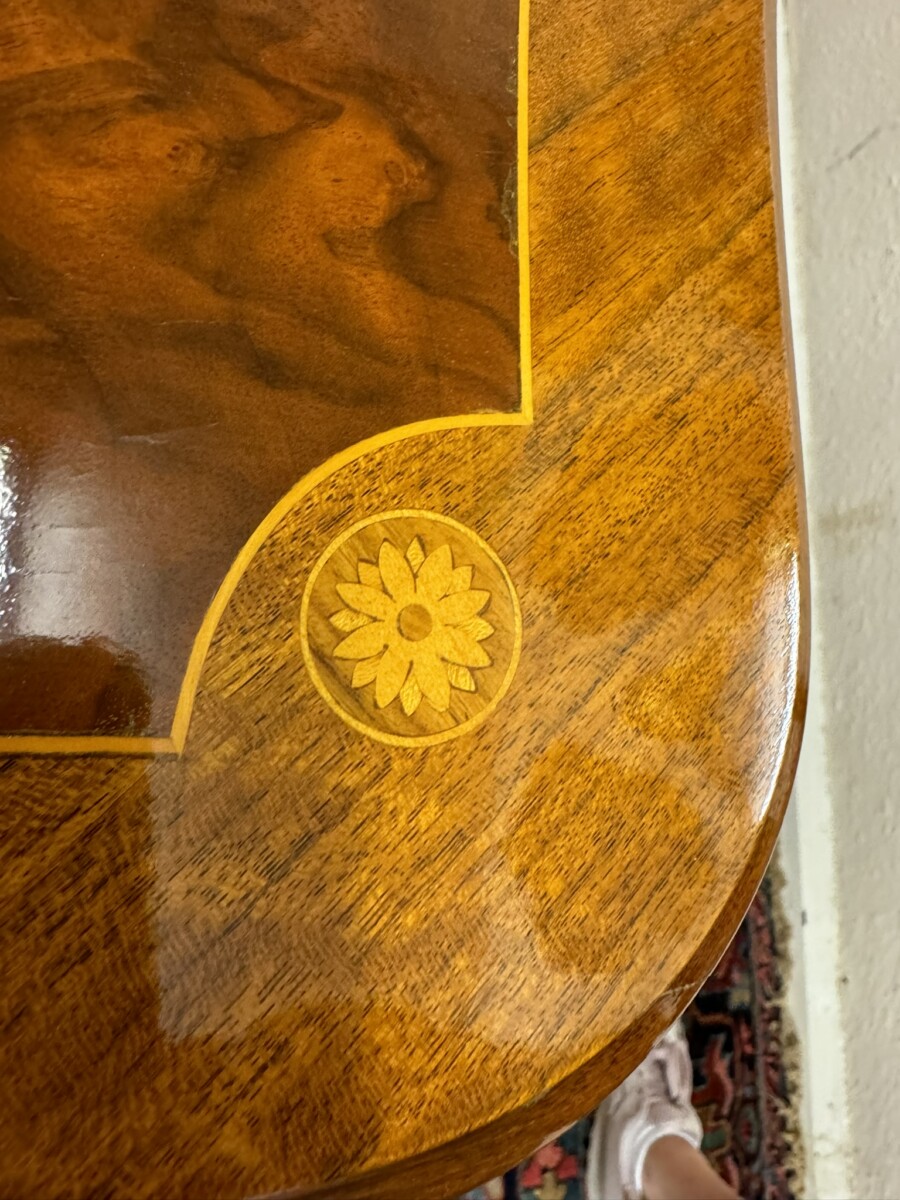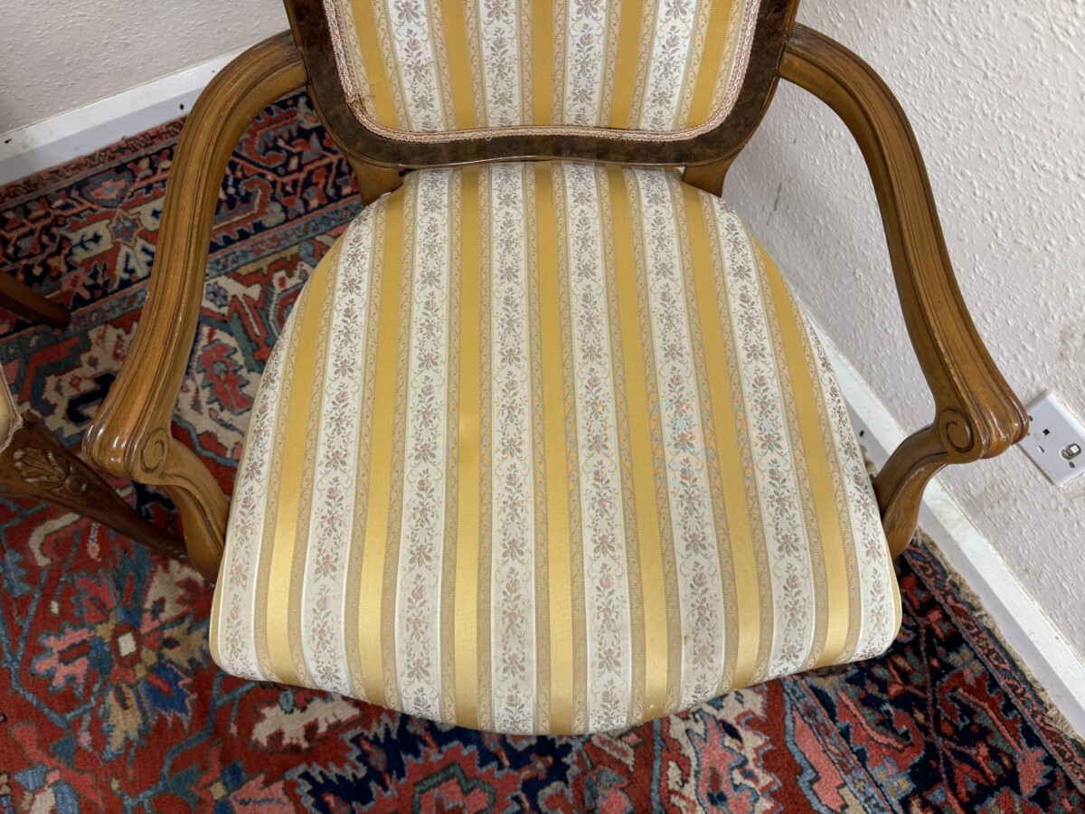 This fabulous quality table and chairs is produced by the renowned H and L Epstein furniture makers of London and dates circa 1950. The fabulous table has curved ends, inlaid decoration and a striking patina. There is a hidden leaf which is stored under the table to extend the tables length. The table stands on four elegant carved cabriole shaped legs. Two carved armchairs and four single chairs all having striking burr walnut edging to the back, upholstered cushioned back rest and seat and standing on four carved cabriole shaped legs to the front. An exceptional quality table and chairs. There are table top protectors.