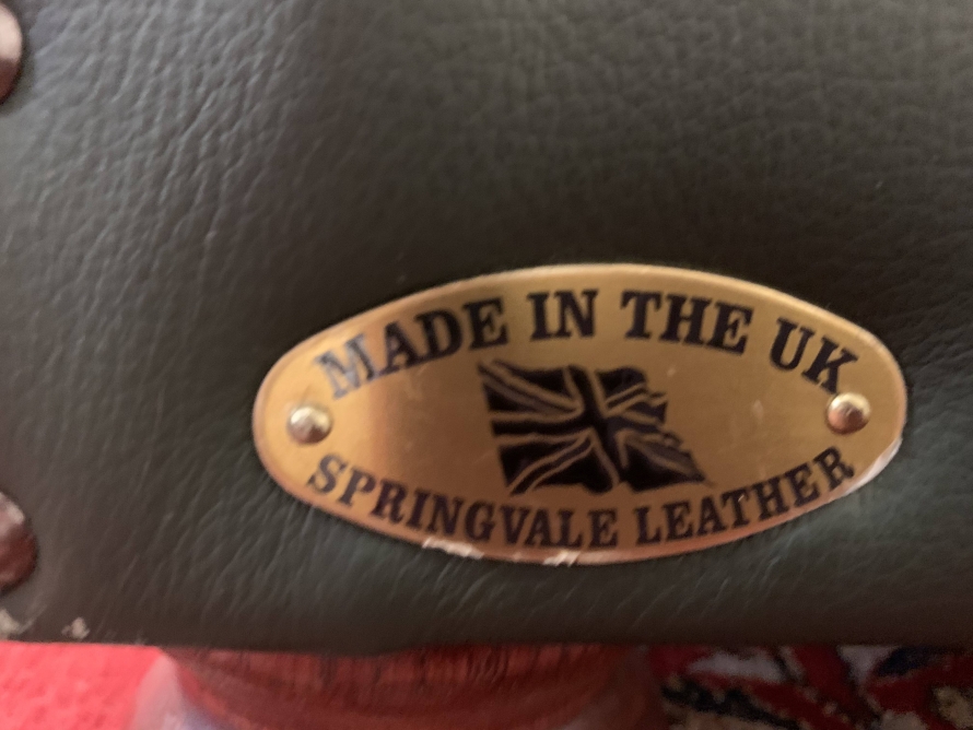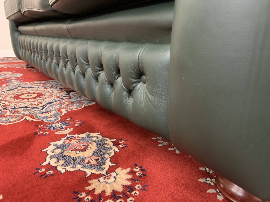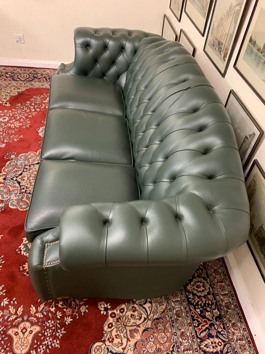 The shaped back and arms are deep buttoned, the arms have studded decoration to the front. three removable cushions, buttoned front and standing on four turned legs. The Chesterfield is made by “Springvale” a quality leather Chesterfield maker.