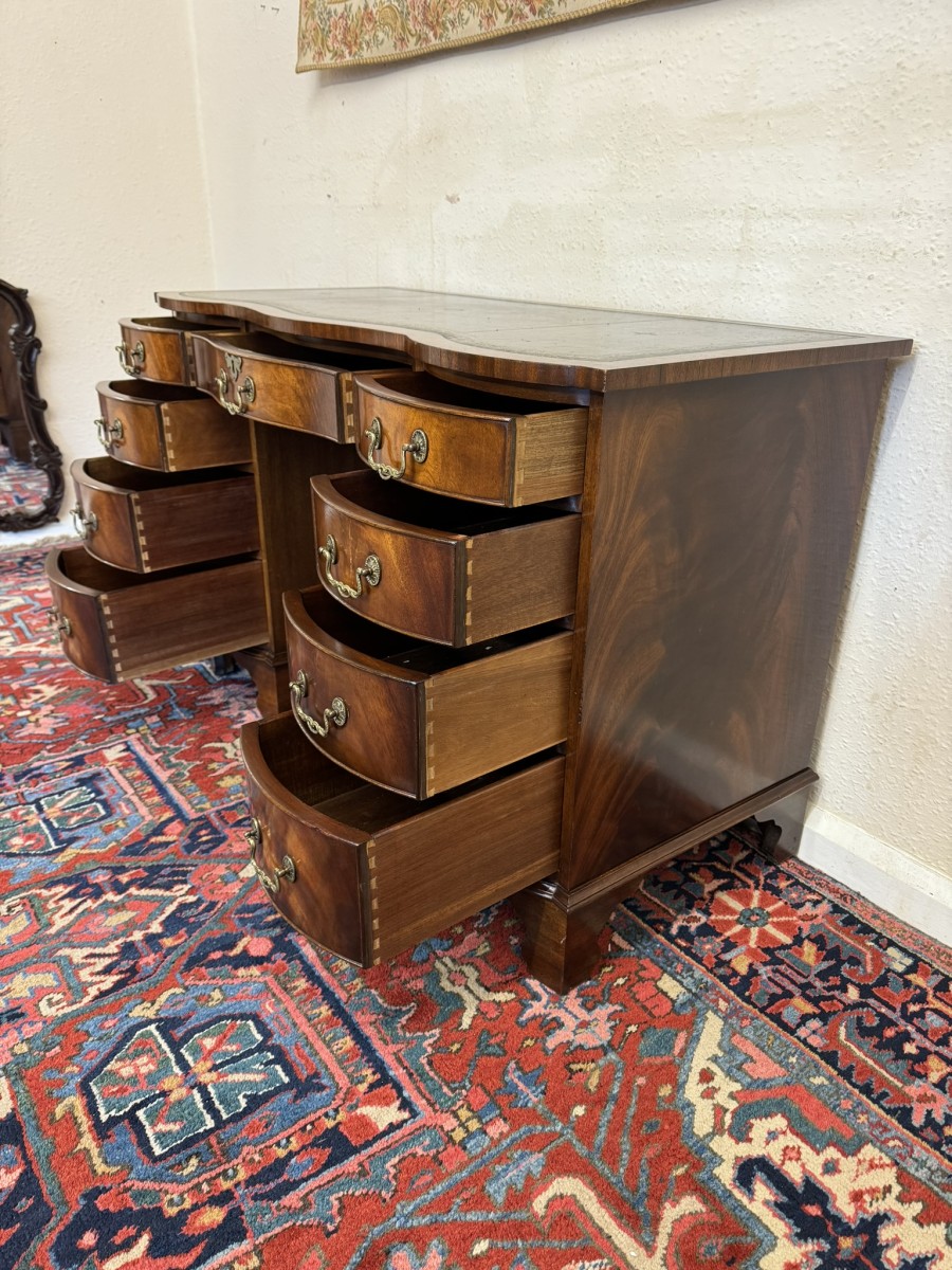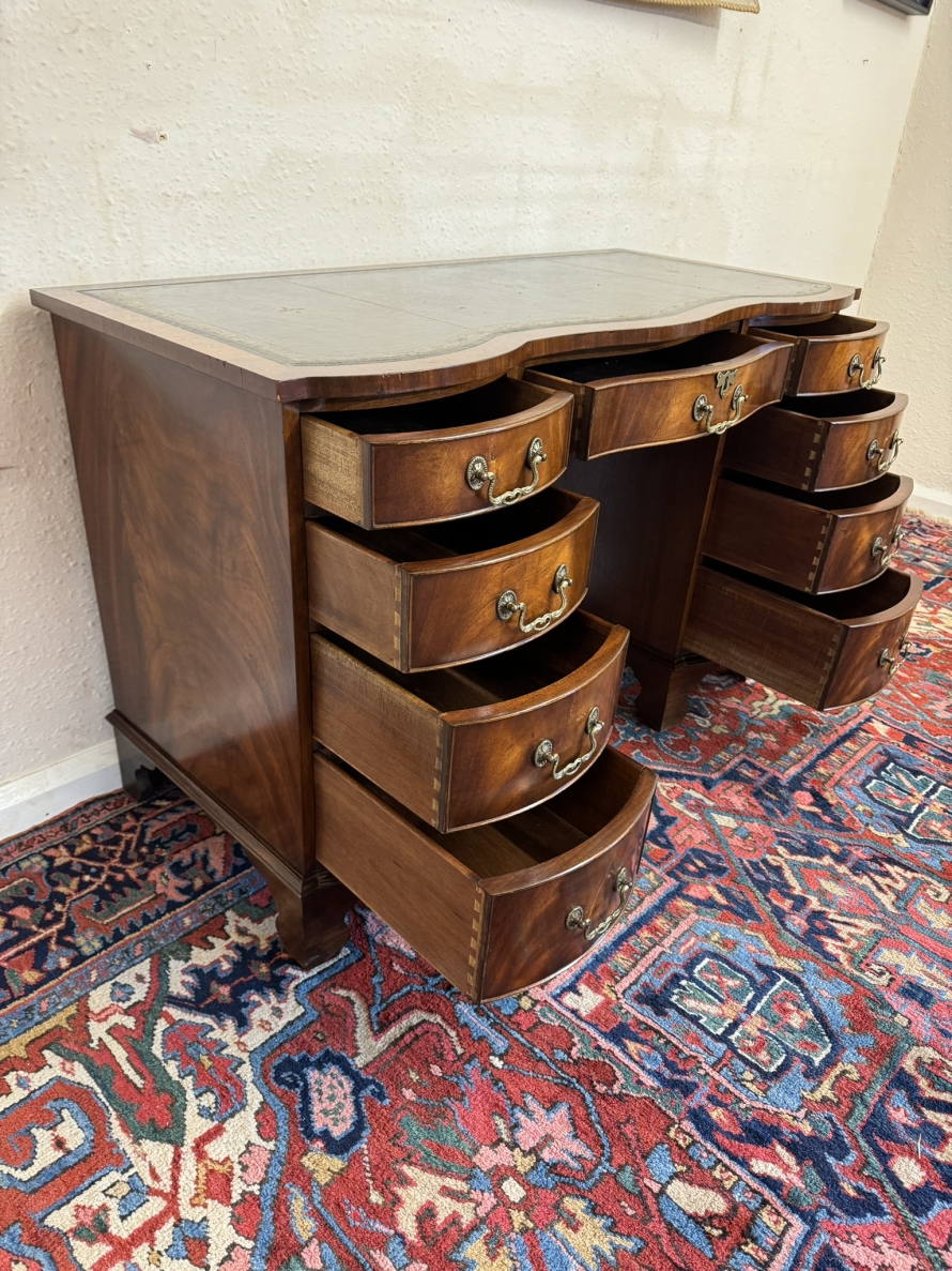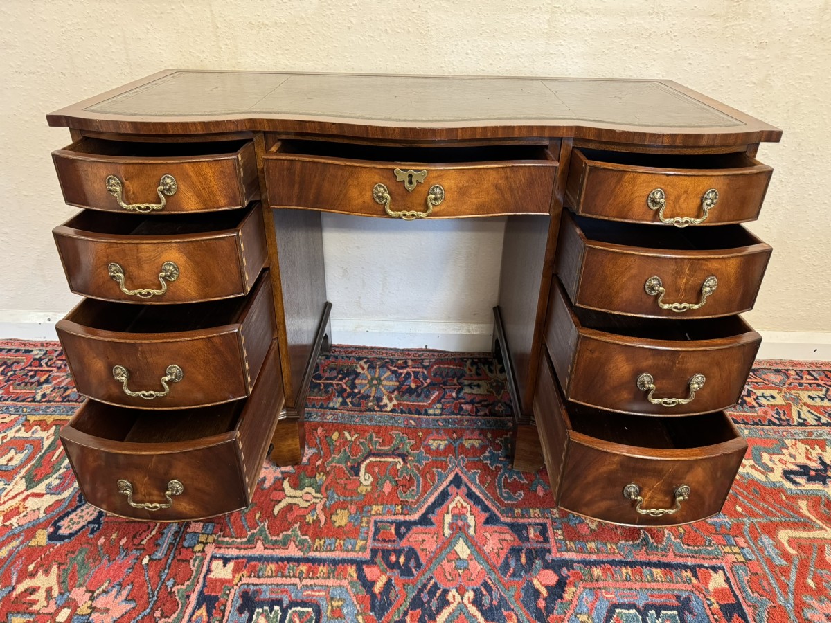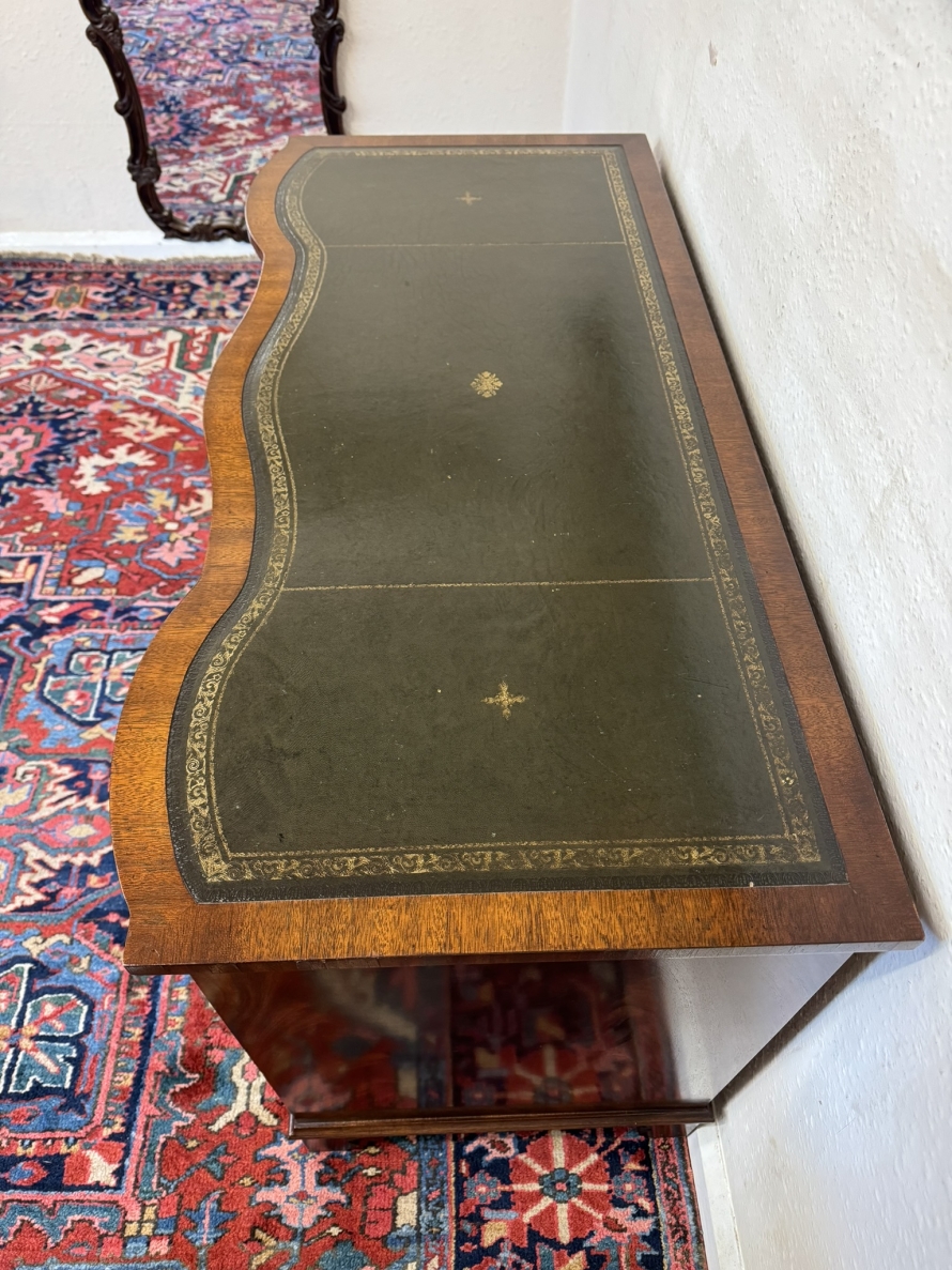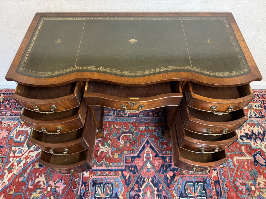 This fabulous quality desk is made by the renowned Bevan Funnell furniture makers. Serpentine shaped desk having antique green leather top. Knee hole central shaped drawer is flanked by four graduated shaped drawers, each drawer having an ornate brass handle. This fine desk stands on eight bracket feet.