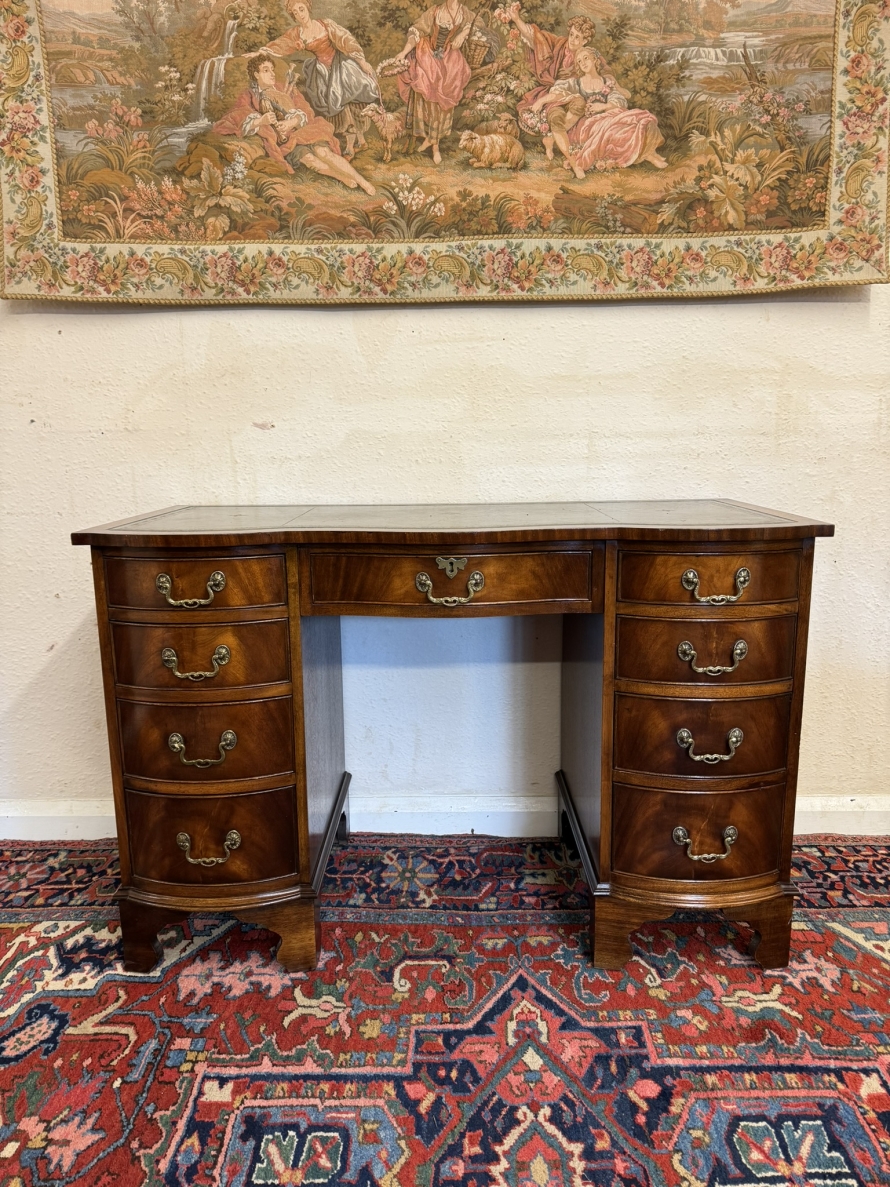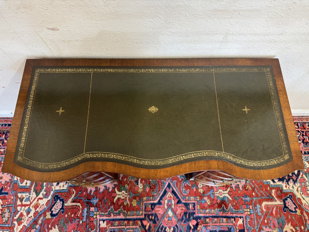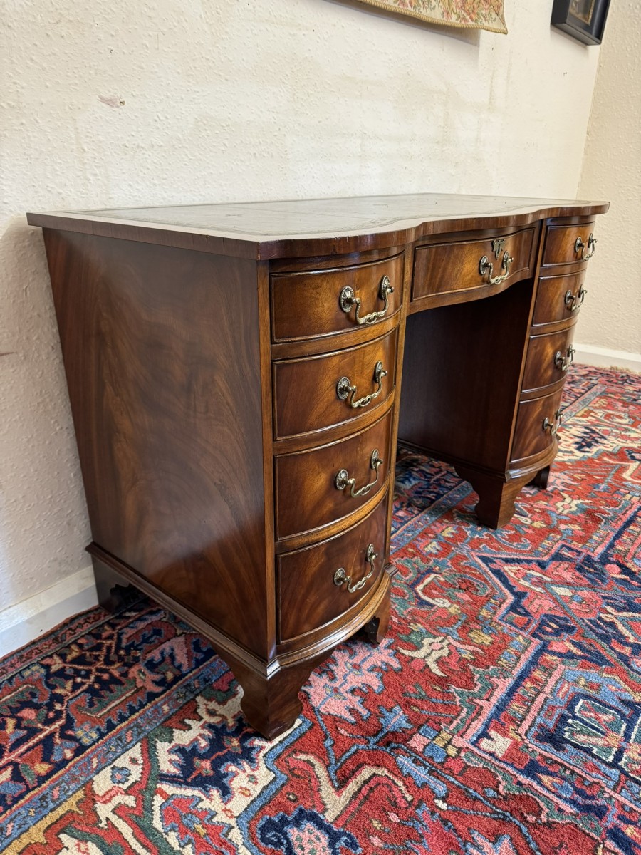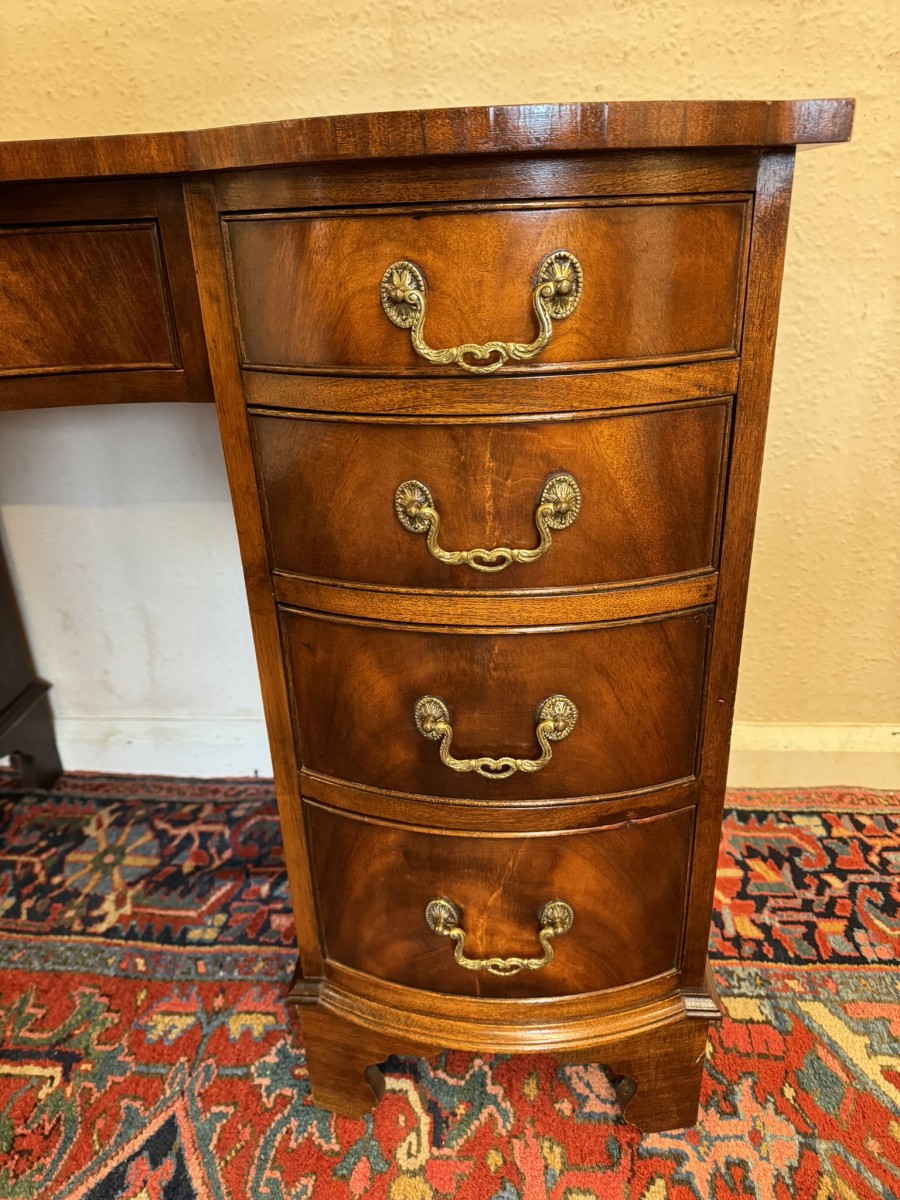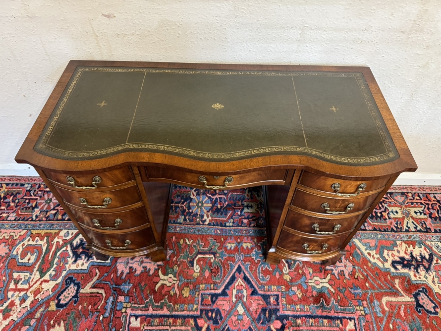 This fabulous quality desk is made by the renowned Bevan Funnell furniture makers. Serpentine shaped desk having antique green leather top. Knee hole central shaped drawer is flanked by four graduated shaped drawers, each drawer having an ornate brass handle. This fine desk stands on eight bracket feet.