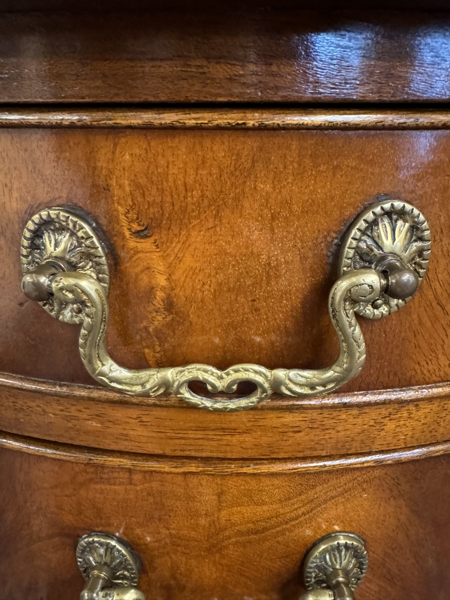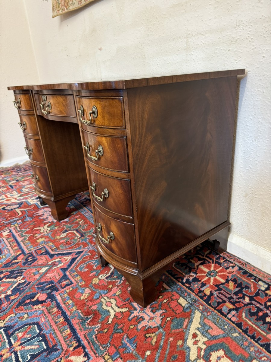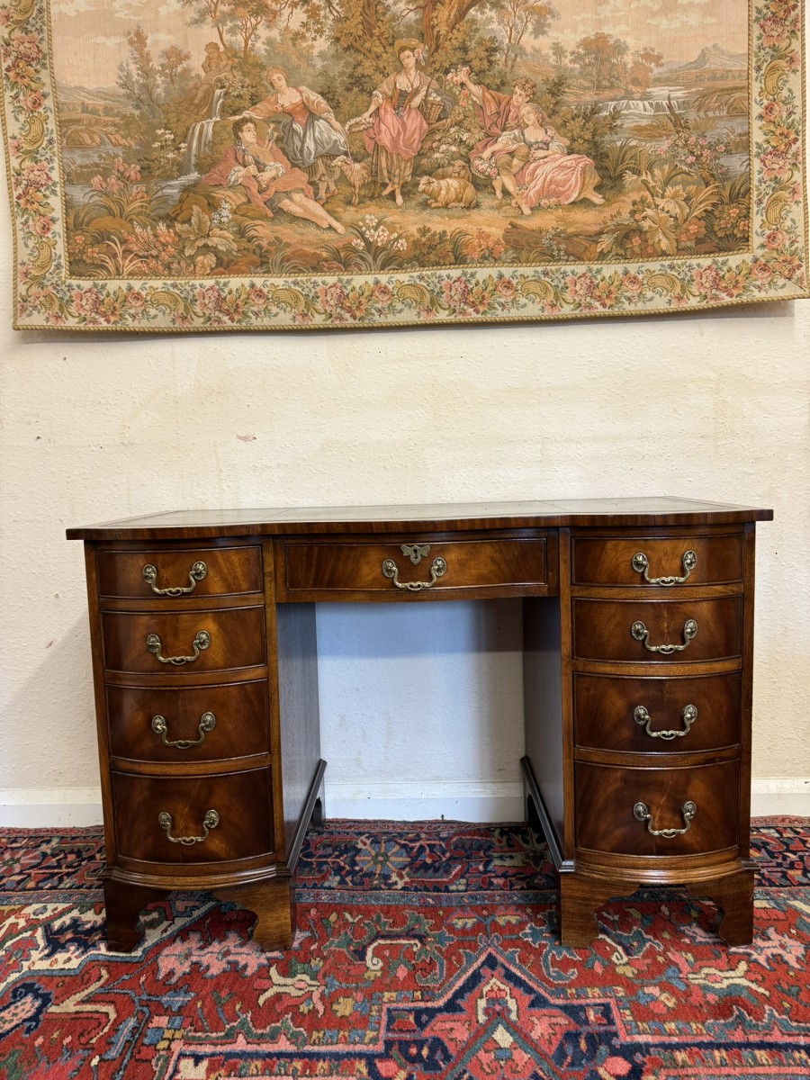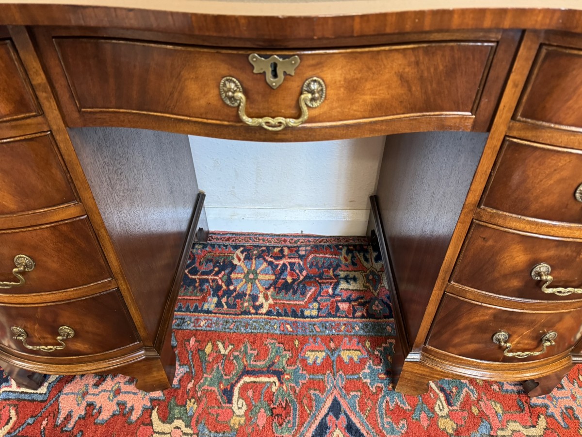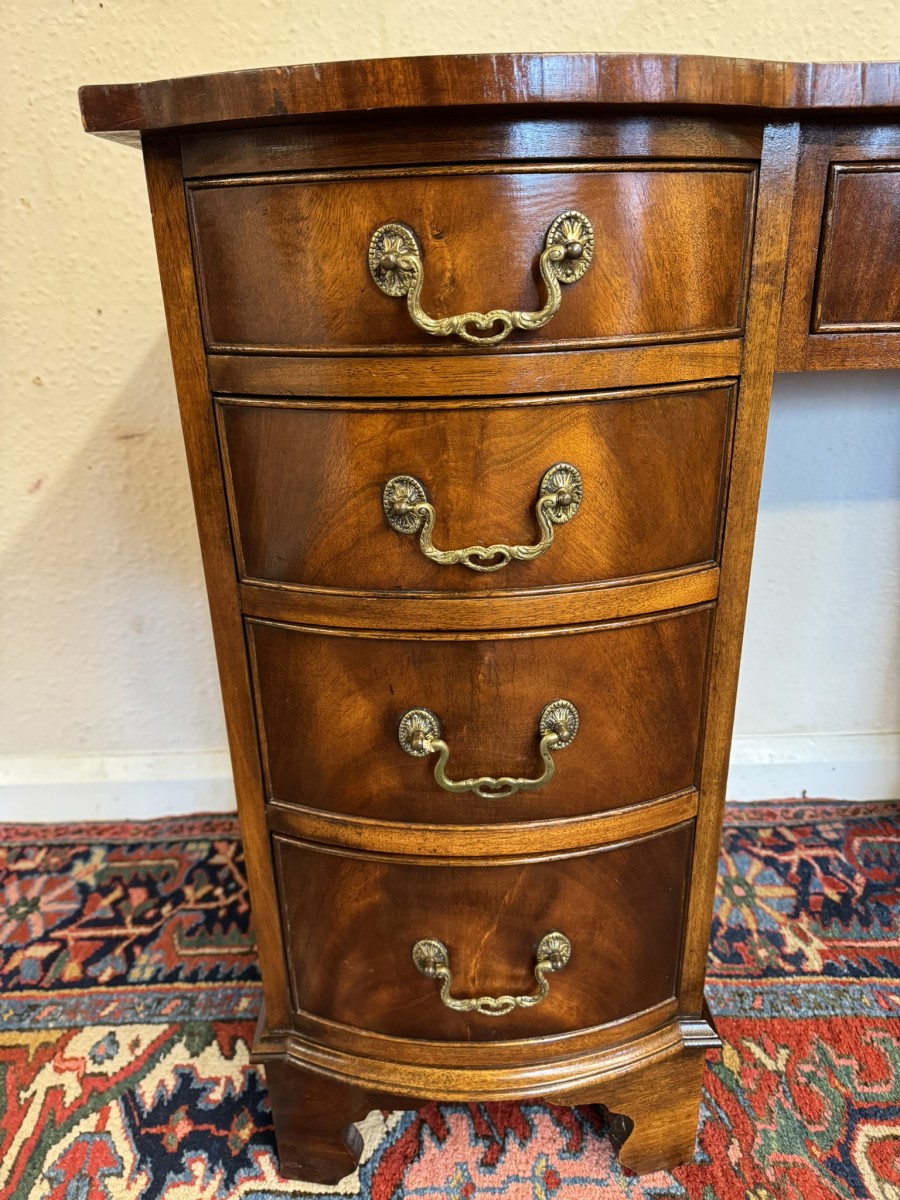 This fabulous quality desk is made by the renowned Bevan Funnell furniture makers. Serpentine shaped desk having antique green leather top. Knee hole central shaped drawer is flanked by four graduated shaped drawers, each drawer having an ornate brass handle. This fine desk stands on eight bracket feet.