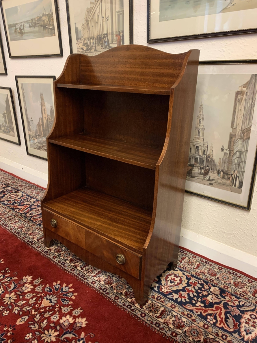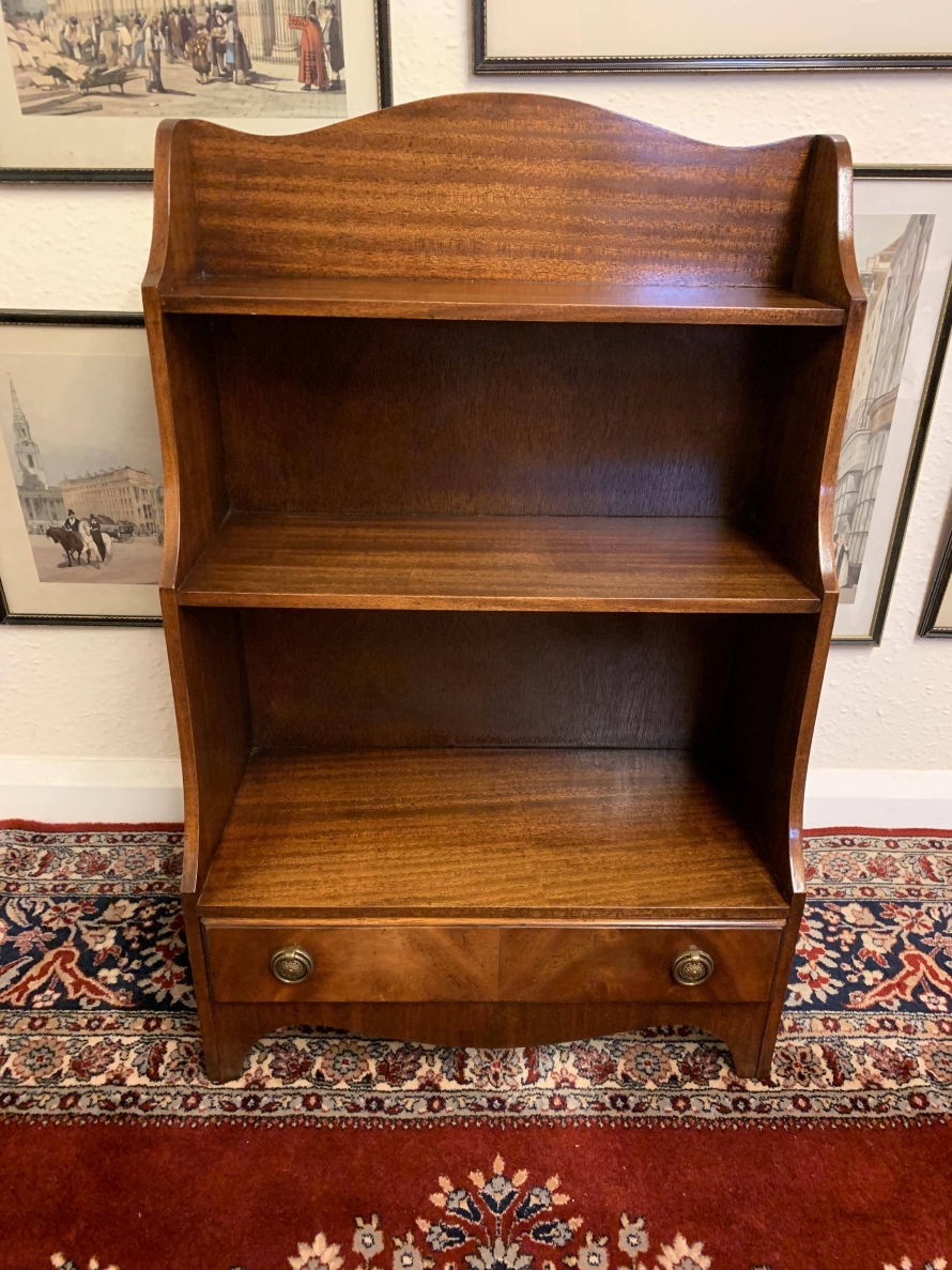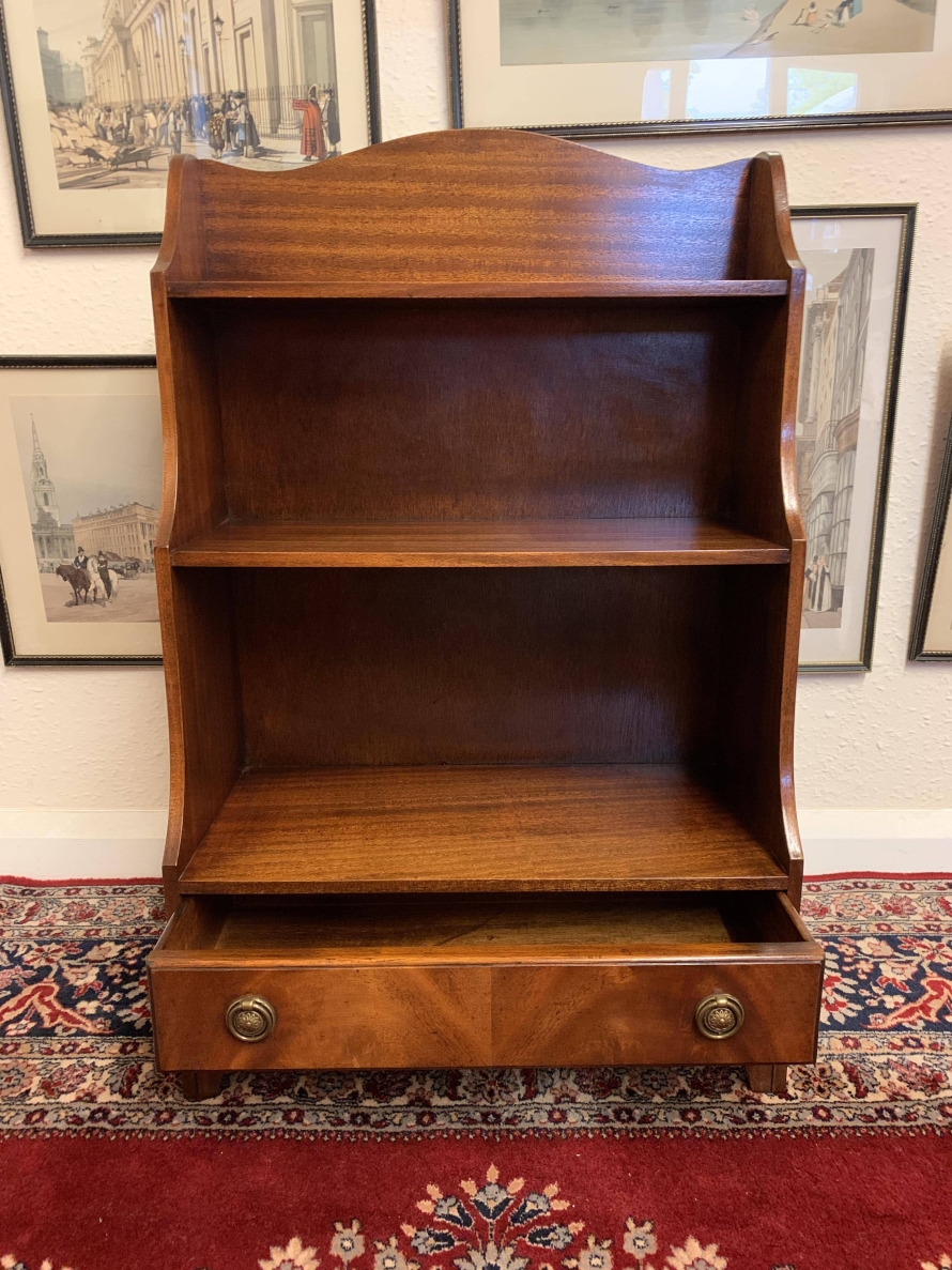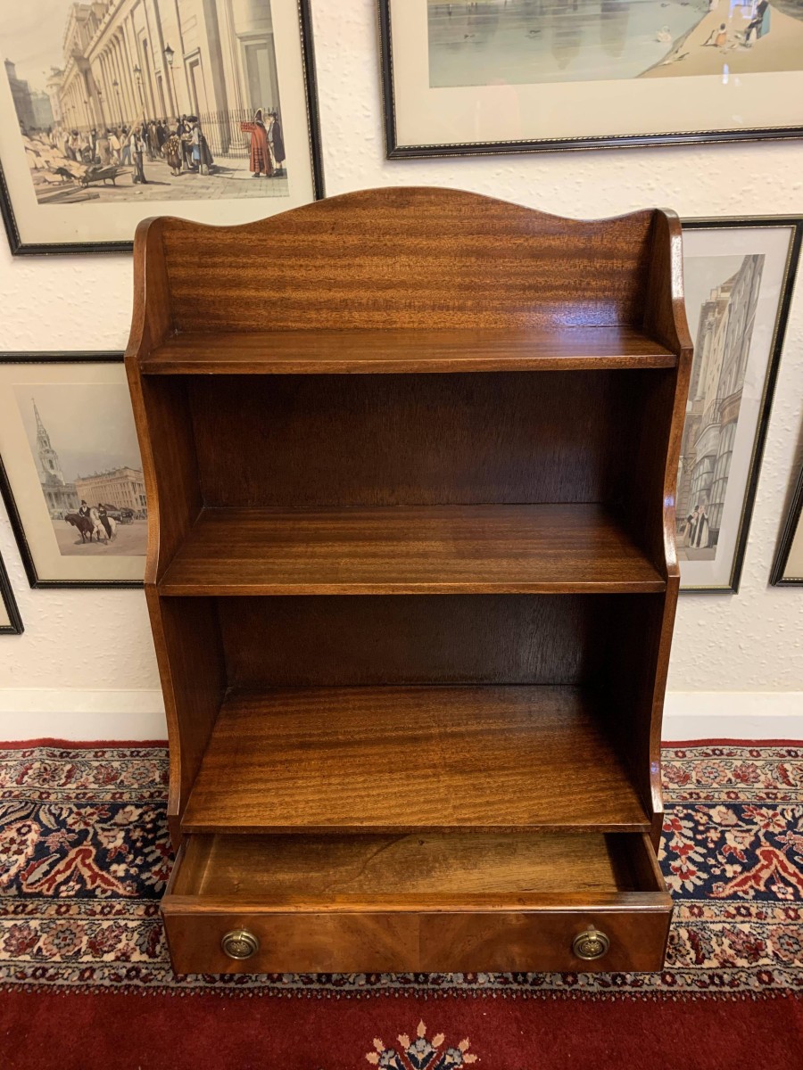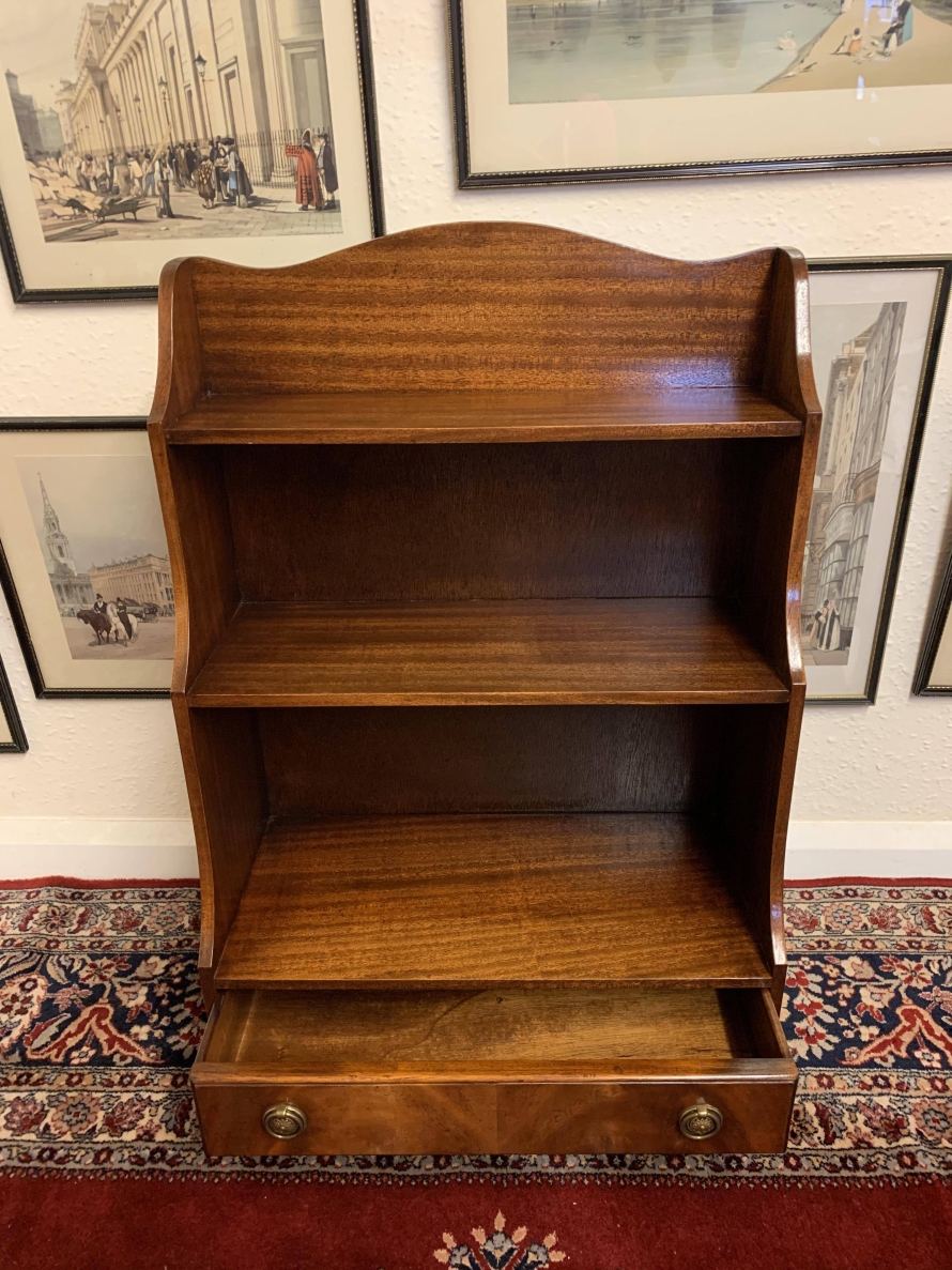 A beautiful neat sized mahogany waterfall bookcase produced by the renowned “Bevan Funnell” furniture makers and is in excellent condition. Consisting of three shelves with a drawer below. The bookcase has a waterfall shaped front.