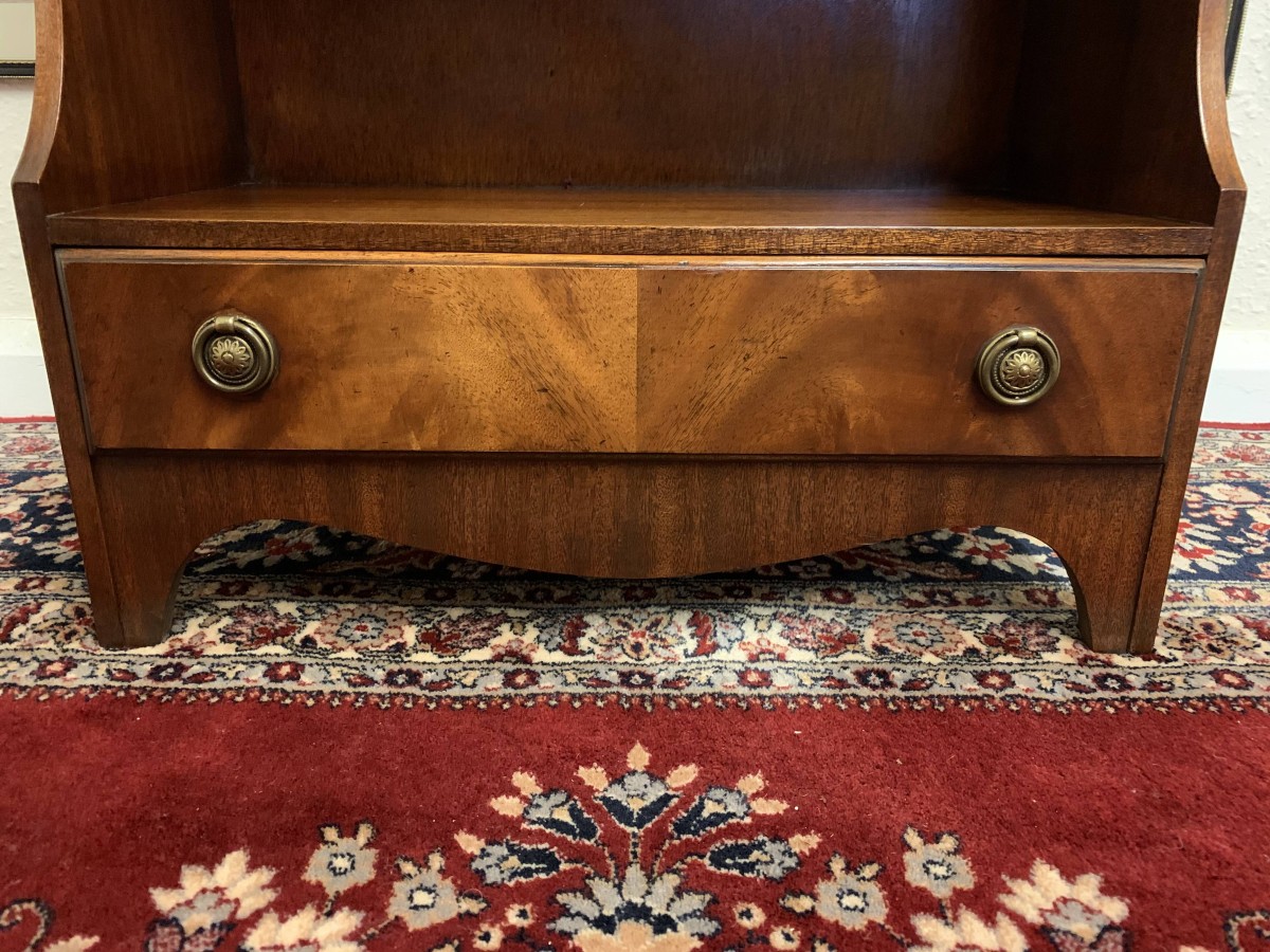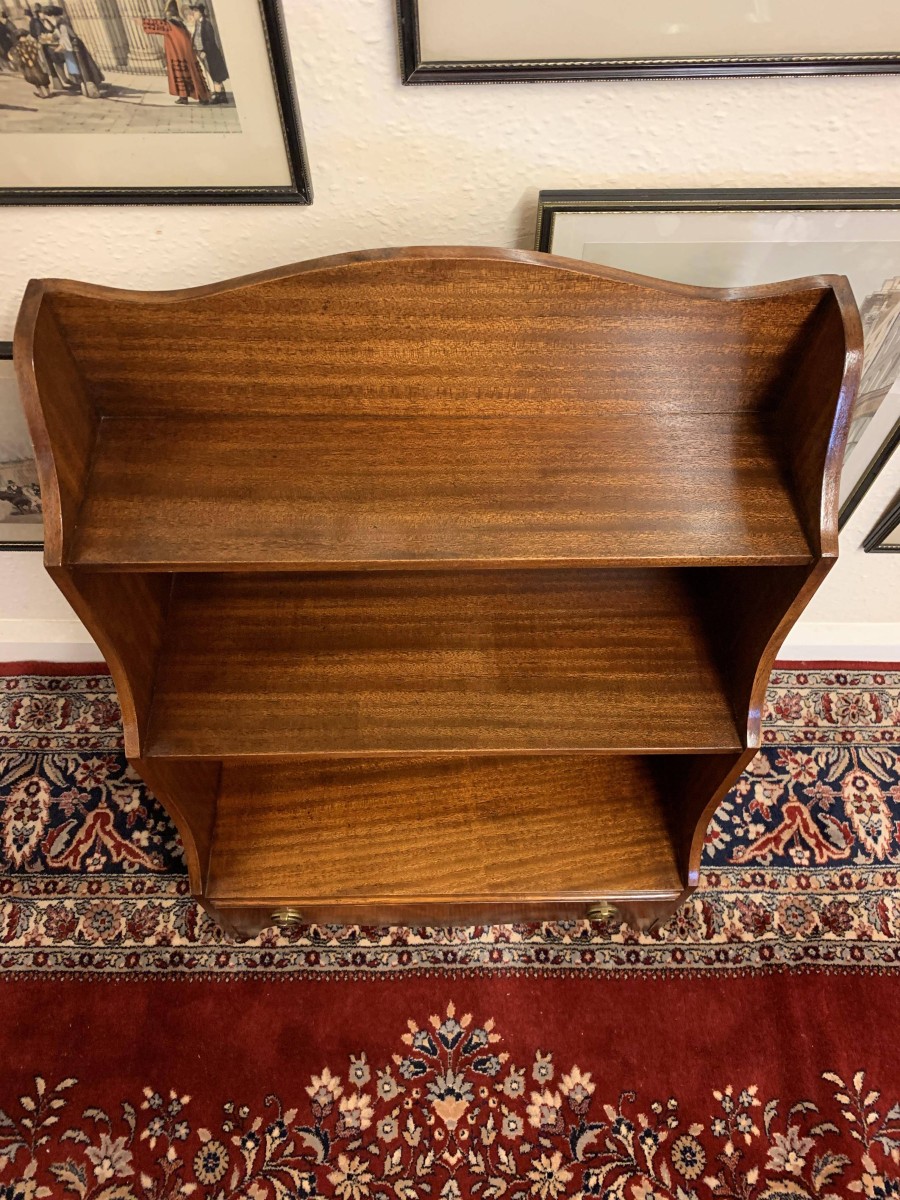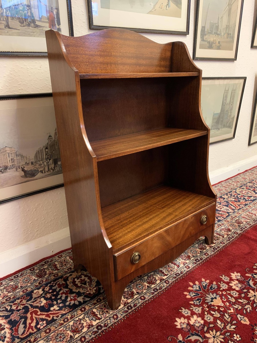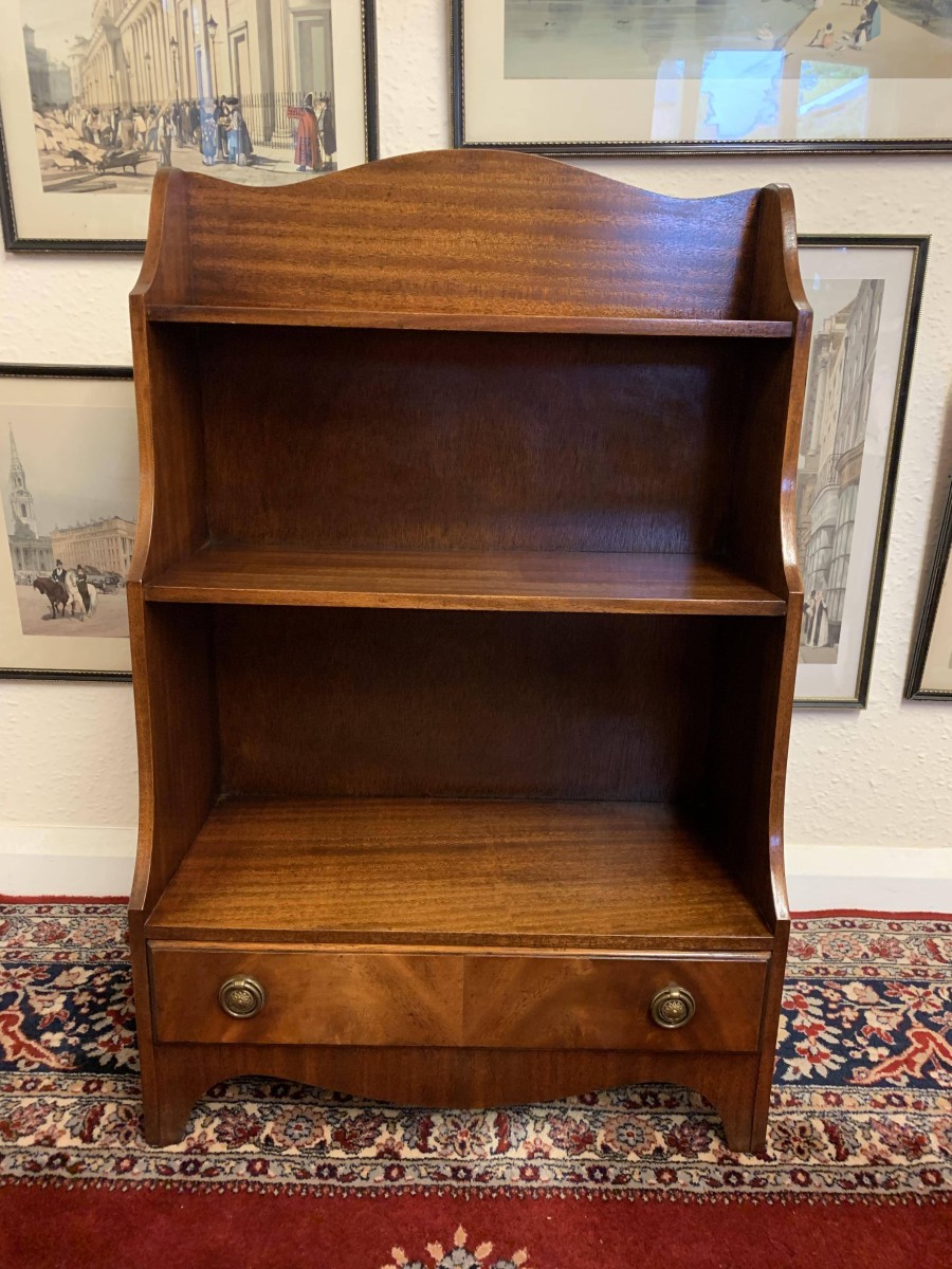 A beautiful neat sized mahogany waterfall bookcase produced by the renowned “Bevan Funnell” furniture makers and is in excellent condition. Consisting of three shelves with a drawer below. The bookcase has a waterfall shaped front.
