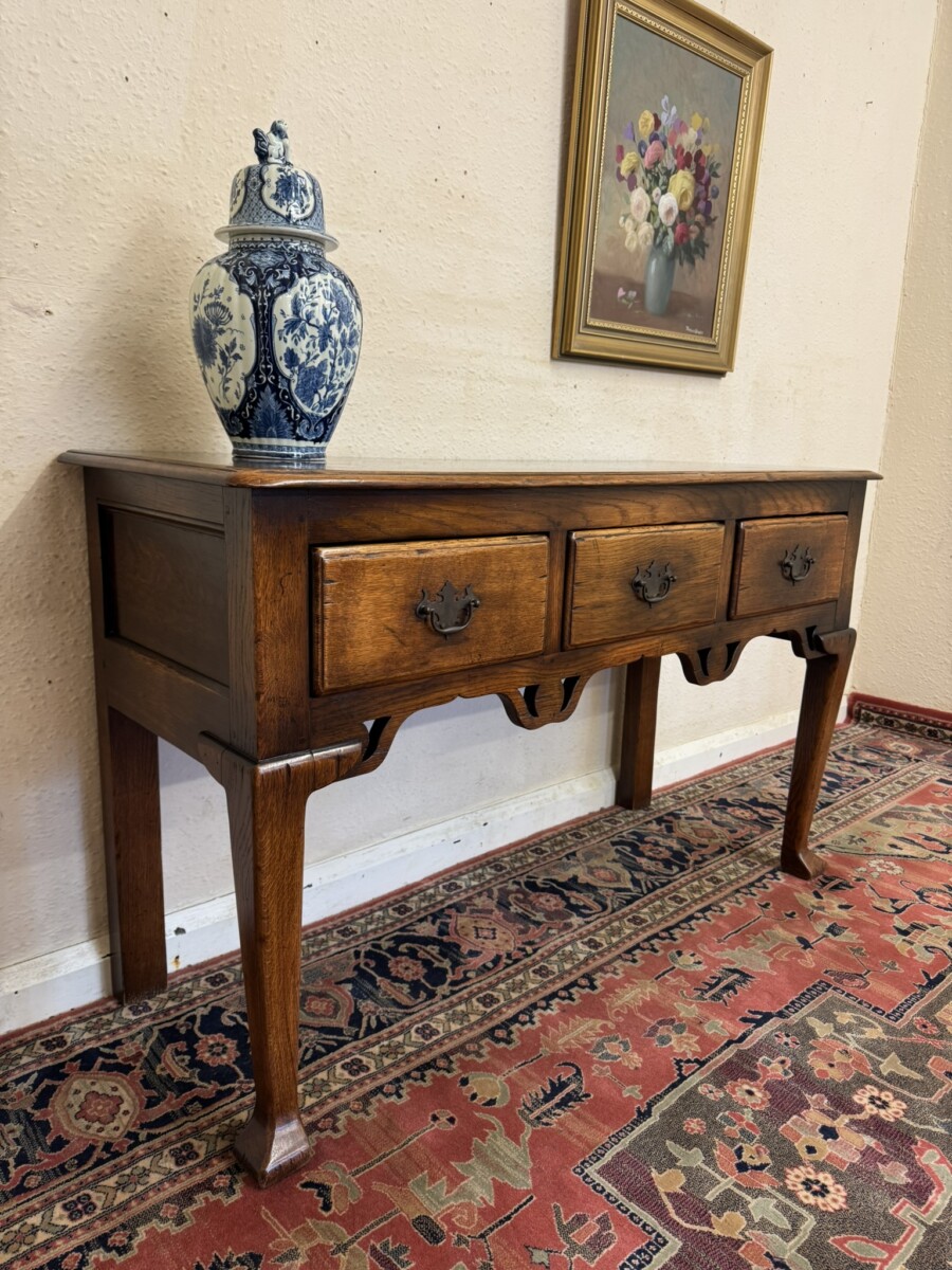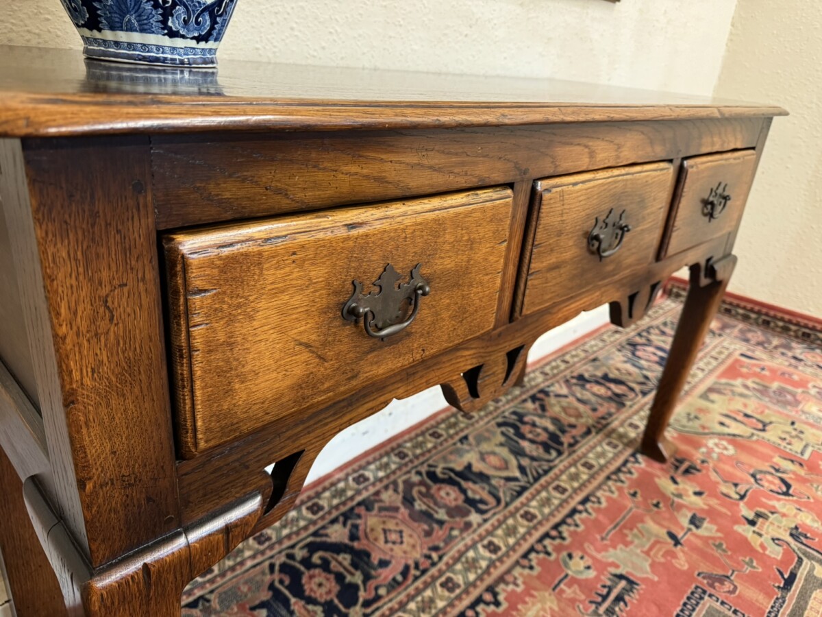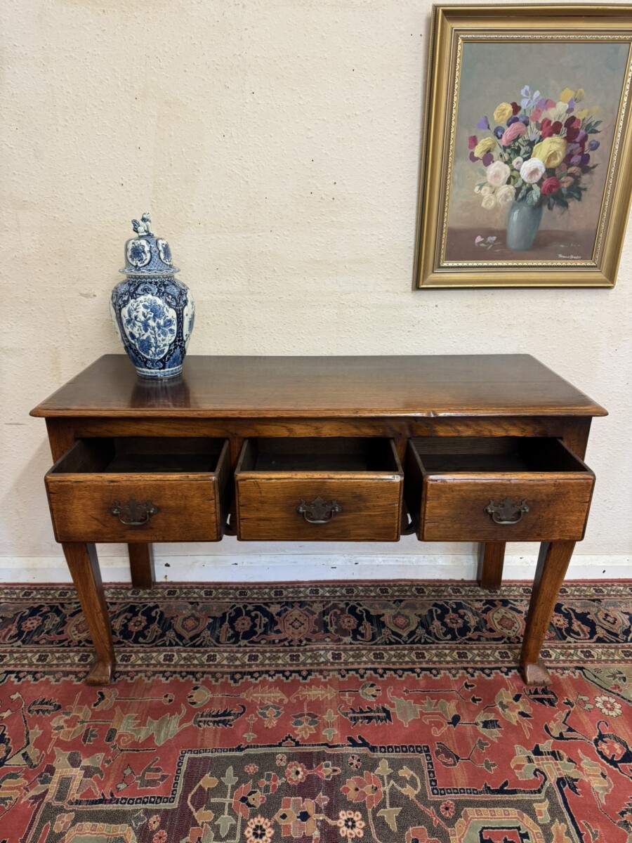 This fabulous console made entirely in solid oak is in excellent condition. The over sailing top sits above three drawers, each drawer having a brass handle. Recessed panelled sides carved apron and standing on two tapered legs to the front with a pad feet.