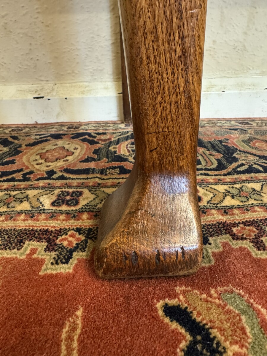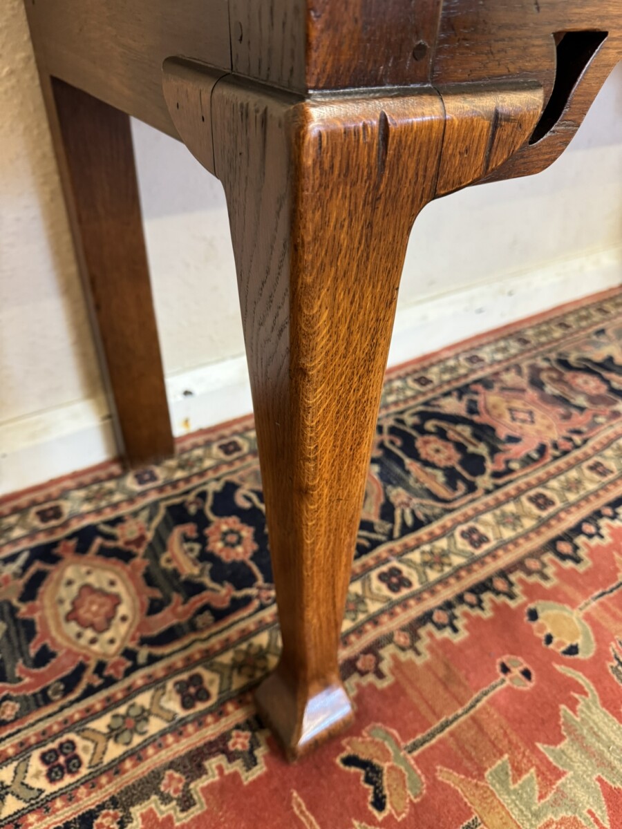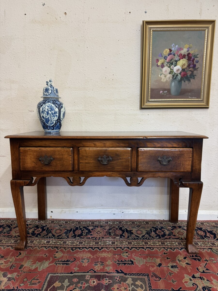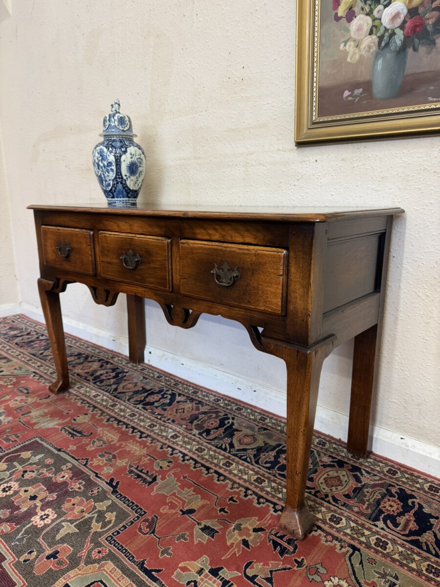 This fabulous console made entirely in solid oak is in excellent condition. The over sailing top sits above three drawers, each drawer having a brass handle. Recessed panelled sides carved apron and standing on two tapered legs to the front with a pad feet.
