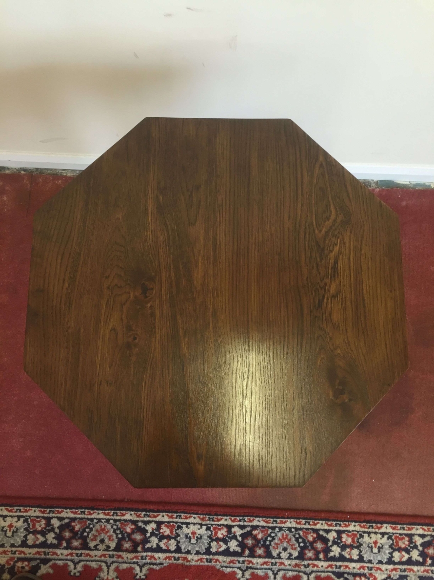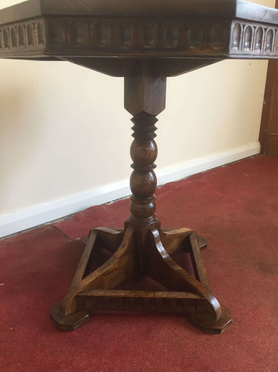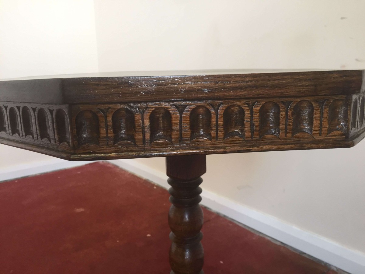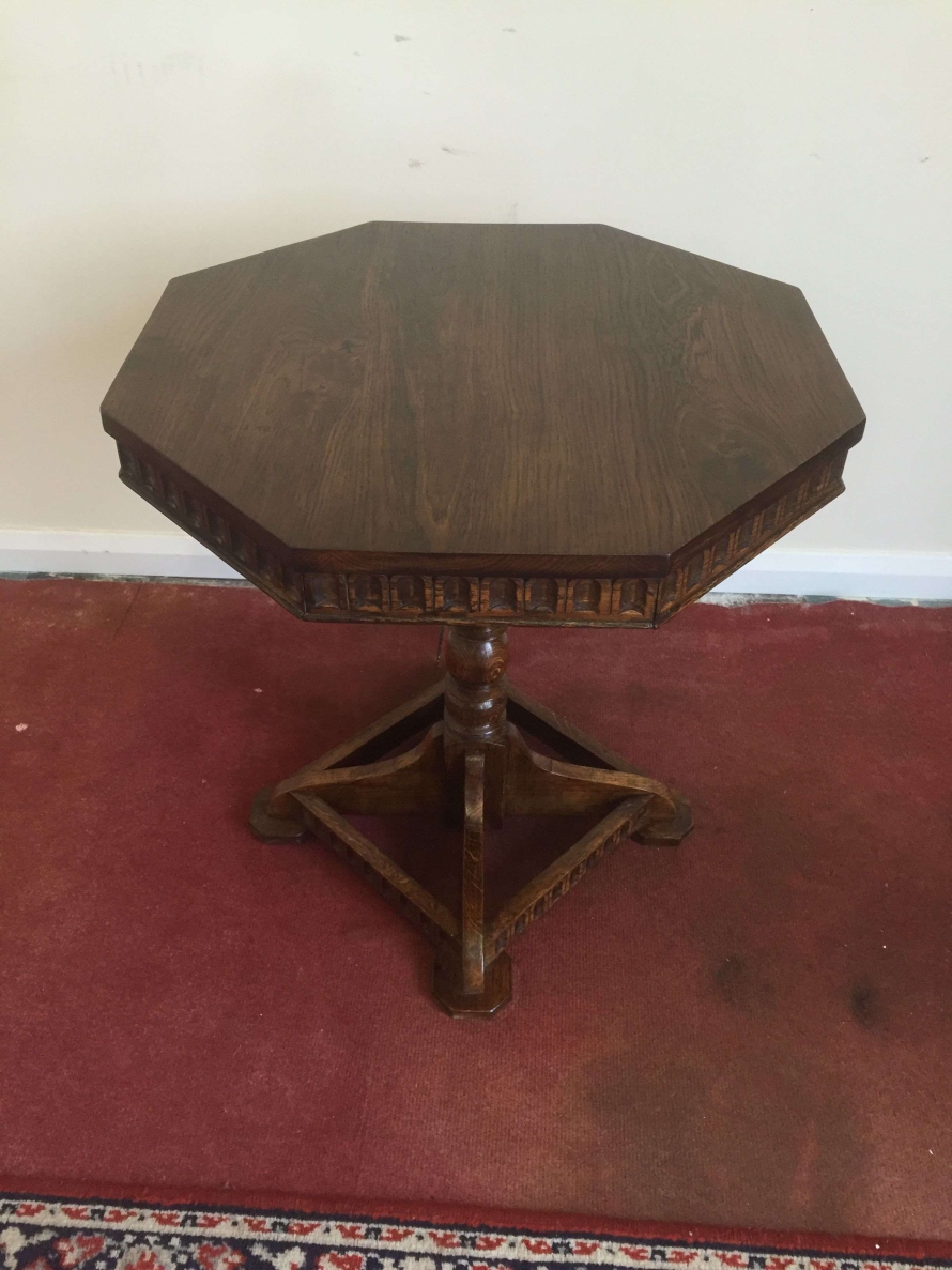 Great quality oak occasional table, octagonal top, carved frieze, turned pedestal, octagonal feet.