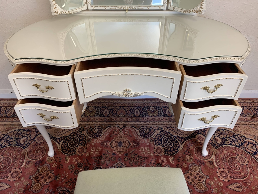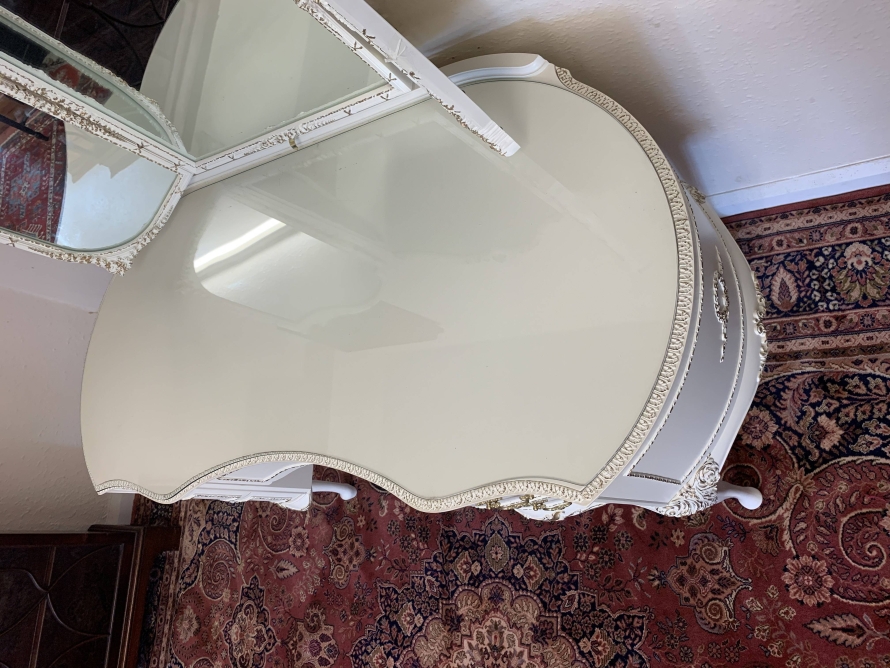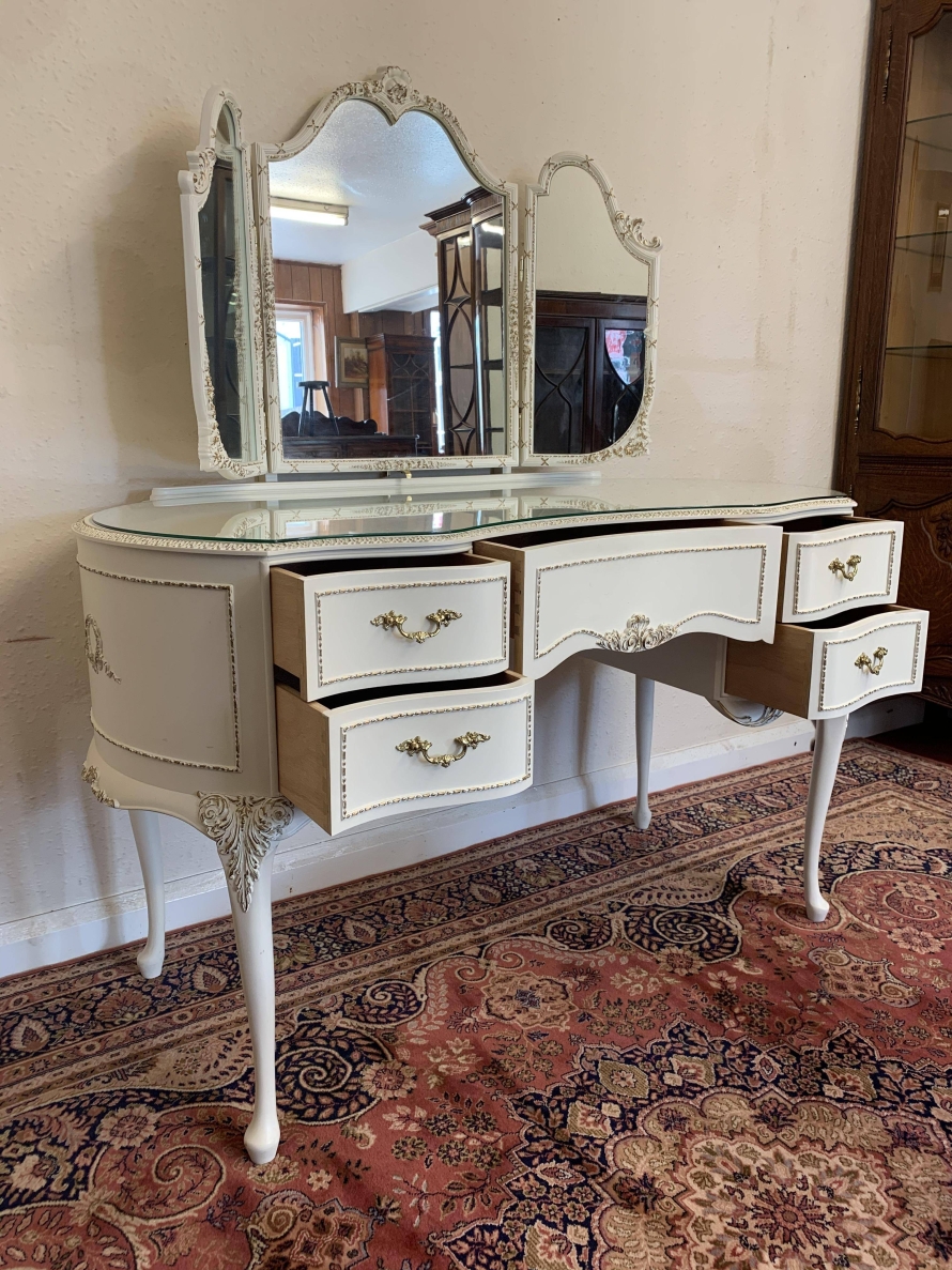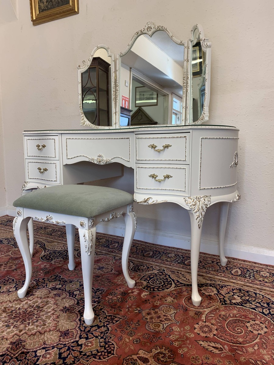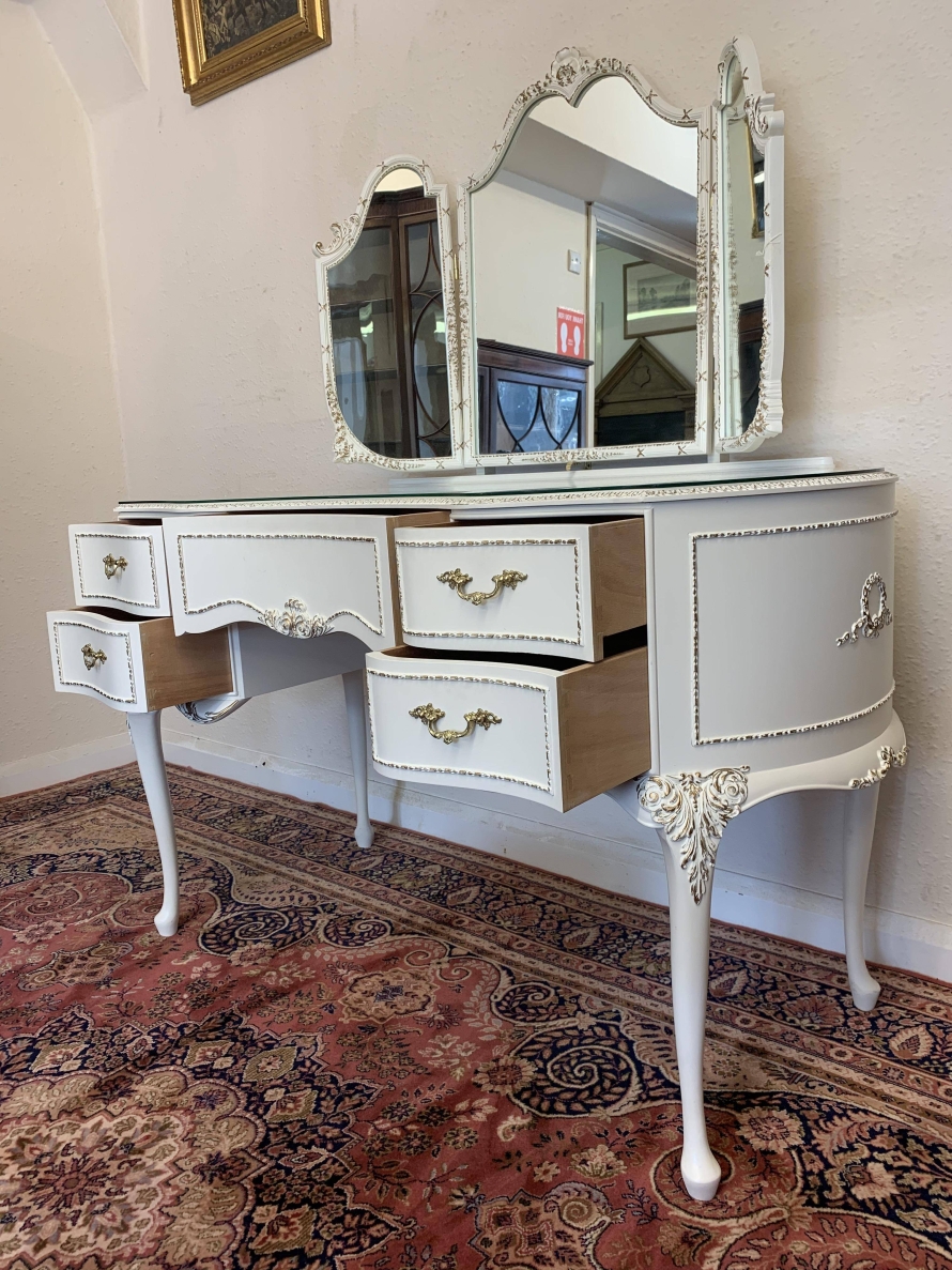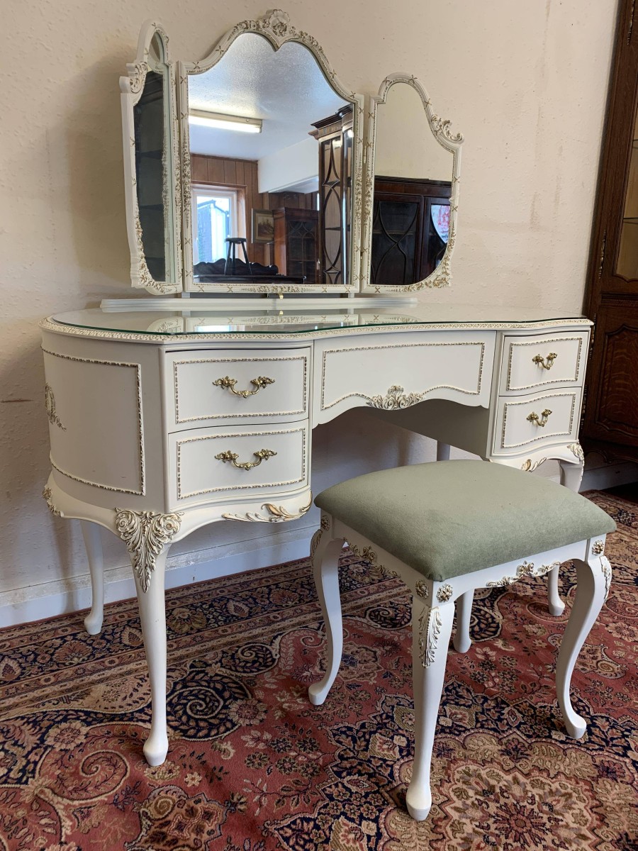 This kidney shaped dressing table and stool is in excellent condition and made by the renowned Olympus Furniture Company. The fixed central decorated mirror is flanked by a pair of adjustable decorated swing mirrors. The kidney shaped dressing table has a shaped glass protector. A central knee hole drawer which is flanked by a pair of shaped drawers, each drawer having decorative brass handle. Shaped decorated sides, decorated shaped skirt, this quality dressing table stands on four shaped cabriole legs. There is also a matching stool which can be placed under the knee hole central drawer. We are also listing a matching pair of bedside cabinets and a chest of drawers.