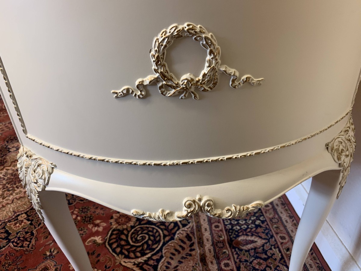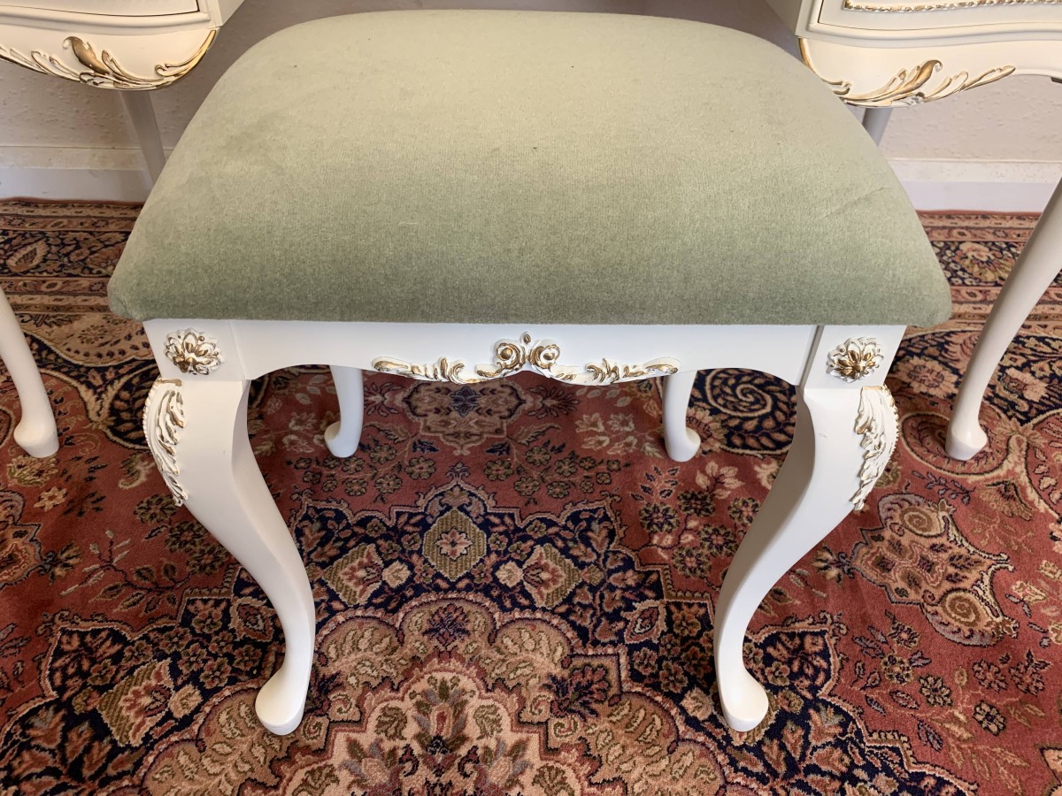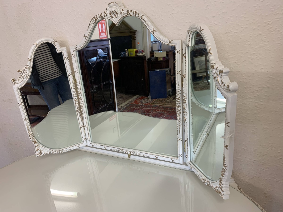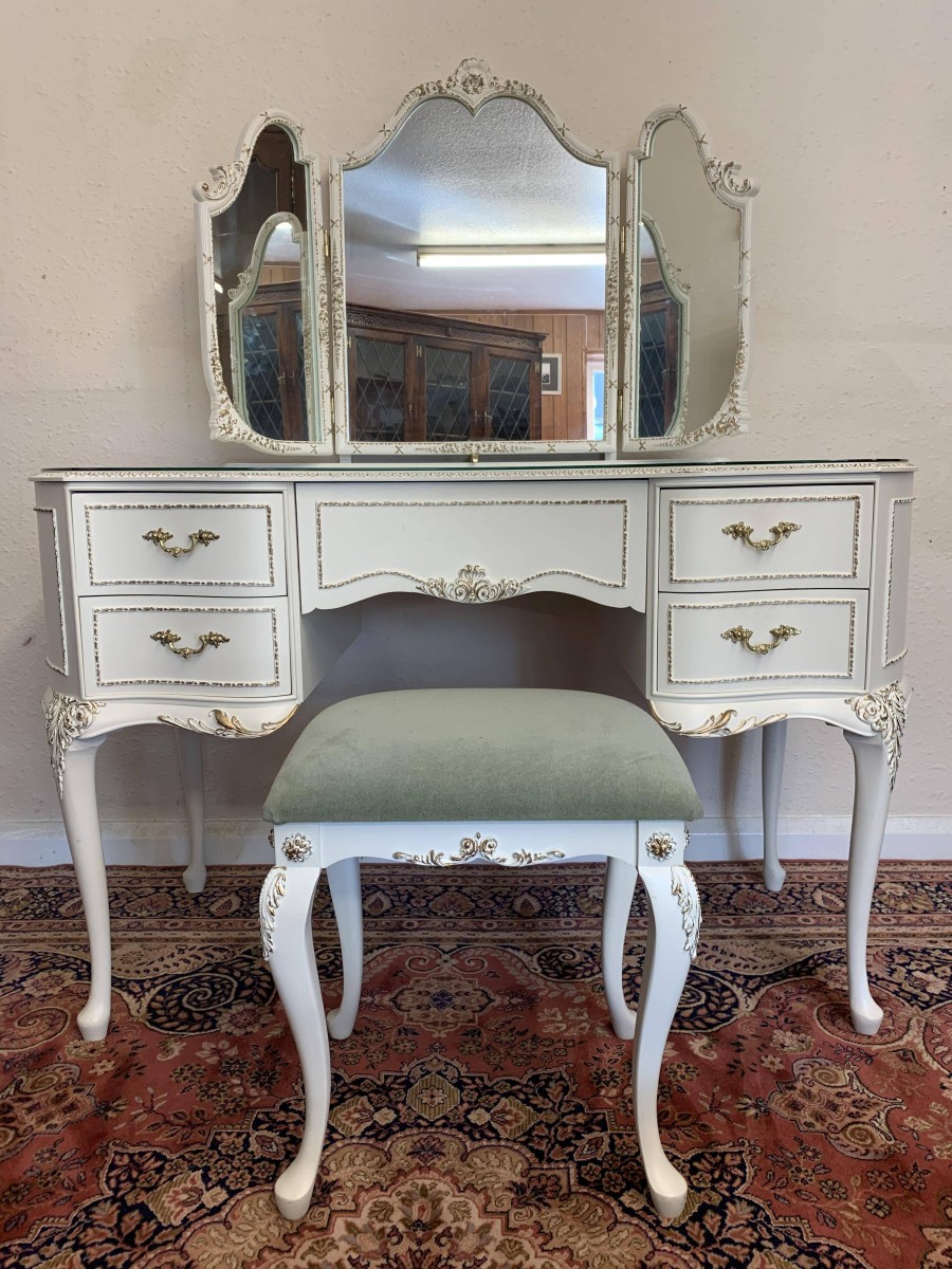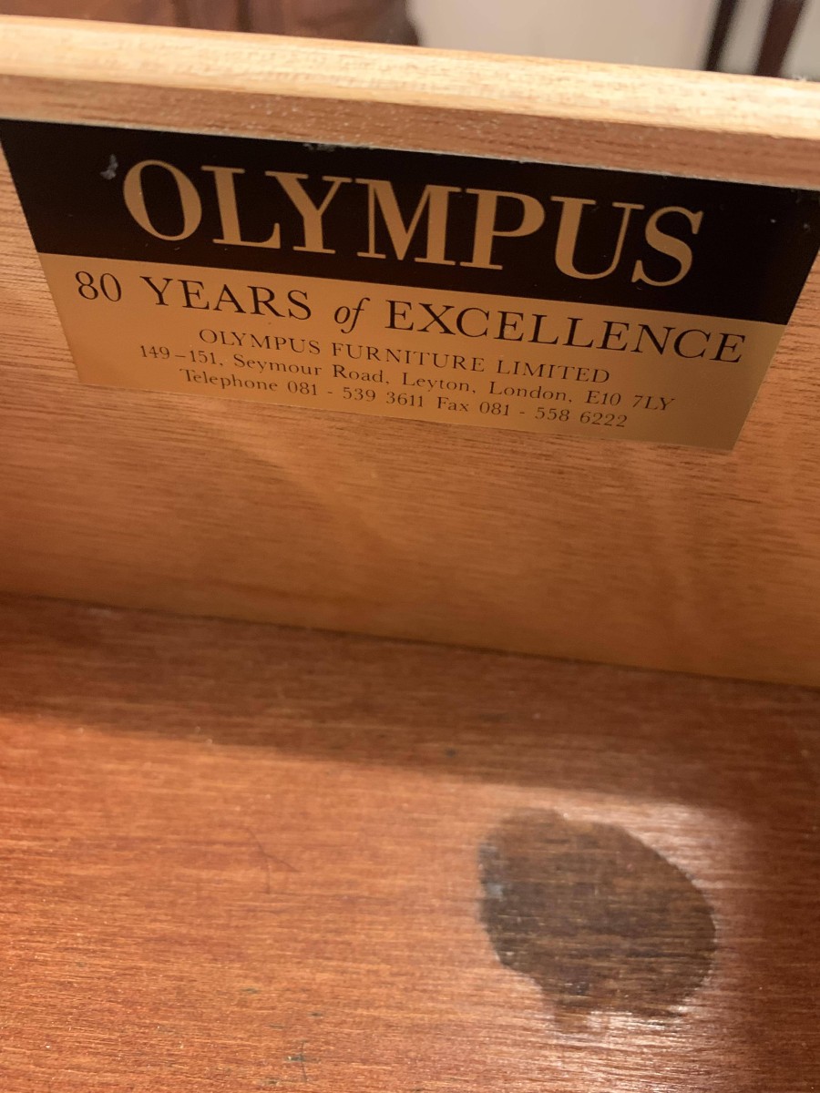 This kidney shaped dressing table and stool is in excellent condition and made by the renowned Olympus Furniture Company. The fixed central decorated mirror is flanked by a pair of adjustable decorated swing mirrors. The kidney shaped dressing table has a shaped glass protector. A central knee hole drawer which is flanked by a pair of shaped drawers, each drawer having decorative brass handle. Shaped decorated sides, decorated shaped skirt, this quality dressing table stands on four shaped cabriole legs. There is also a matching stool which can be placed under the knee hole central drawer. We are also listing a matching pair of bedside cabinets and a chest of drawers.