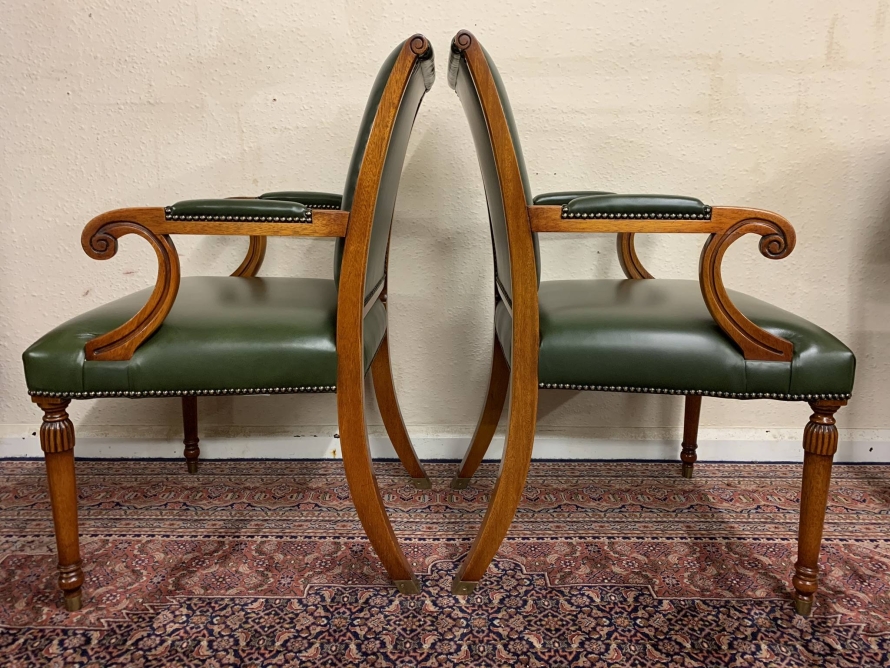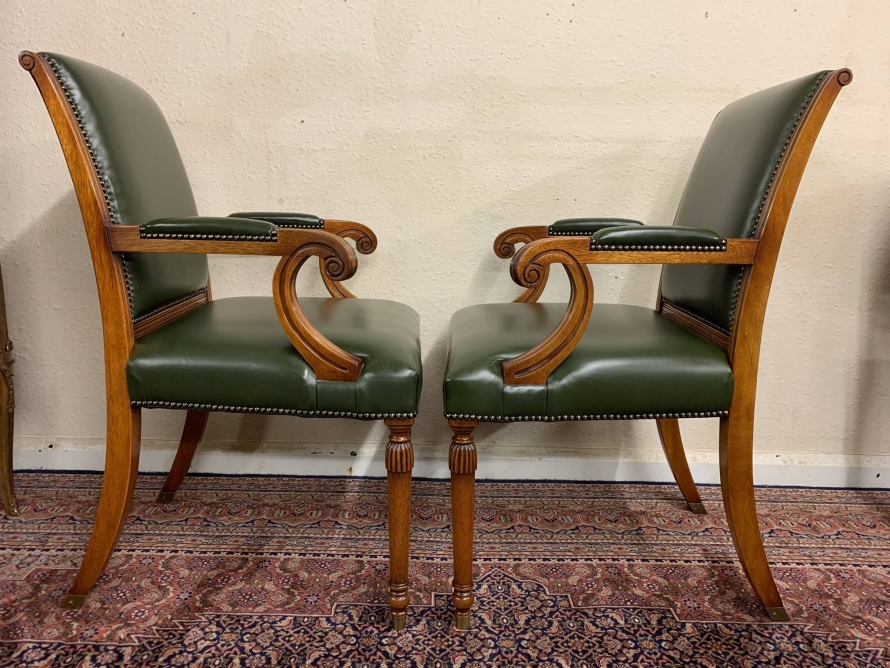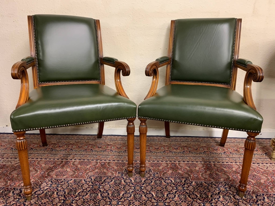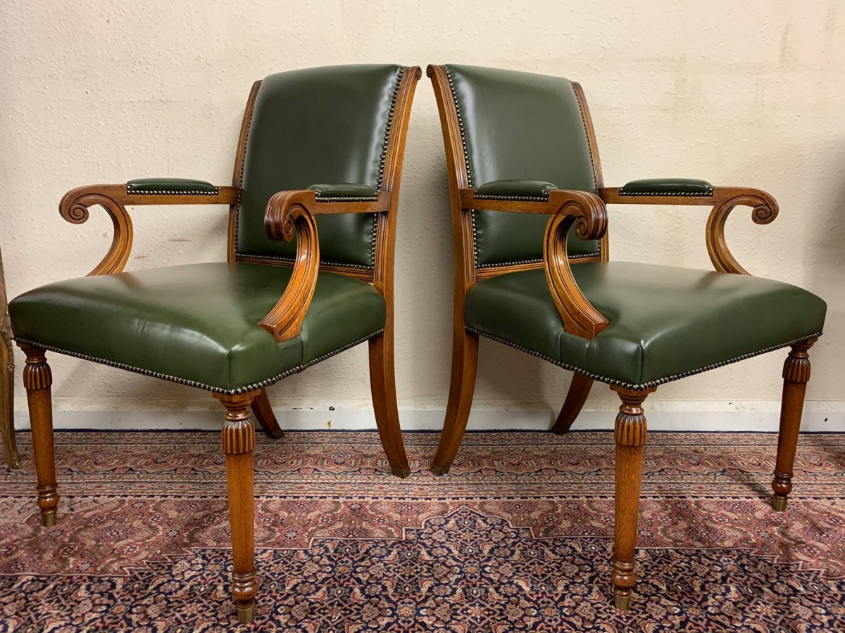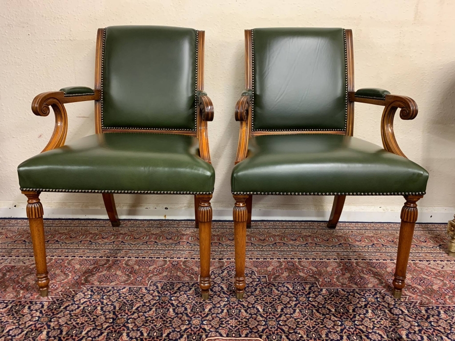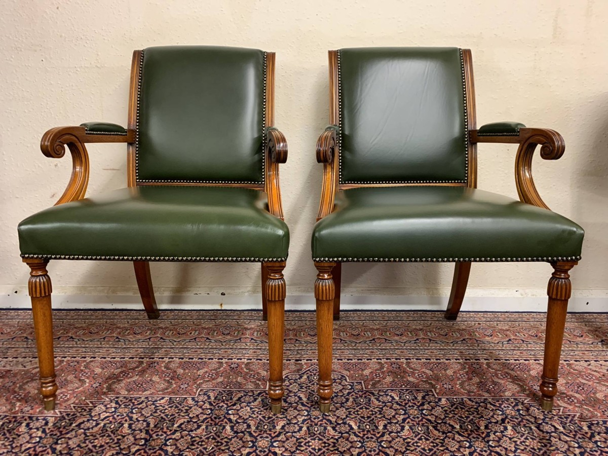 This fabulous quality pair of chairs are in immaculate condition. Each chair having an antique green leather upholstered back, seat and cushioned arm rests. The leather having brass studded decoration. Having a pair of scroll arms, out swept back legs and two carved and turned front legs, each leg having a brass cap.