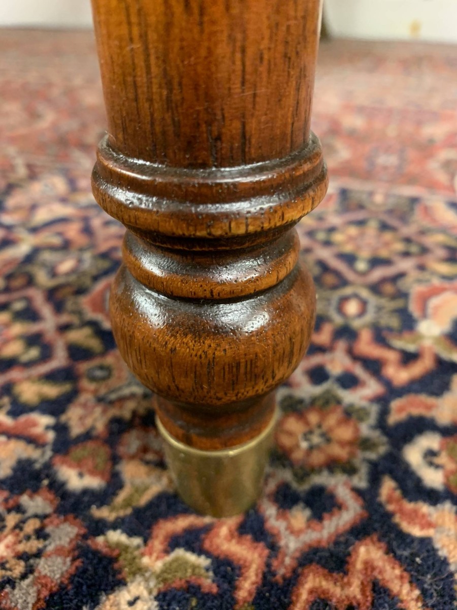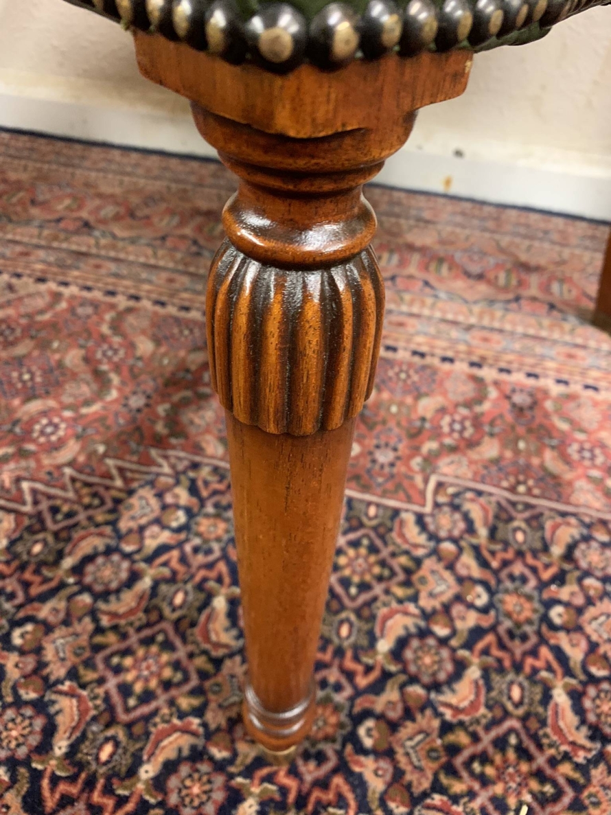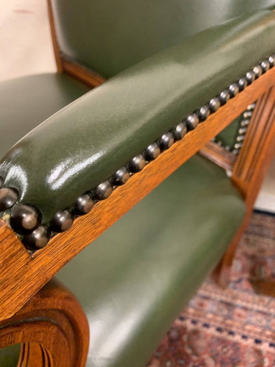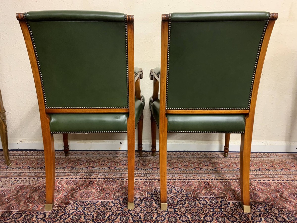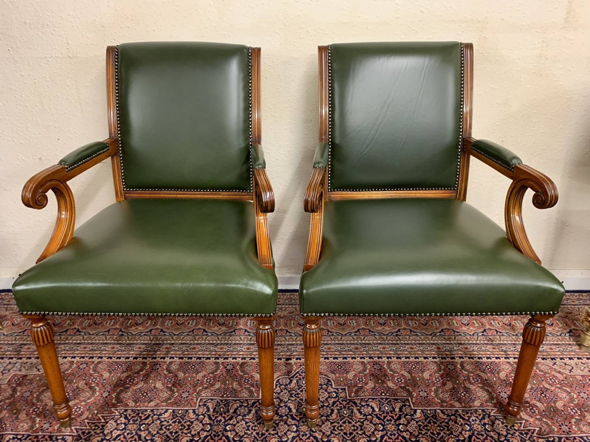 This fabulous quality pair of chairs are in immaculate condition. Each chair having an antique green leather upholstered back, seat and cushioned arm rests. The leather having brass studded decoration. Having a pair of scroll arms, out swept back legs and two carved and turned front legs, each leg having a brass cap.