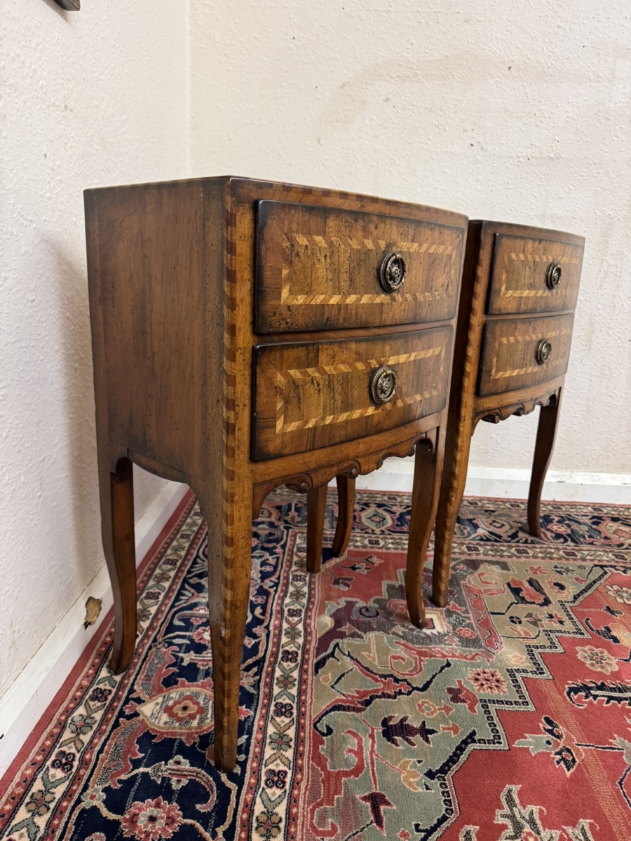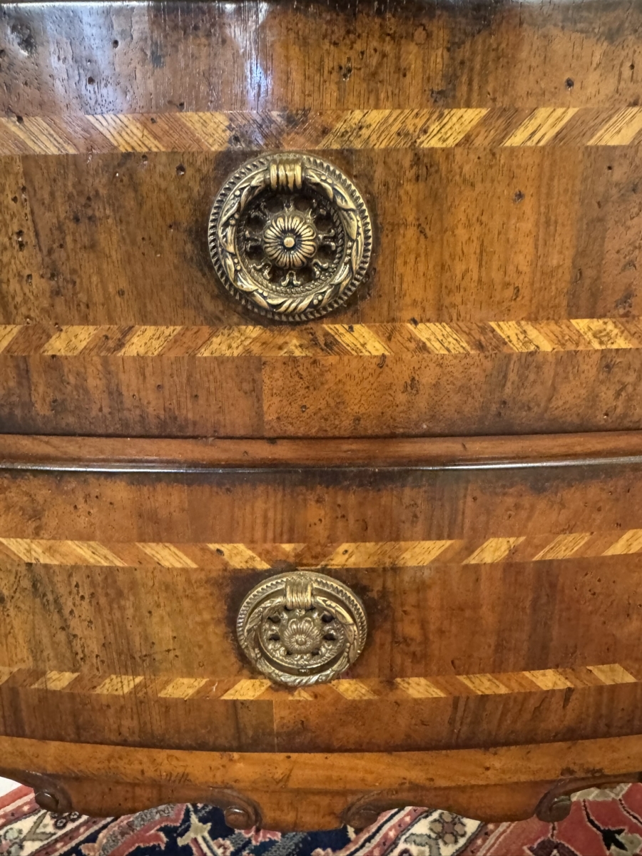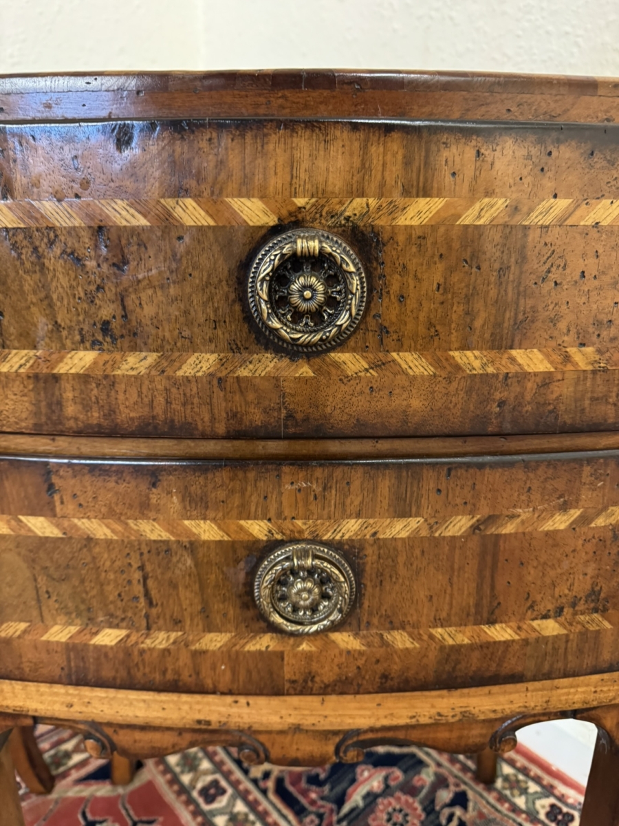 The top has inlay decoration to the edges, below are a pair of slightly curved drawers, each drawer having an ornate brass handle and inlay decoration. Scroll carving to the skirt and standing on four elegant out swept legs.