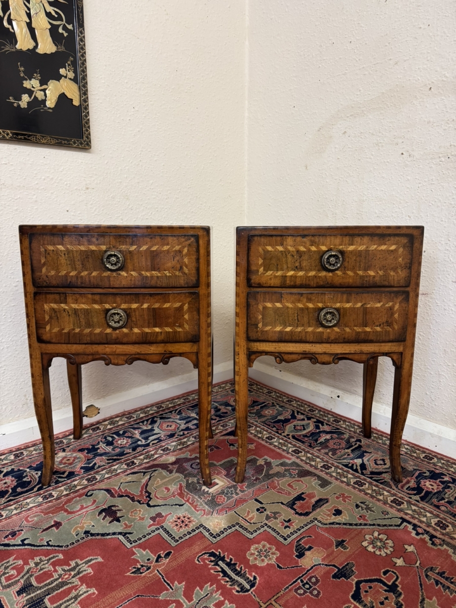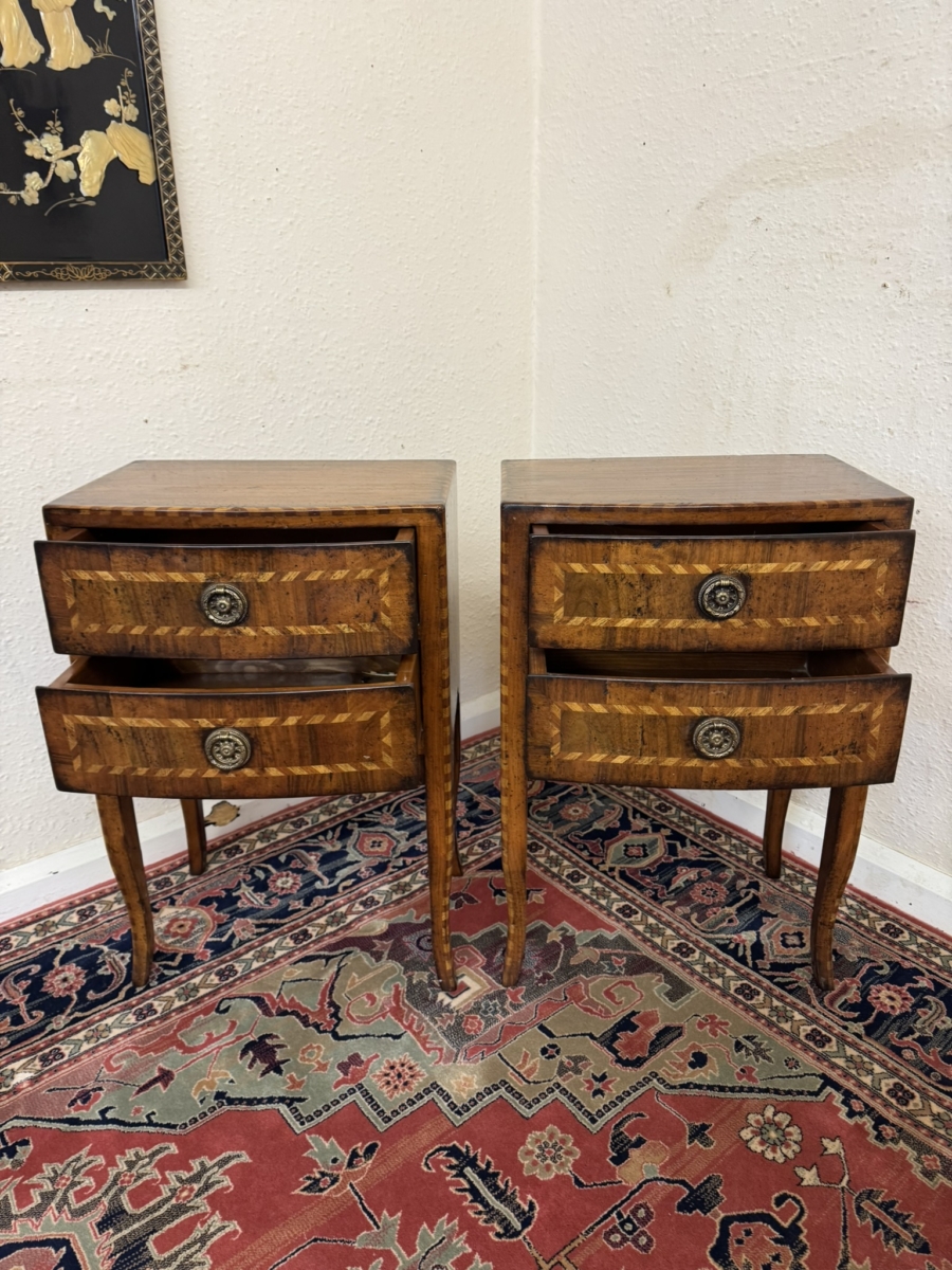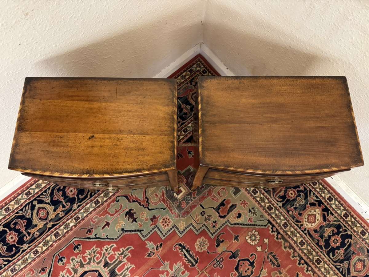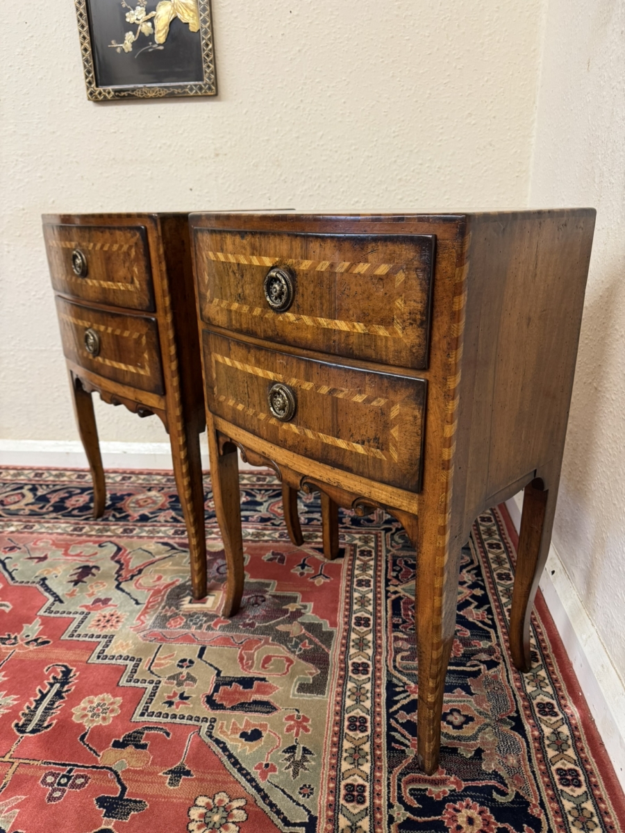 The top has inlay decoration to the edges, below are a pair of slightly curved drawers, each drawer having an ornate brass handle and inlay decoration. Scroll carving to the skirt and standing on four elegant out swept legs.