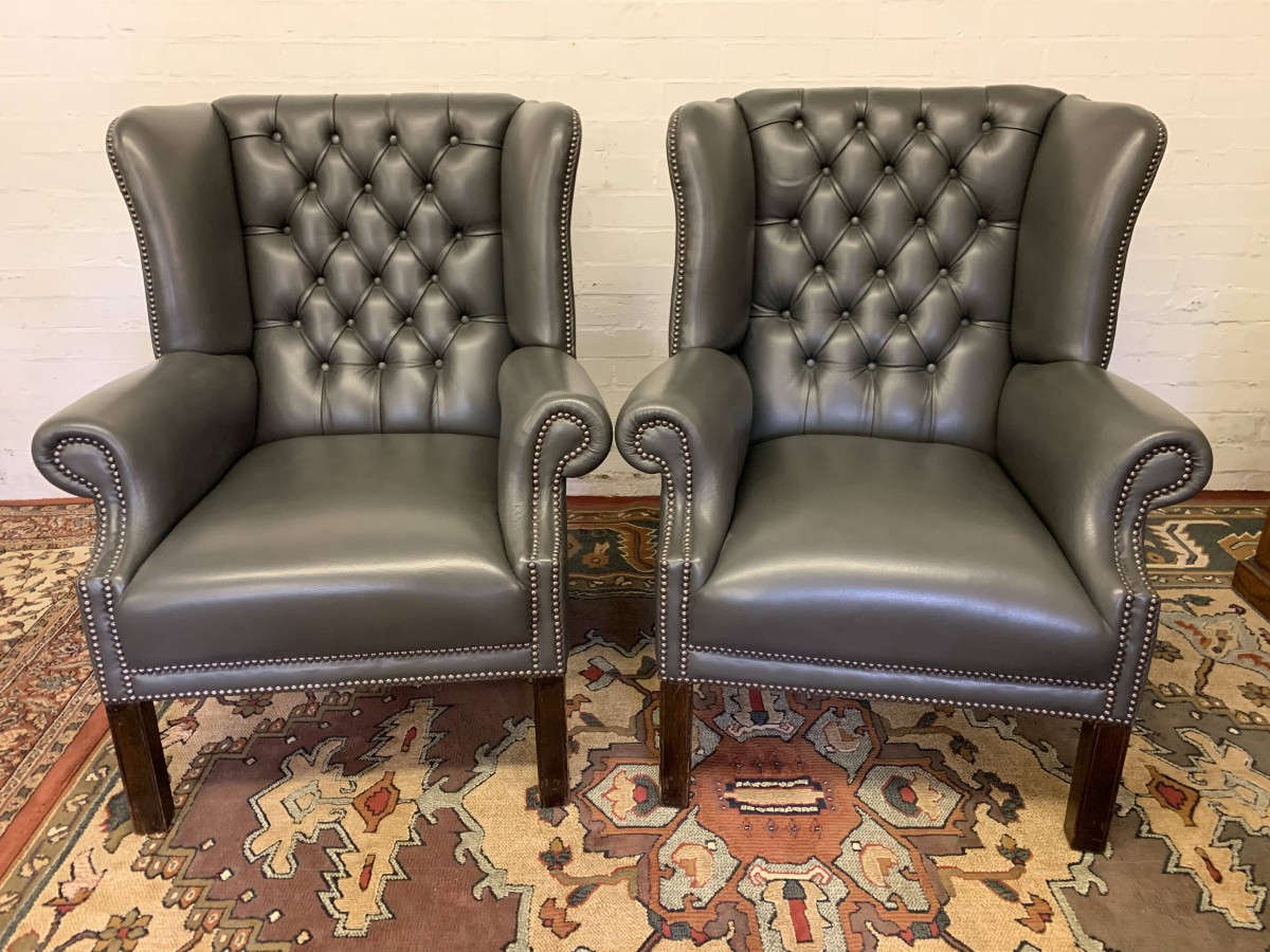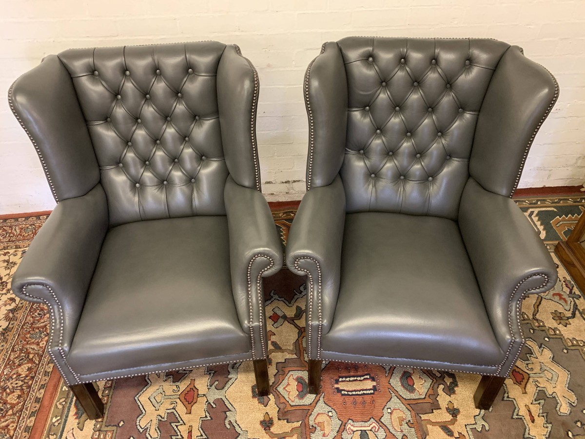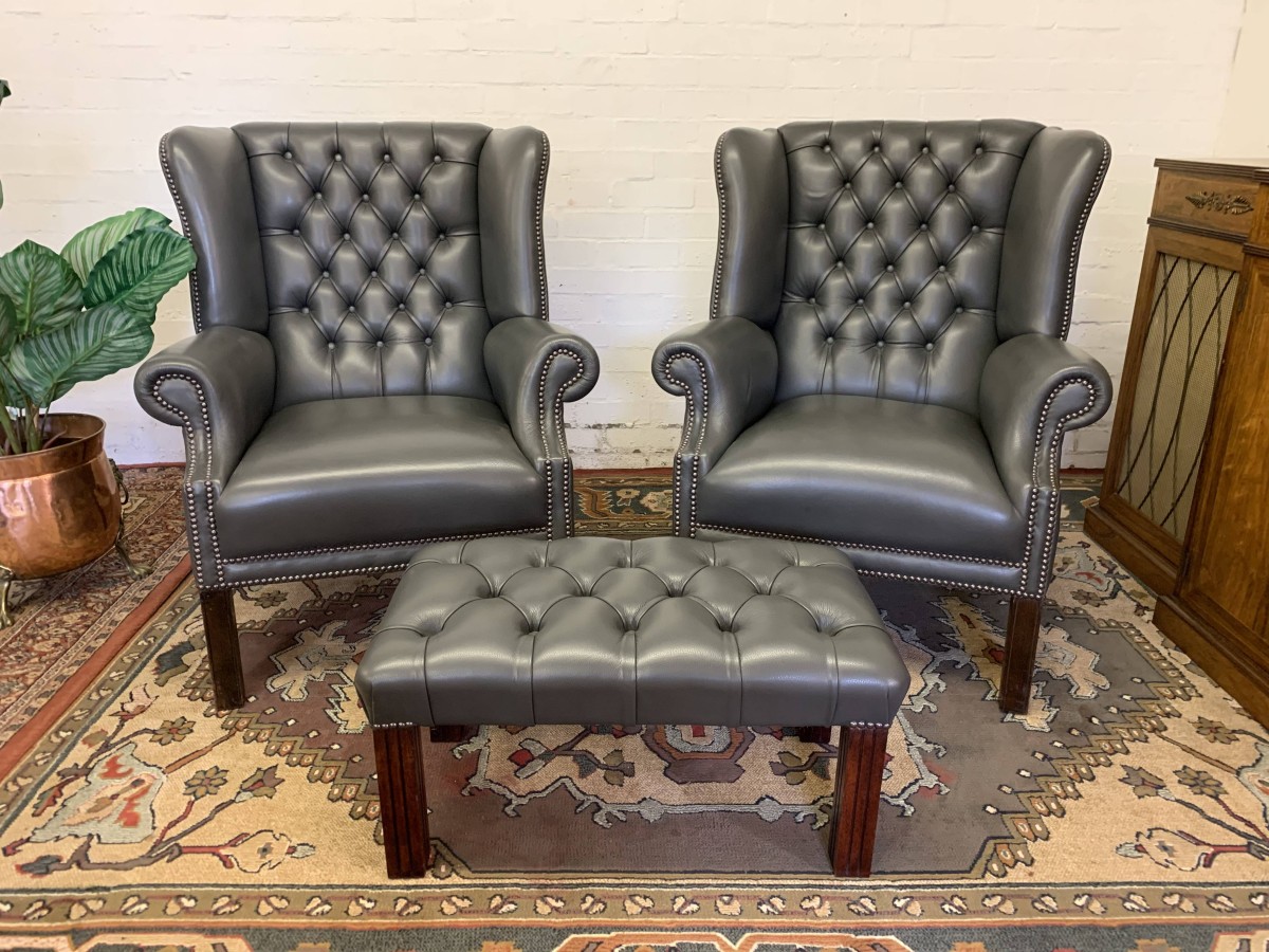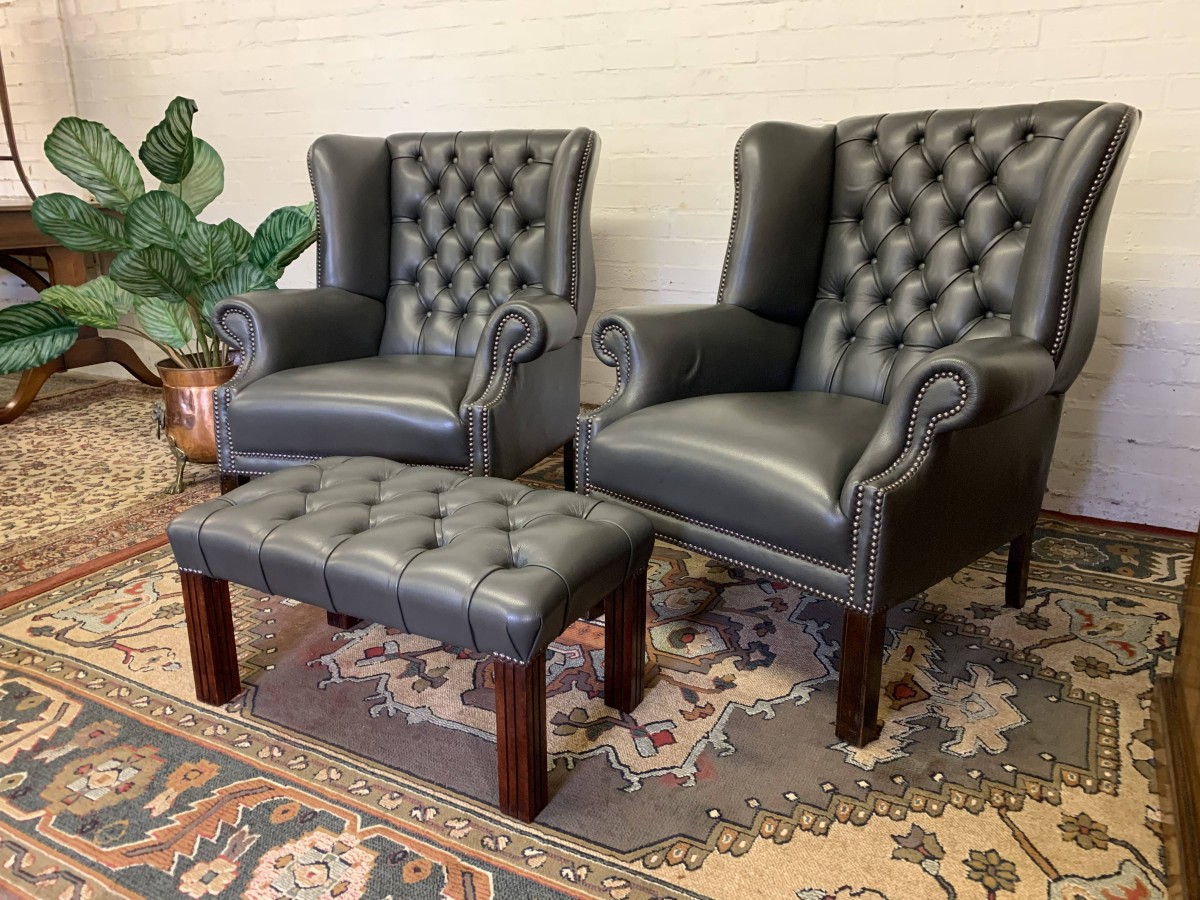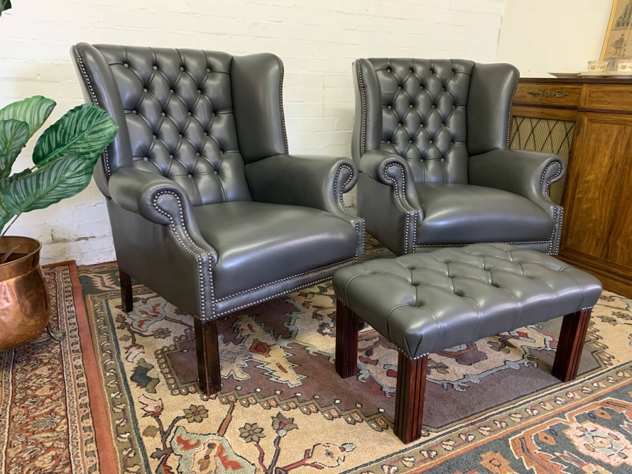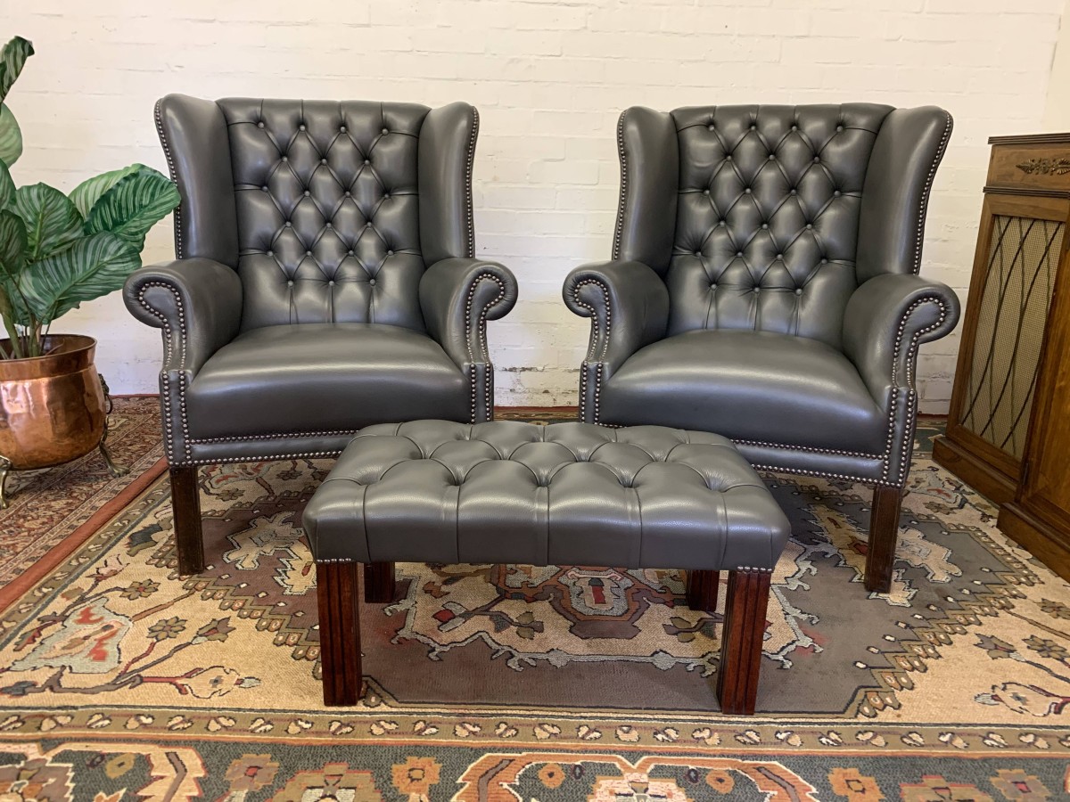 - Quality Pair Of Grey Leather Wingback Chesterfield Armchairs And Footstool – Now Sold