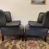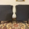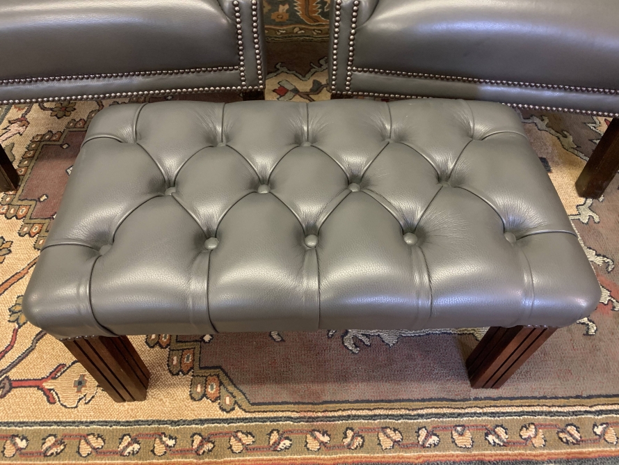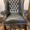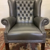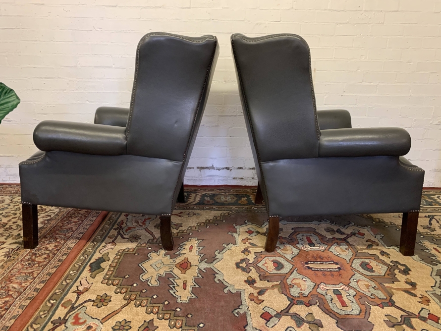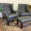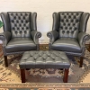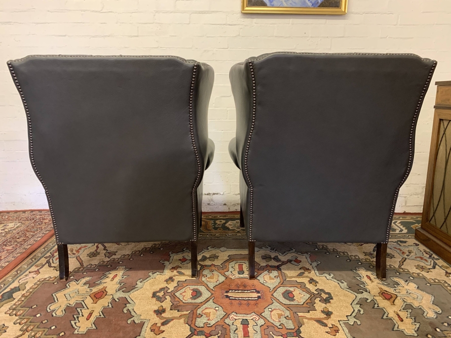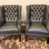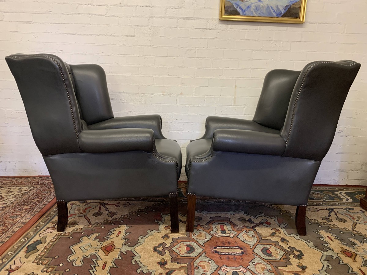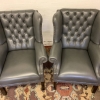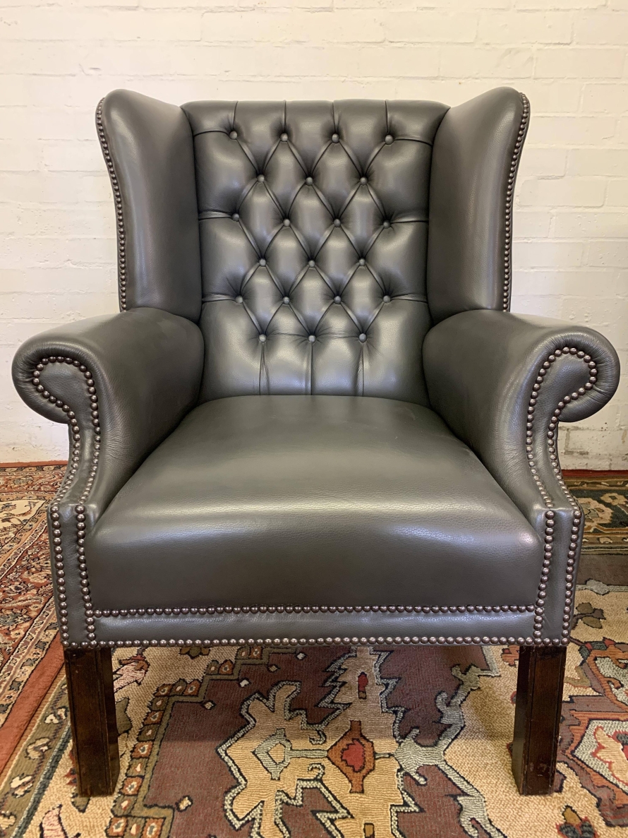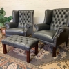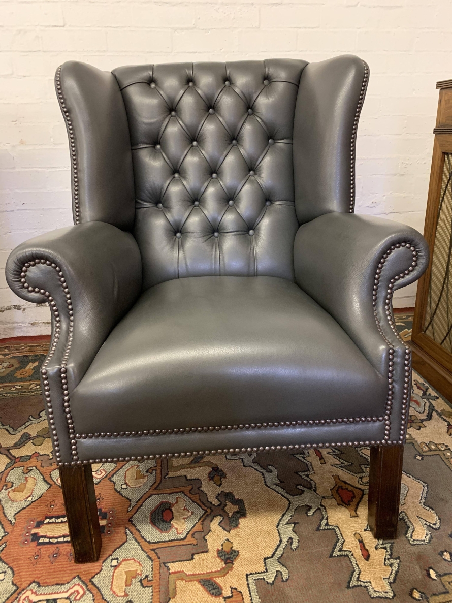 - Quality Pair Of Grey Leather Wingback Chesterfield Armchairs And Footstool – Now Sold