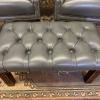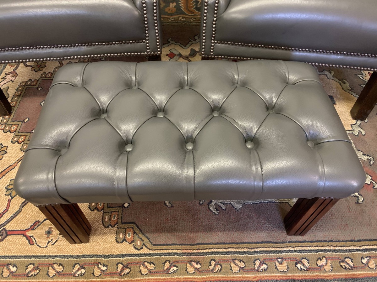 This super pair of chairs and matching footstool are in excellent condition and are upholstered in soft grey leather. Having a deep buttoned cushioned back and cushioned seat with brass studding throughout the chairs stand on four square legs. Please note these chairs are in pristine condition.