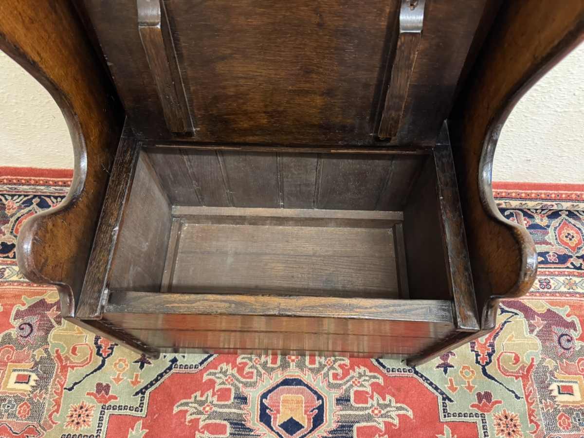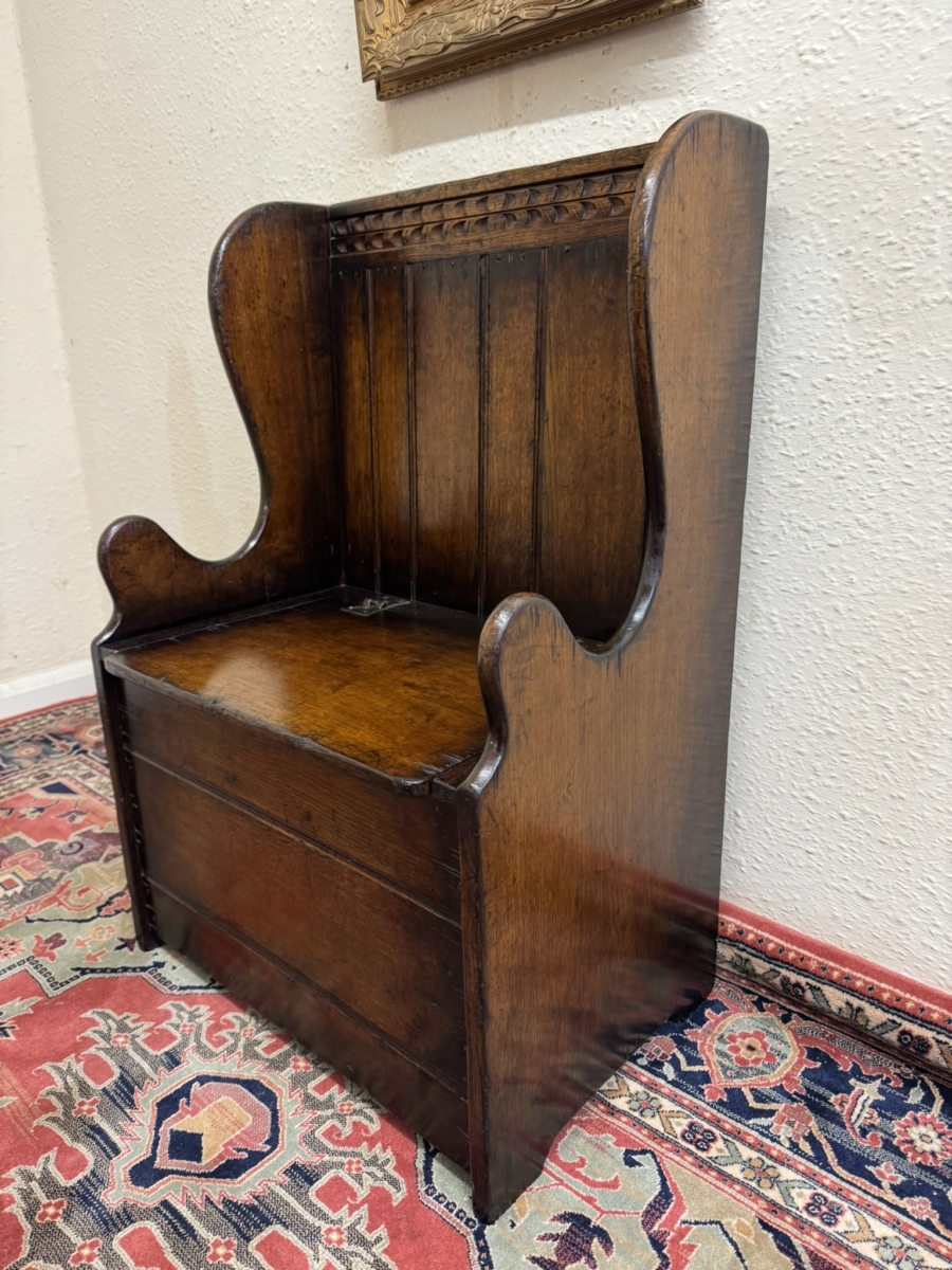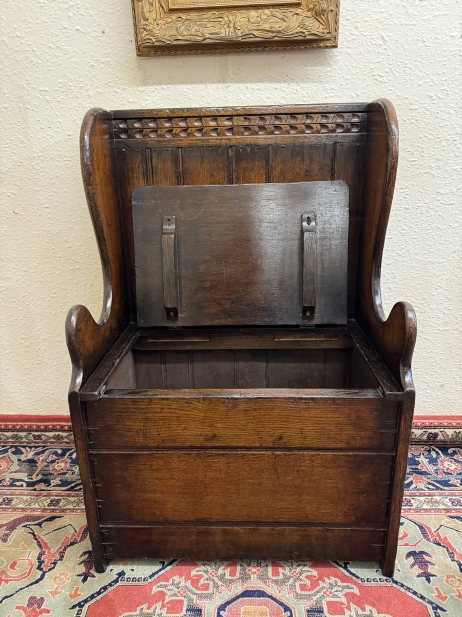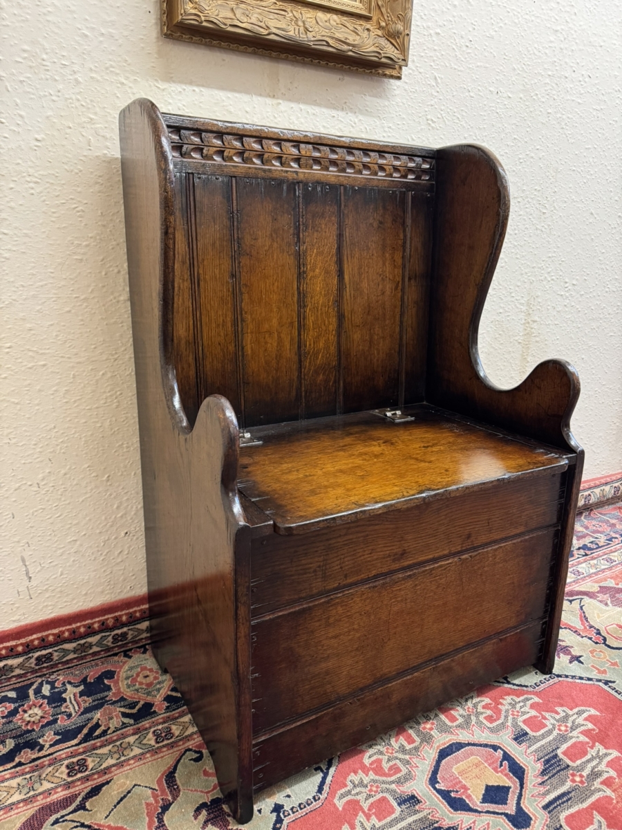 Made by the renowned Titchmarsh and Goodwin furniture makers in solid oak and is in super condition. The panelled back has a carved top, curved sides, lift up seat to offer storage space, carved front and standing on traditional block feet.
