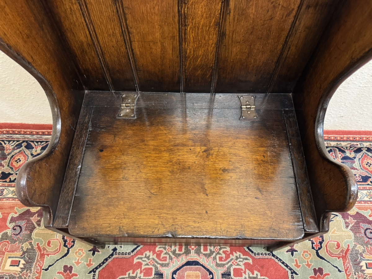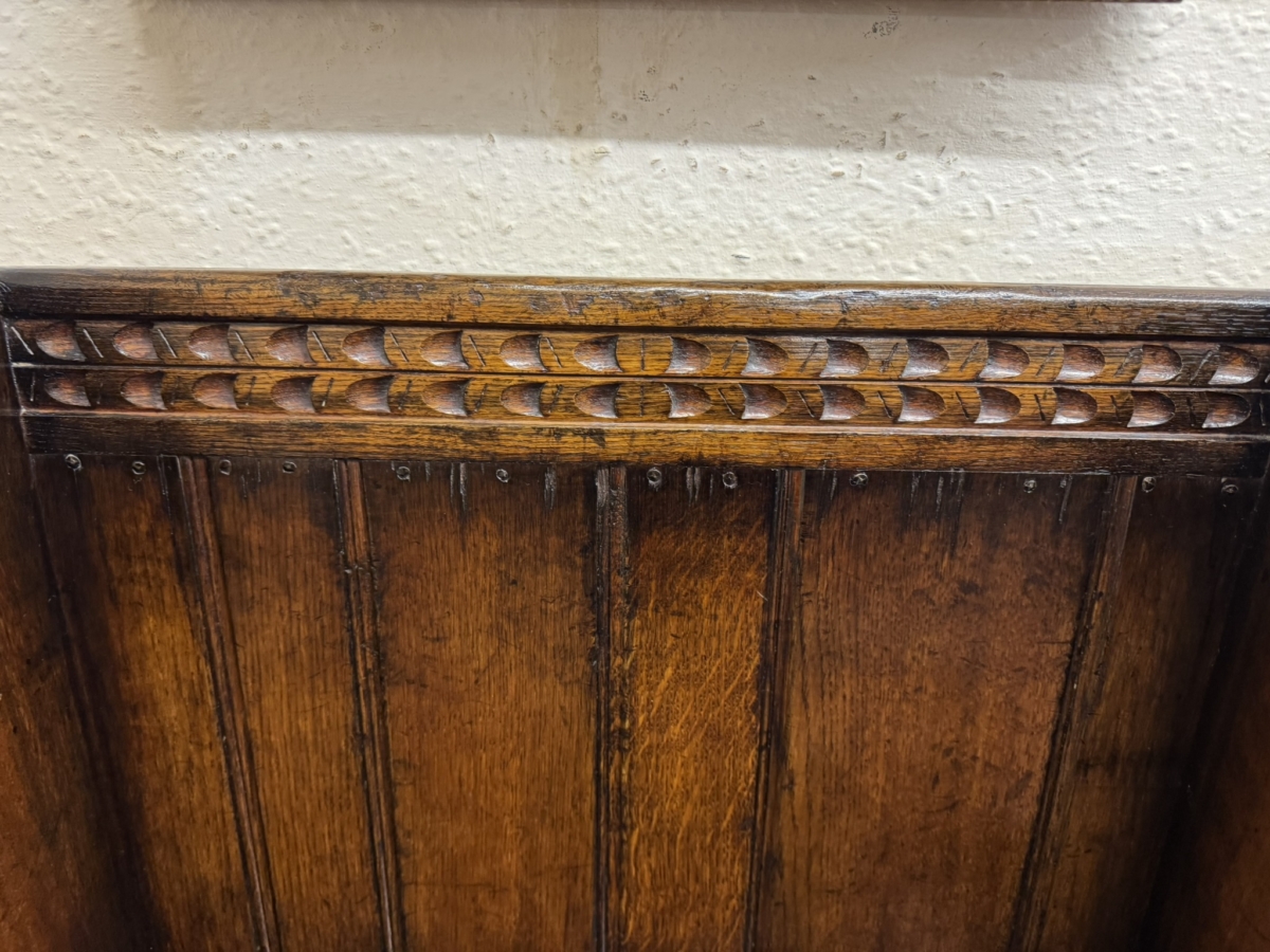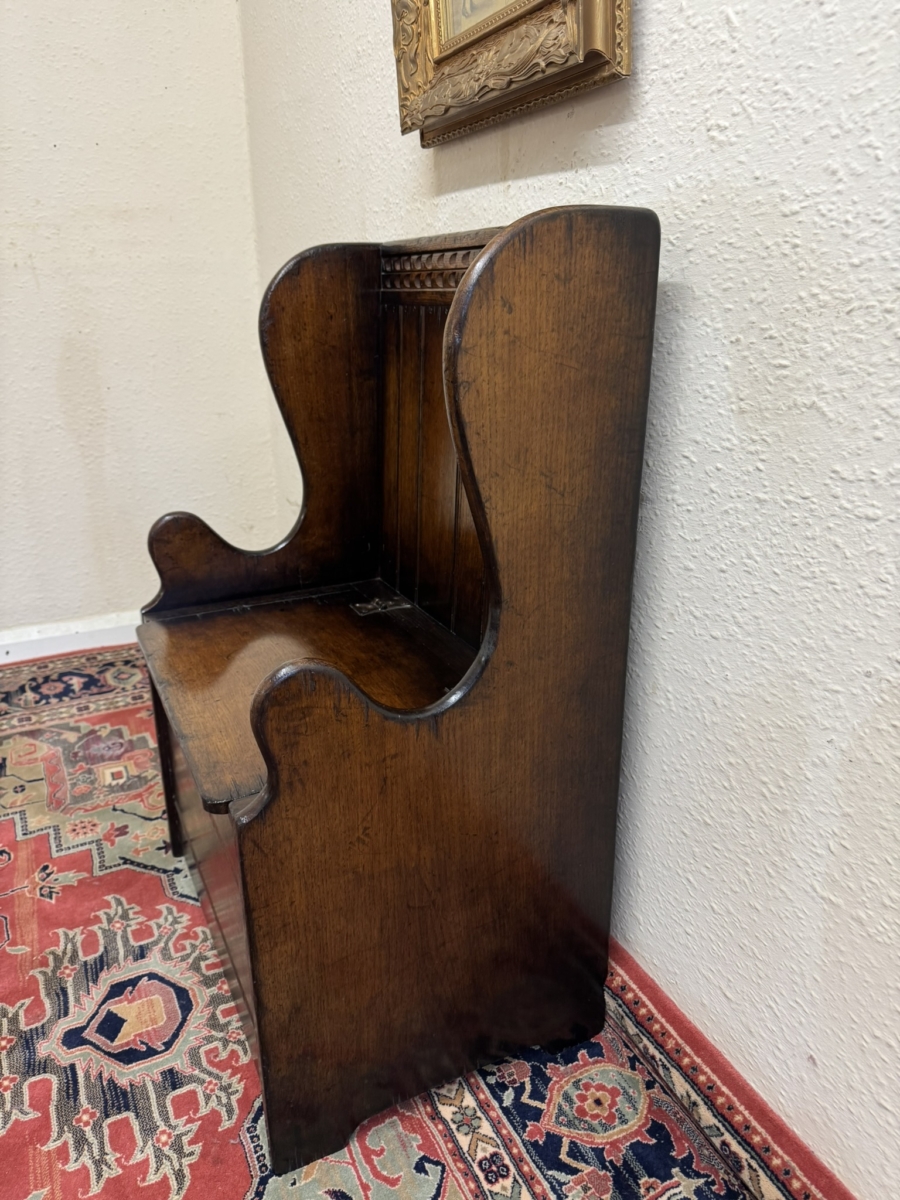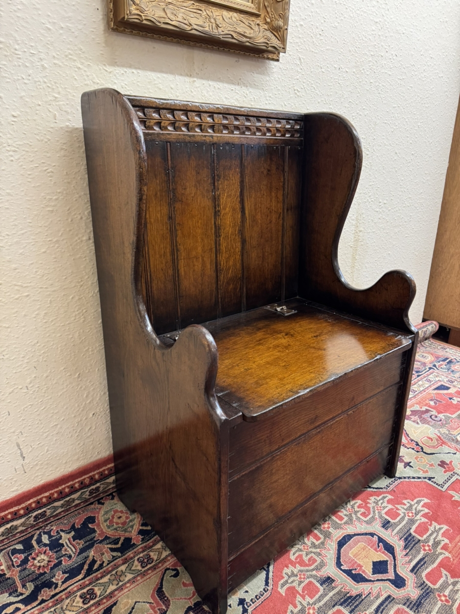 Made by the renowned Titchmarsh and Goodwin furniture makers in solid oak and is in super condition. The panelled back has a carved top, curved sides, lift up seat to offer storage space, carved front and standing on traditional block feet.