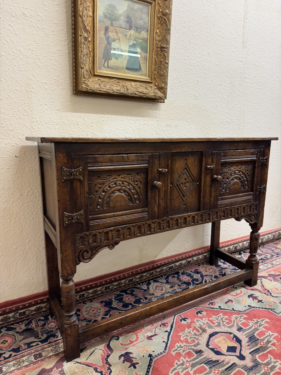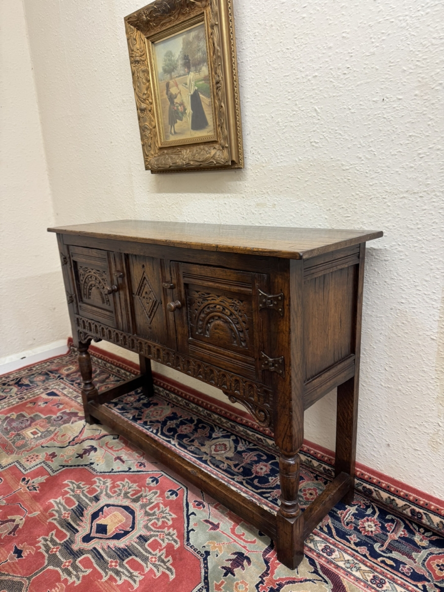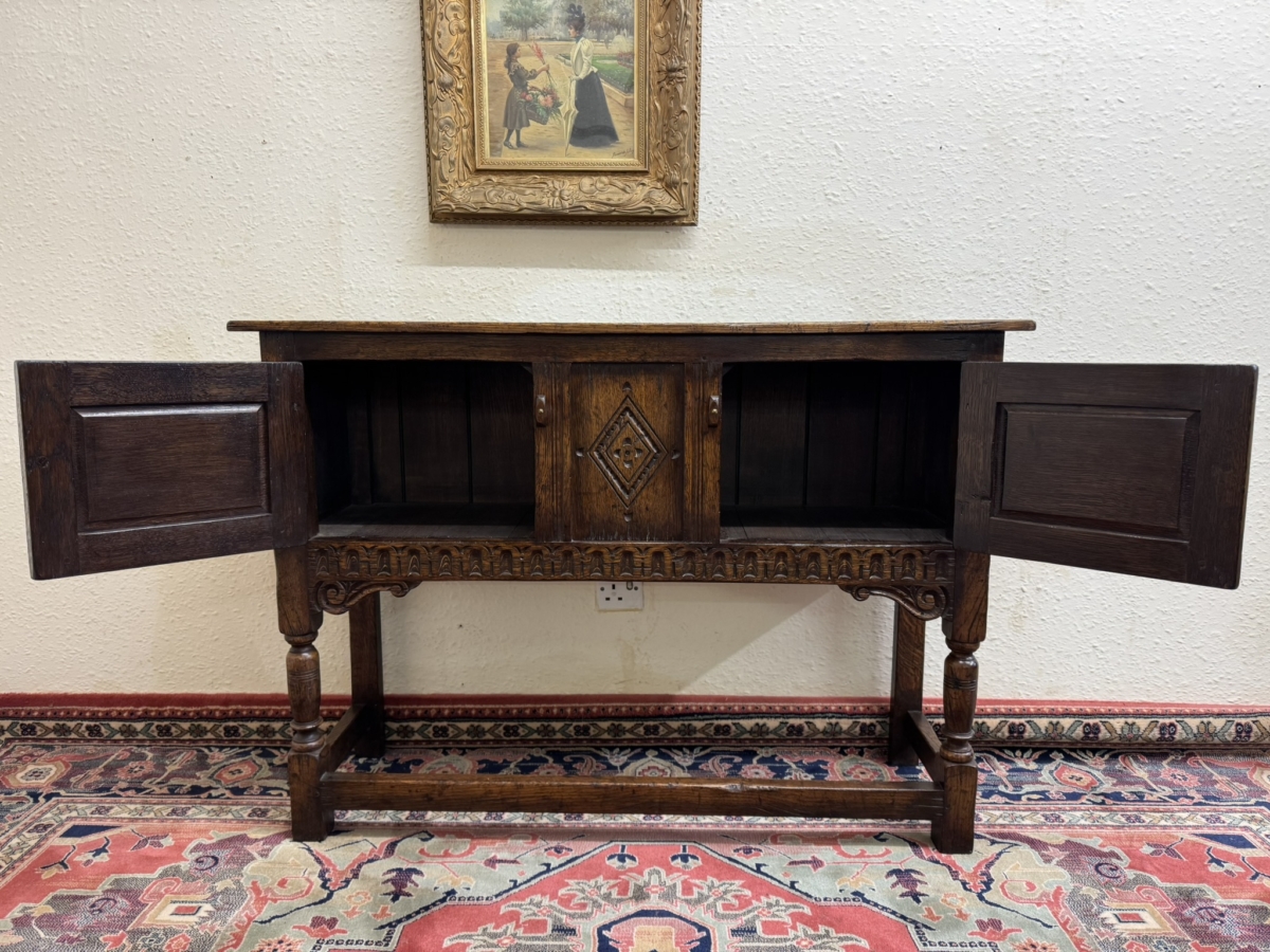 Made by the renowned Titchmarsh and Goodwin furniture makers and is in excellent condition. The over sailing top sits above a central carved fixed panel which is flanked by a pair of lockable carved cupboard doors the doors having turned handles and locking latch. Fabulous carving below, recessed panelled sides turned legs to the front, stretcher supports and standing on traditional block feet.