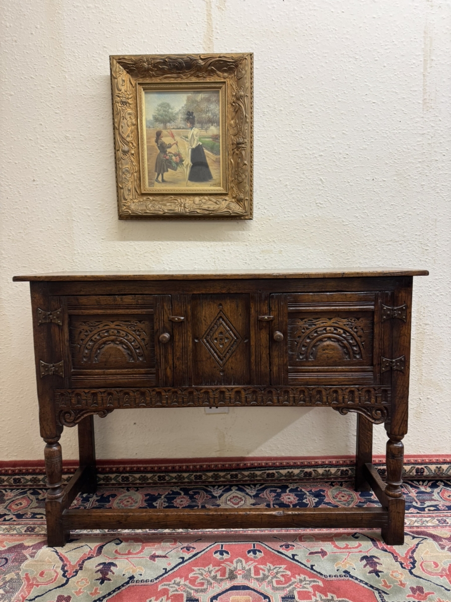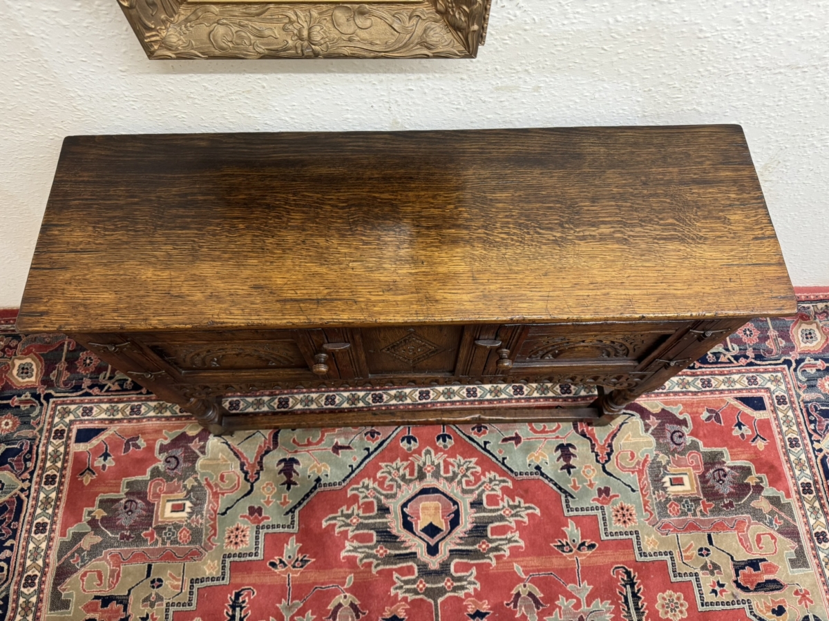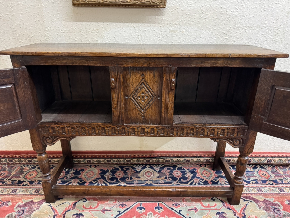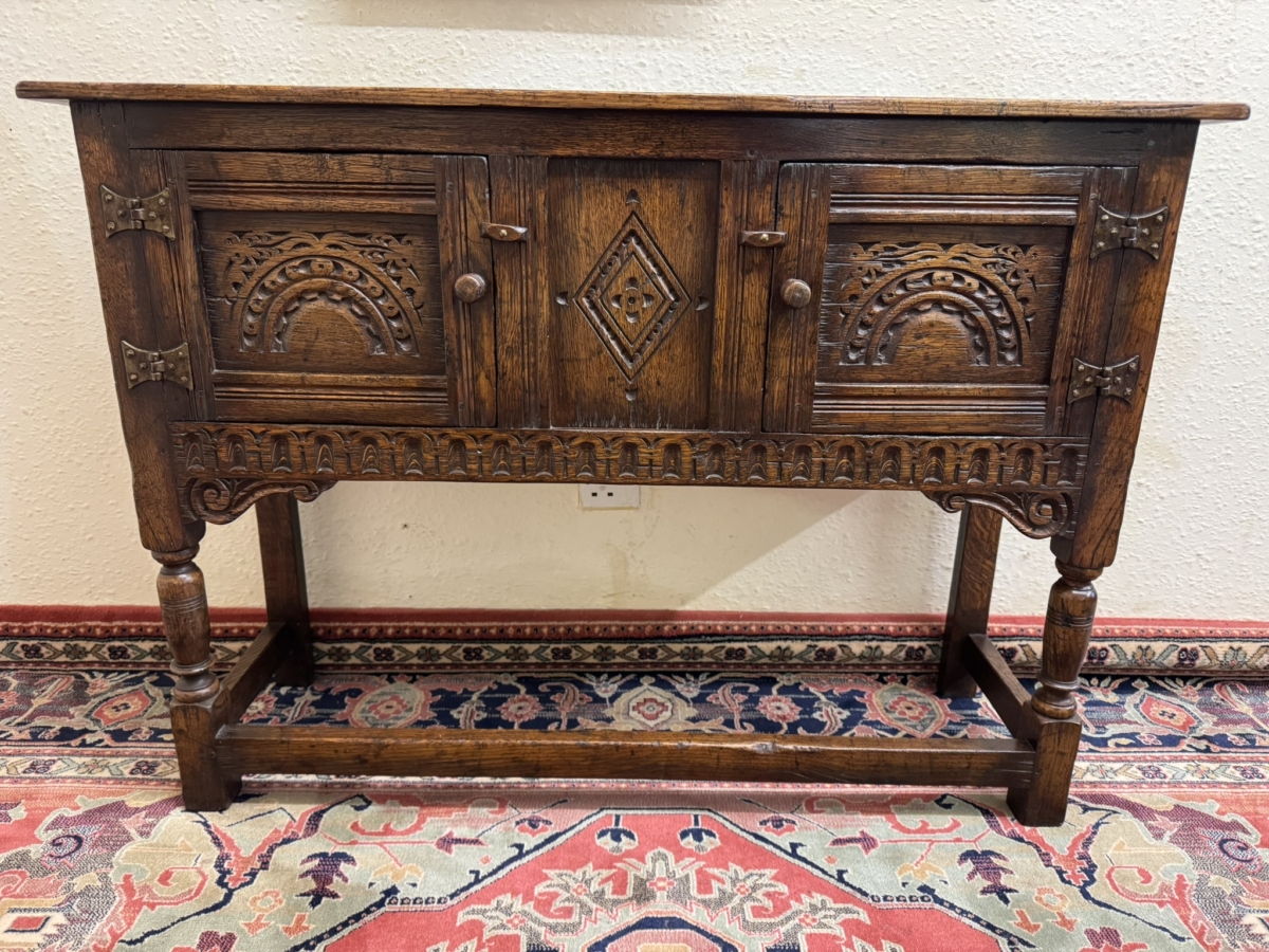 Made by the renowned Titchmarsh and Goodwin furniture makers and is in excellent condition. The over sailing top sits above a central carved fixed panel which is flanked by a pair of lockable carved cupboard doors the doors having turned handles and locking latch. Fabulous carving below, recessed panelled sides turned legs to the front, stretcher supports and standing on traditional block feet.