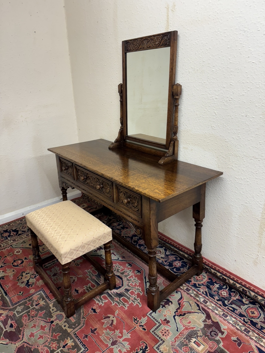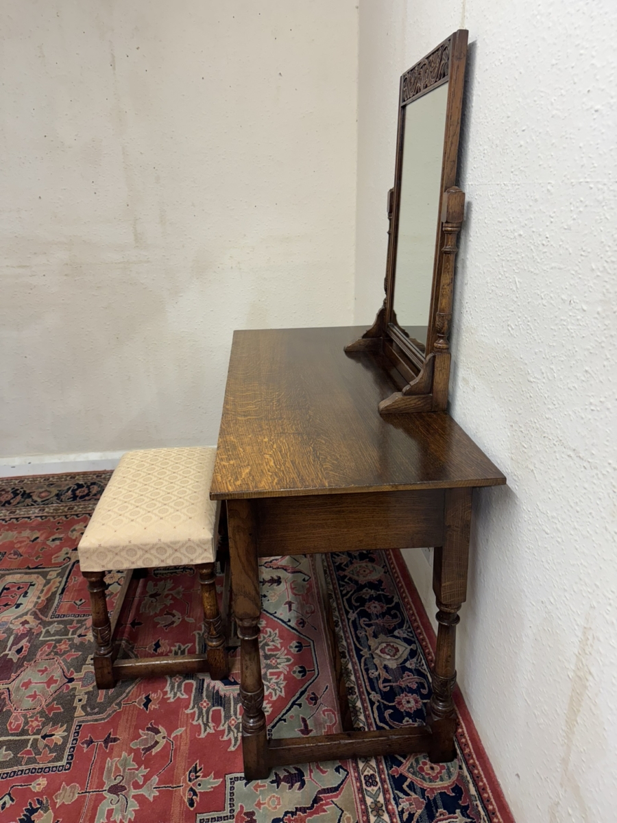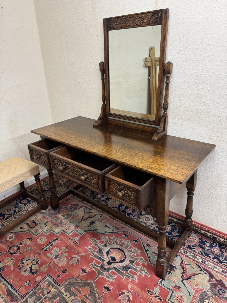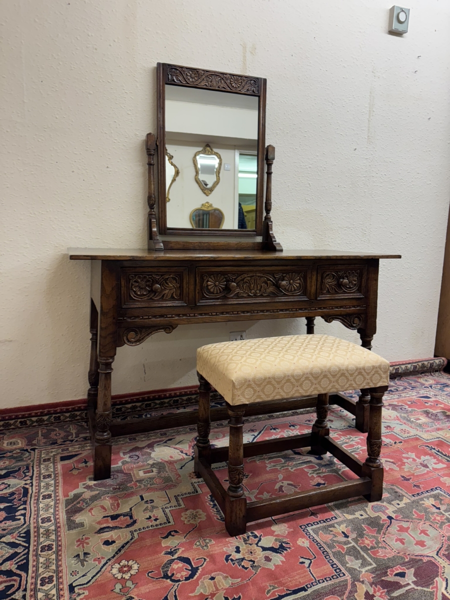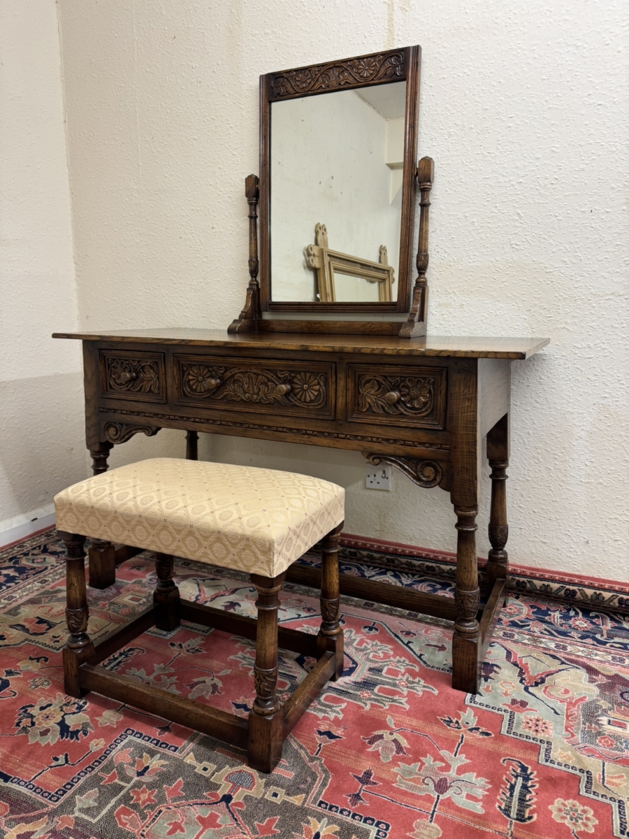 Made entirely in solid oak by the renowned Titchmarsh and Goodwin furniture makers and is in excellent condition. This fabulous dressing table has a mirror in a carved frame which attaches to carved turn supports. Below is an over sailing top which sits above a central carved drawer which is flanked by a pair of smaller carved drawers. The drawers having turned knob handles. Four turned legs with stretcher supports and standing on traditional block feet. The stool having four carved turned legs, traditional block feet and an upholstered cushioned seat.