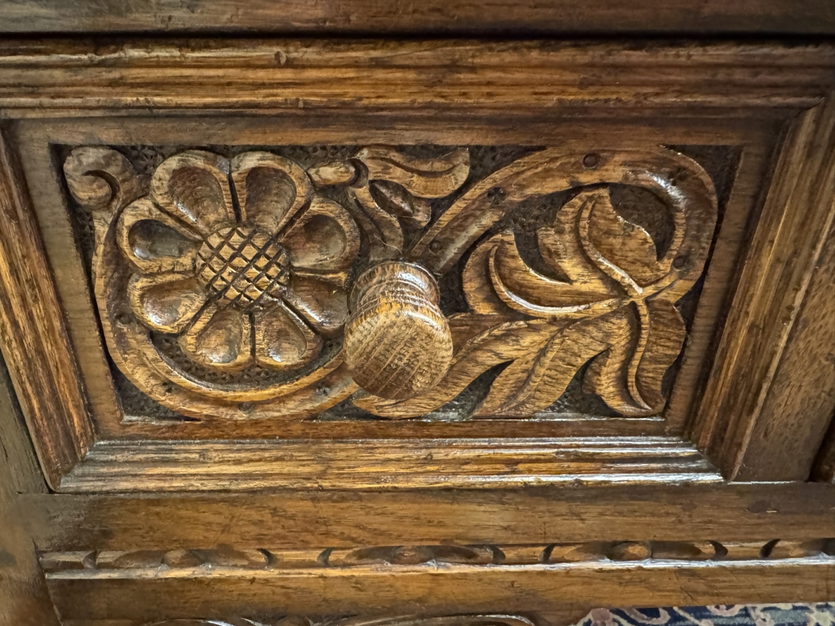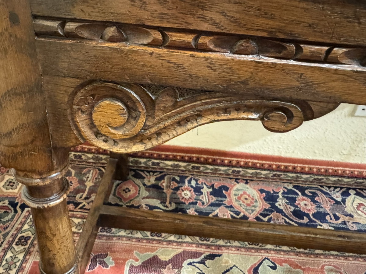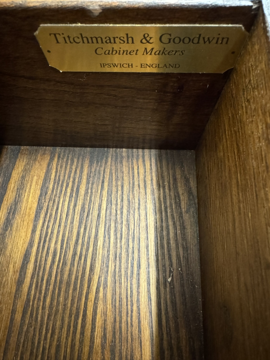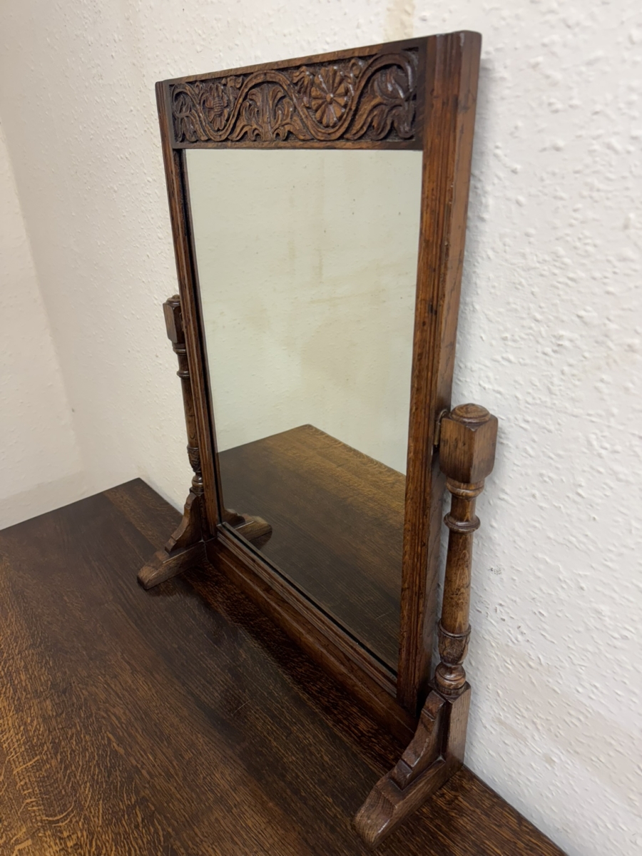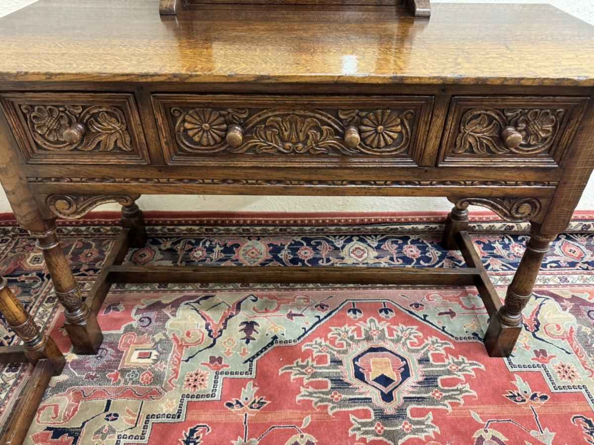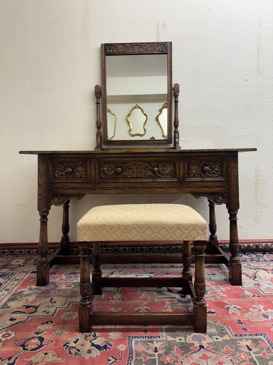Made entirely in solid oak by the renowned Titchmarsh and Goodwin furniture makers and is in excellent condition. This fabulous dressing table has a mirror in a carved frame which attaches to carved turn supports. Below is an over sailing top which sits above a central carved drawer which is flanked by a pair of smaller carved drawers. The drawers having turned knob handles. Four turned legs with stretcher supports and standing on traditional block feet. The stool having four carved turned legs, traditional block feet and an upholstered cushioned seat.