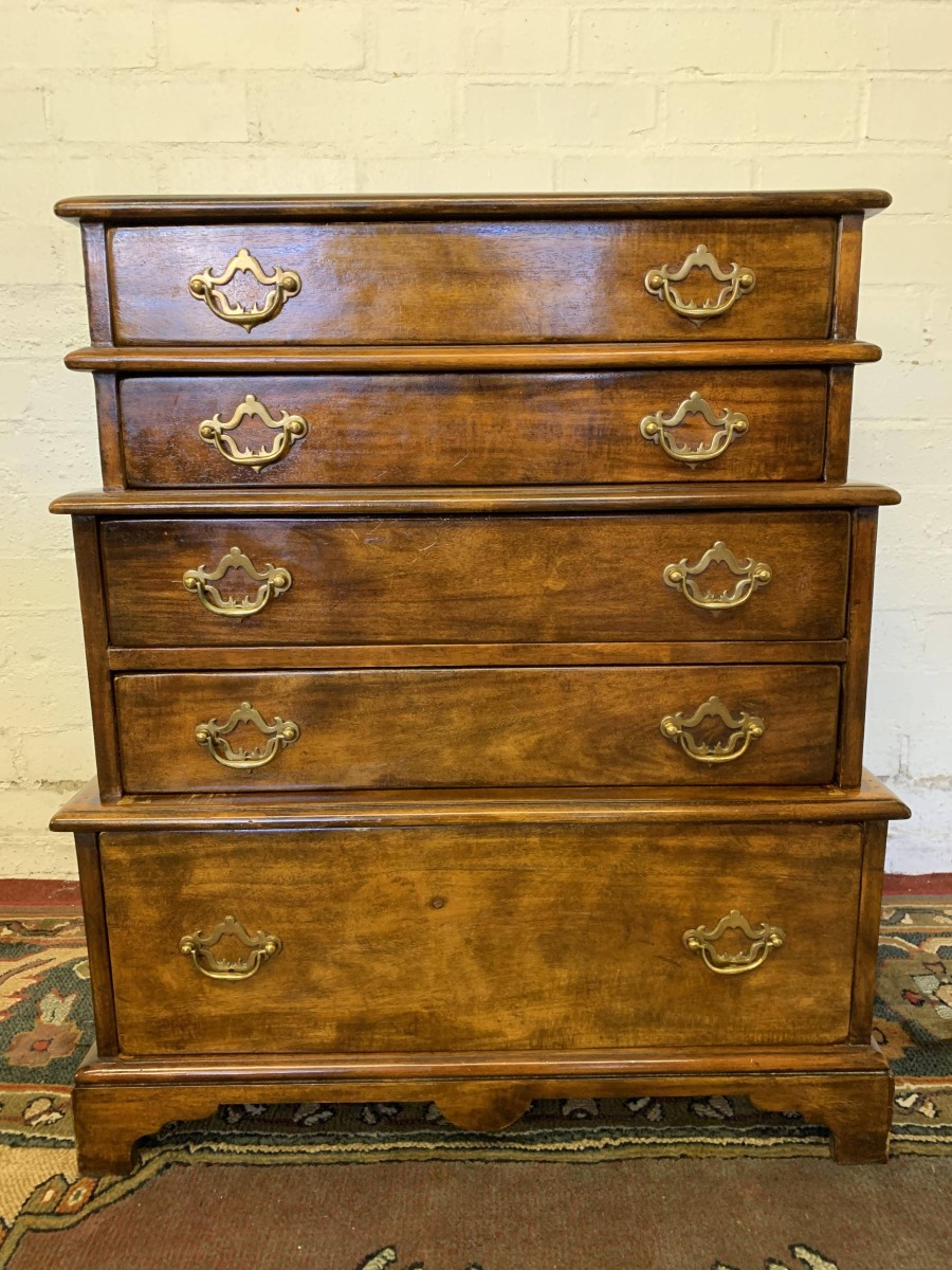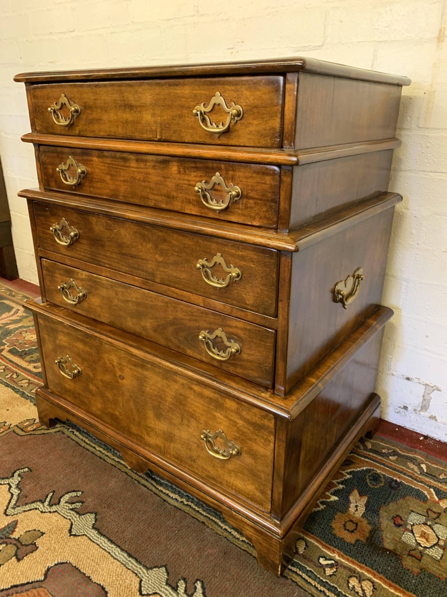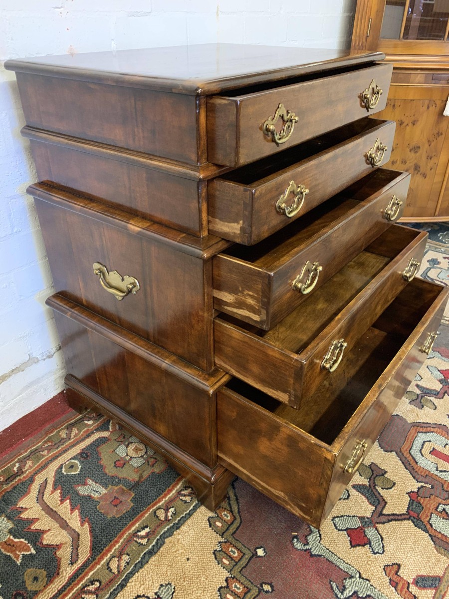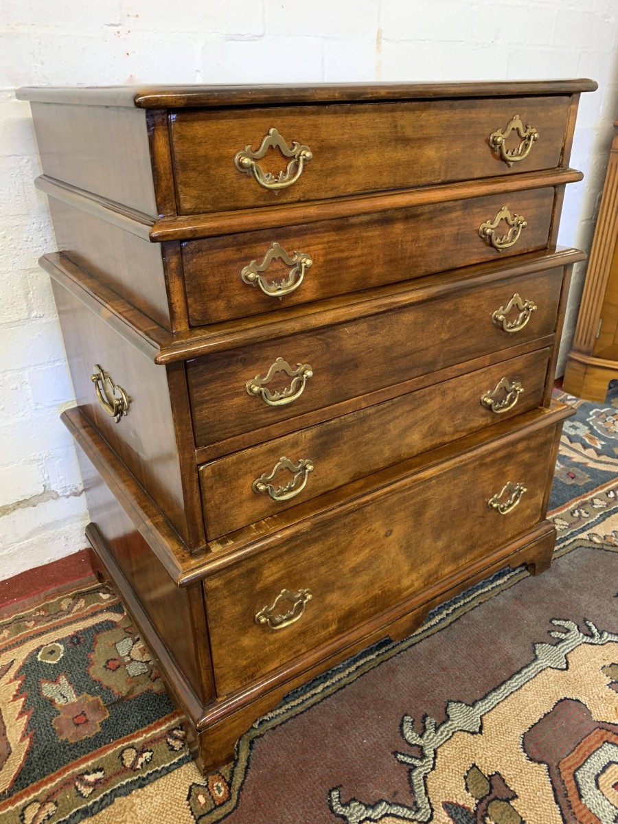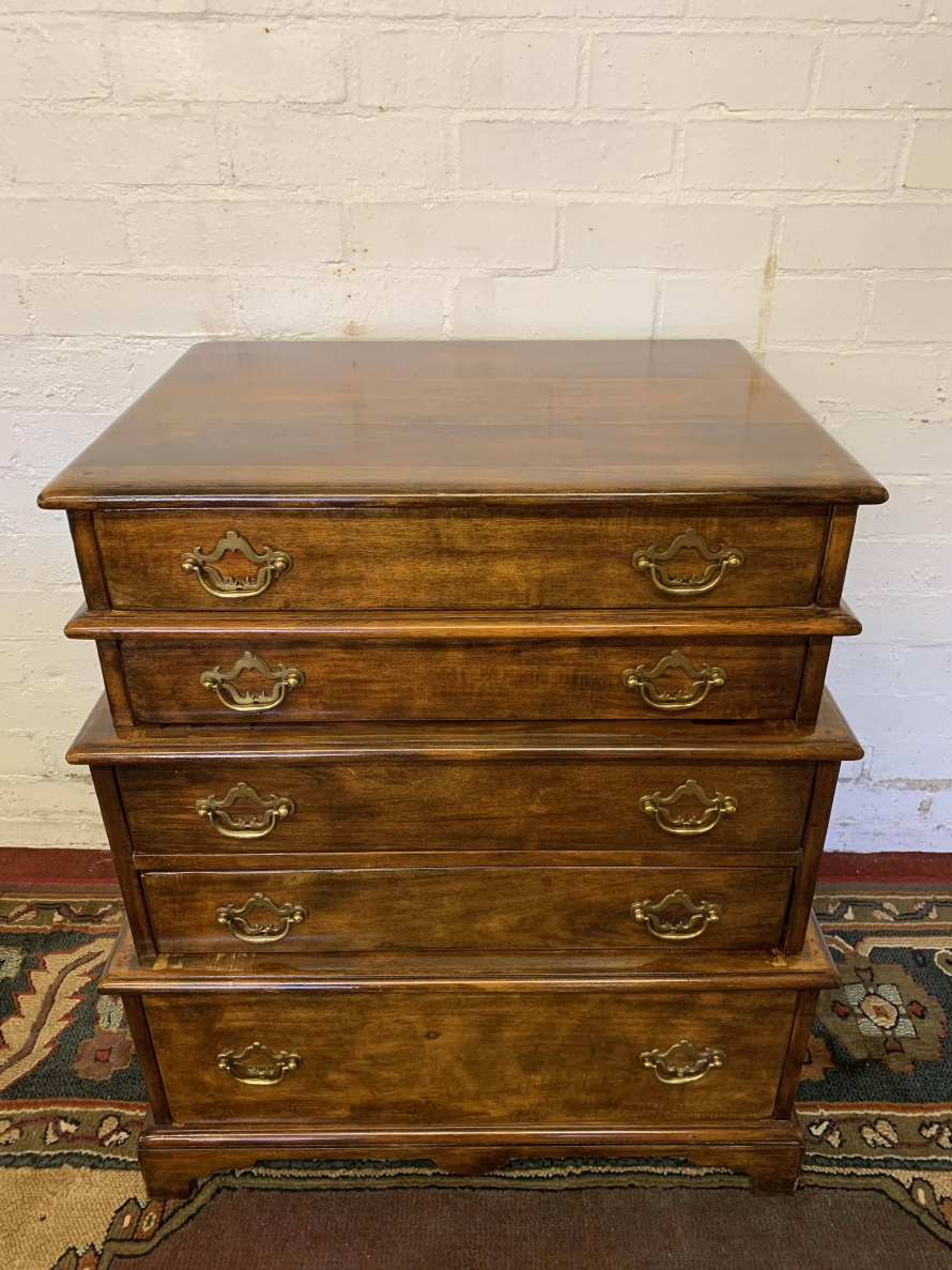 A beautiful functional item of furniture. The chest is stacked. Two drawers sit above the further pair of drawers which in turn sit above one large lower drawer. Each drawer having a pair of decorative brass handles. Handy carrying handles to the sides, this great chest of drawers sits on four bracket feet.