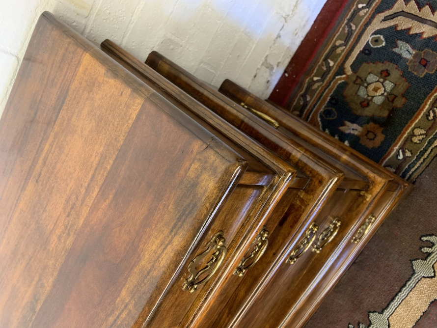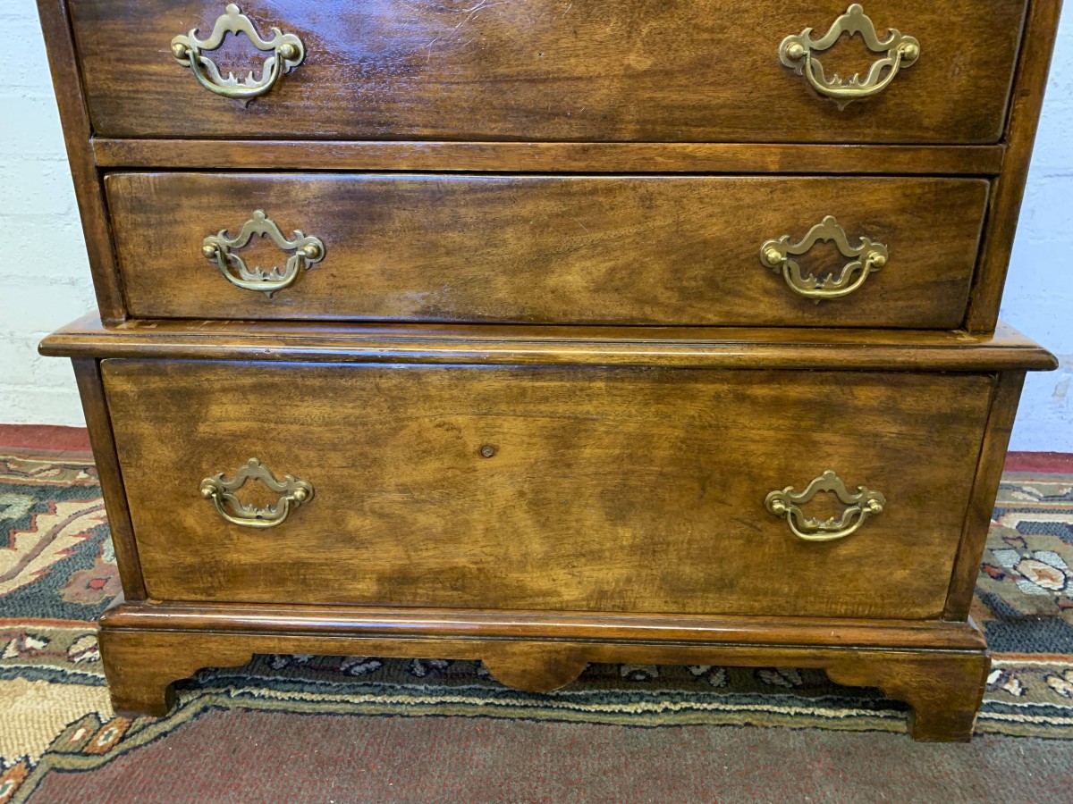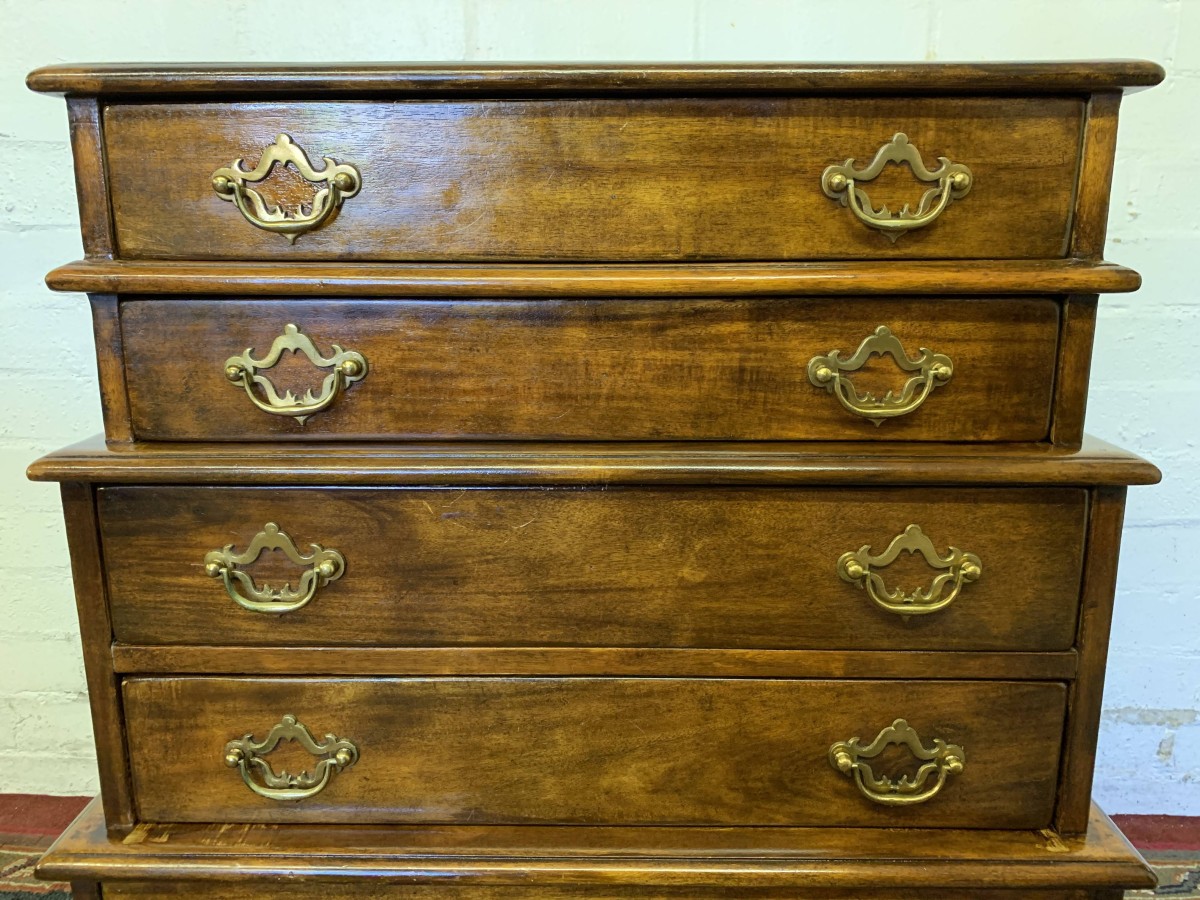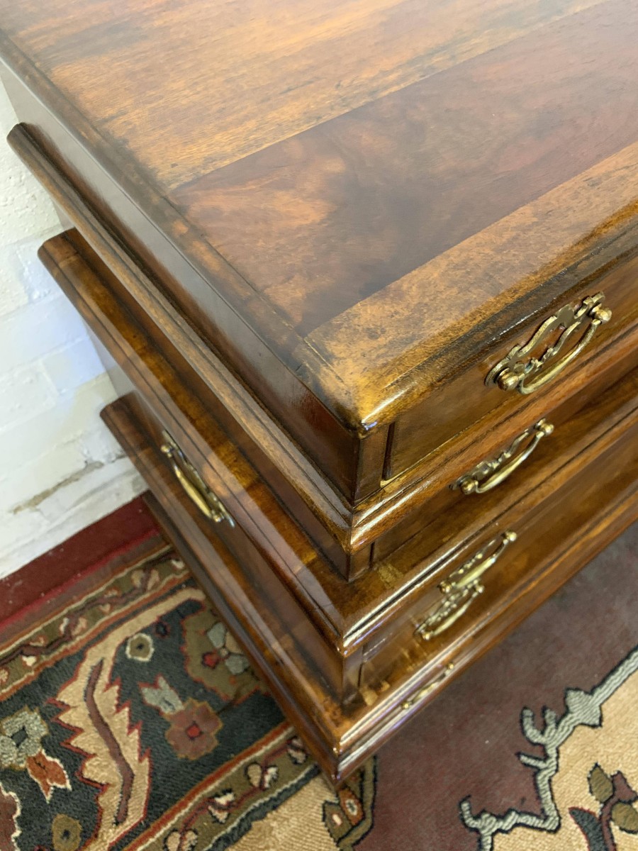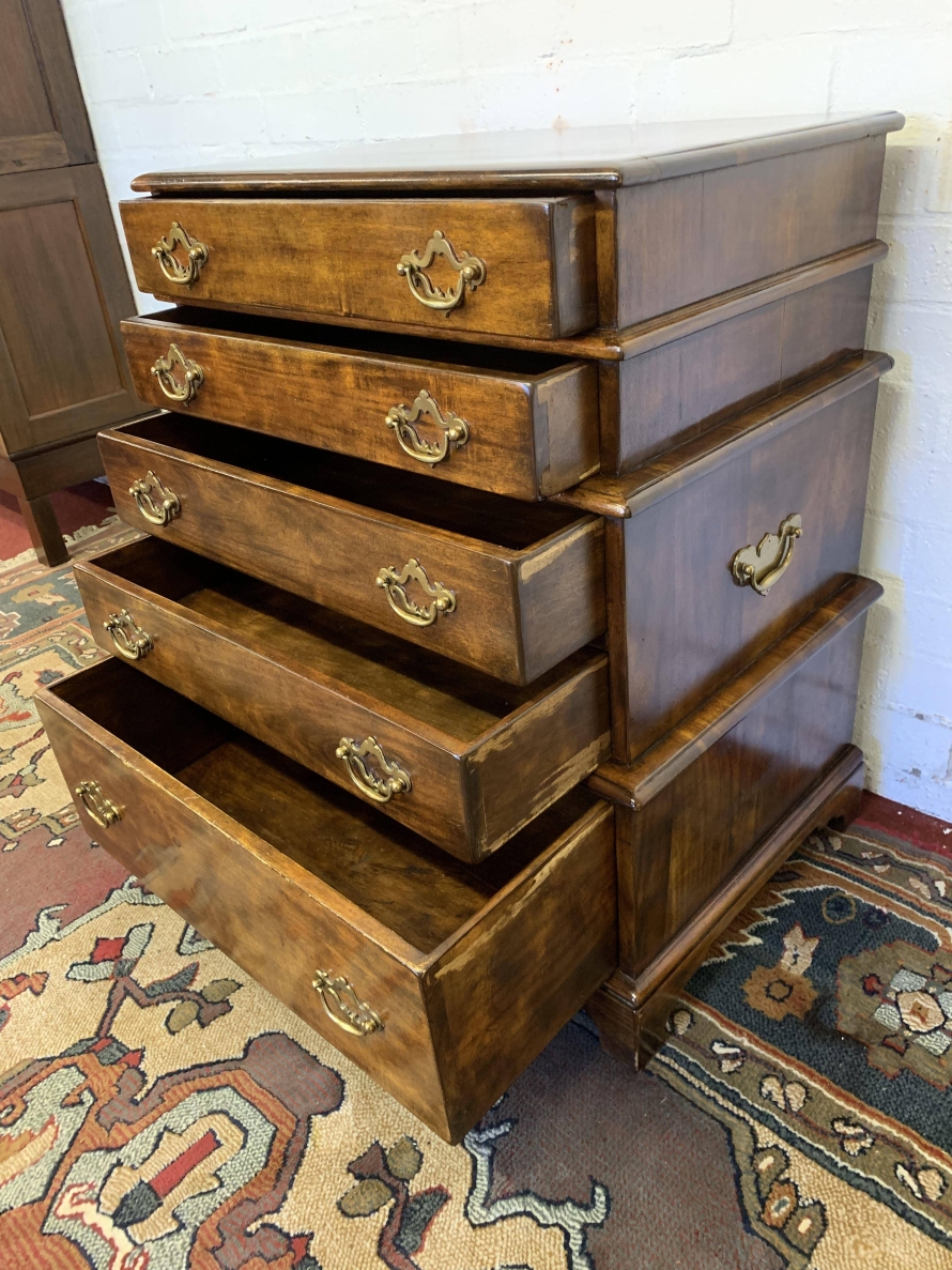 A beautiful functional item of furniture. The chest is stacked. Two drawers sit above the further pair of drawers which in turn sit above one large lower drawer. Each drawer having a pair of decorative brass handles. Handy carrying handles to the sides, this great chest of drawers sits on four bracket feet.