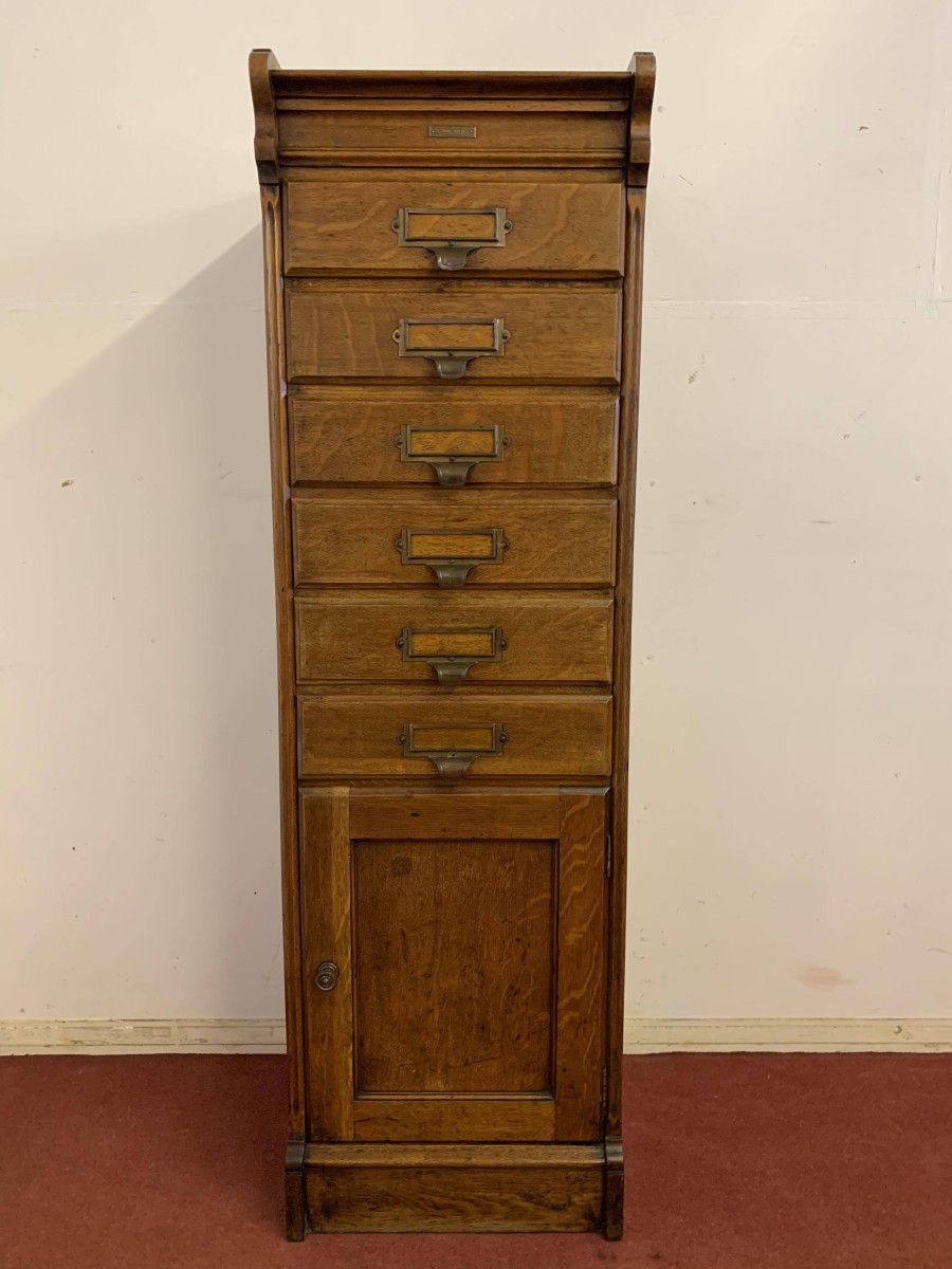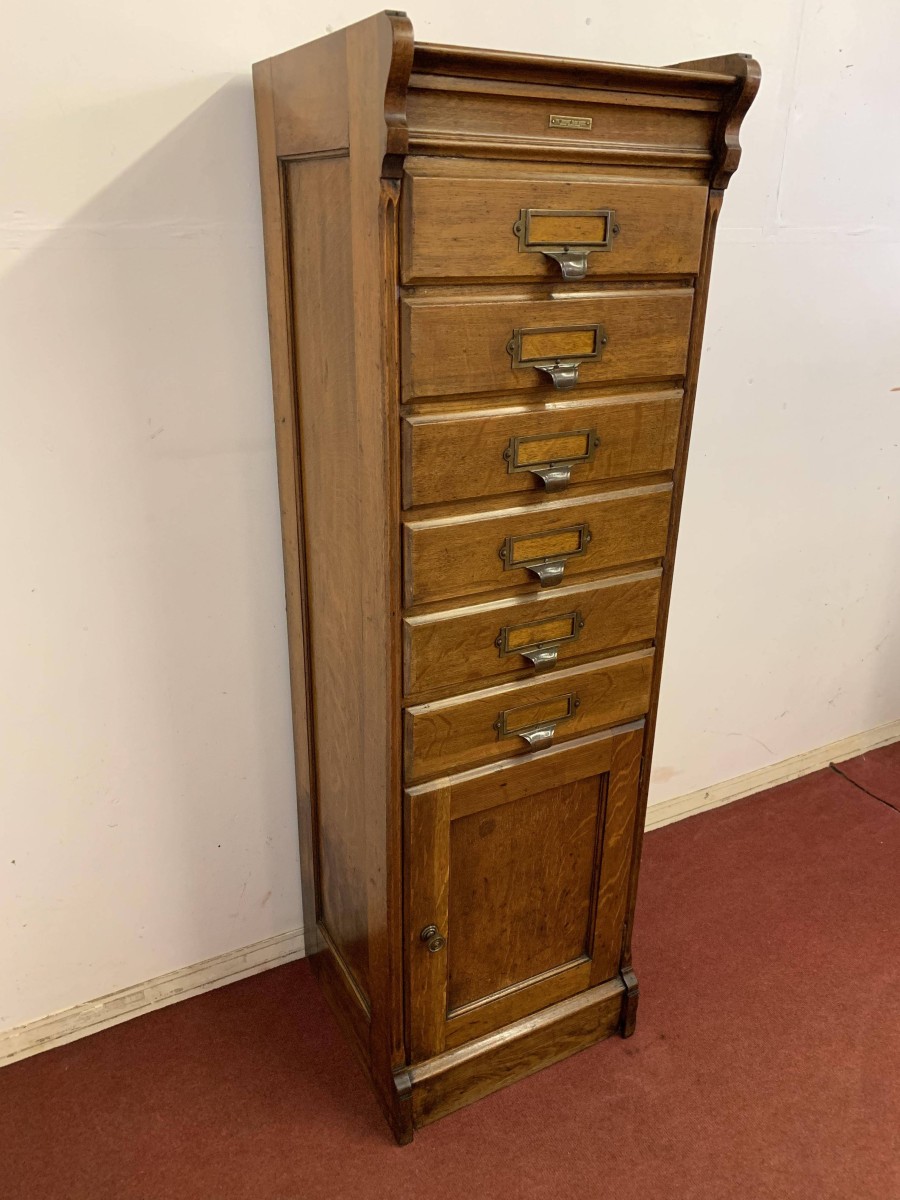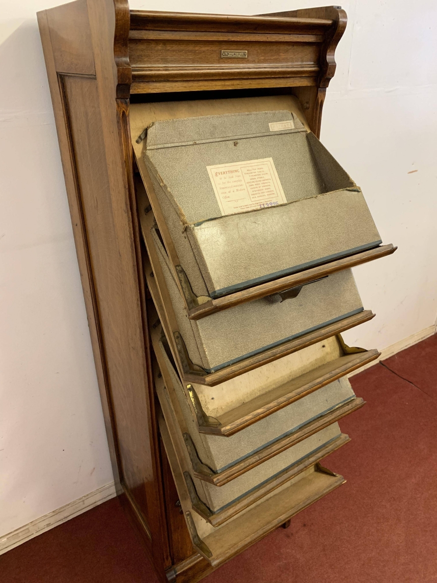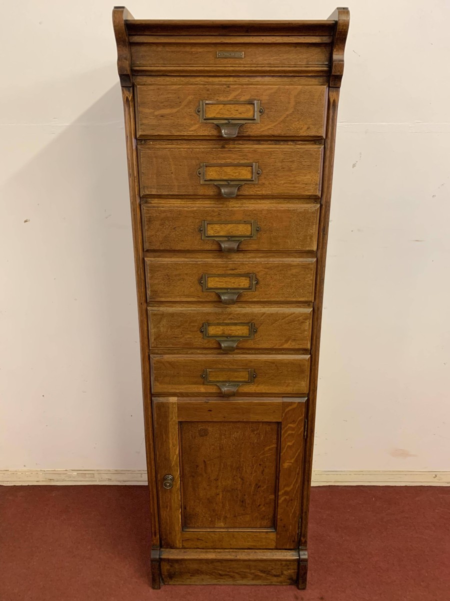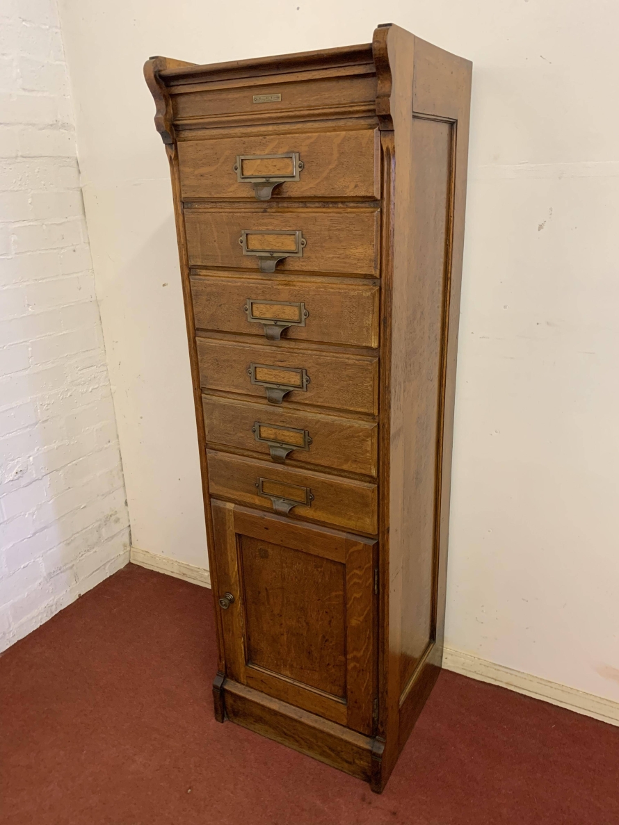 A fine example of British craftsmanship in striking golden oak – the cabinet has four sliding drawers, each drawer has a drop down function and rests open for easy access. . It is a rare item due to its slimness and also how the drawers drop for easy access to files. Each drawer has a brass nameplate and branded pull handle. Below is a cupboard door with a decorative brass knob handle, the door opens to reveal ample storage. OUTSTANDING