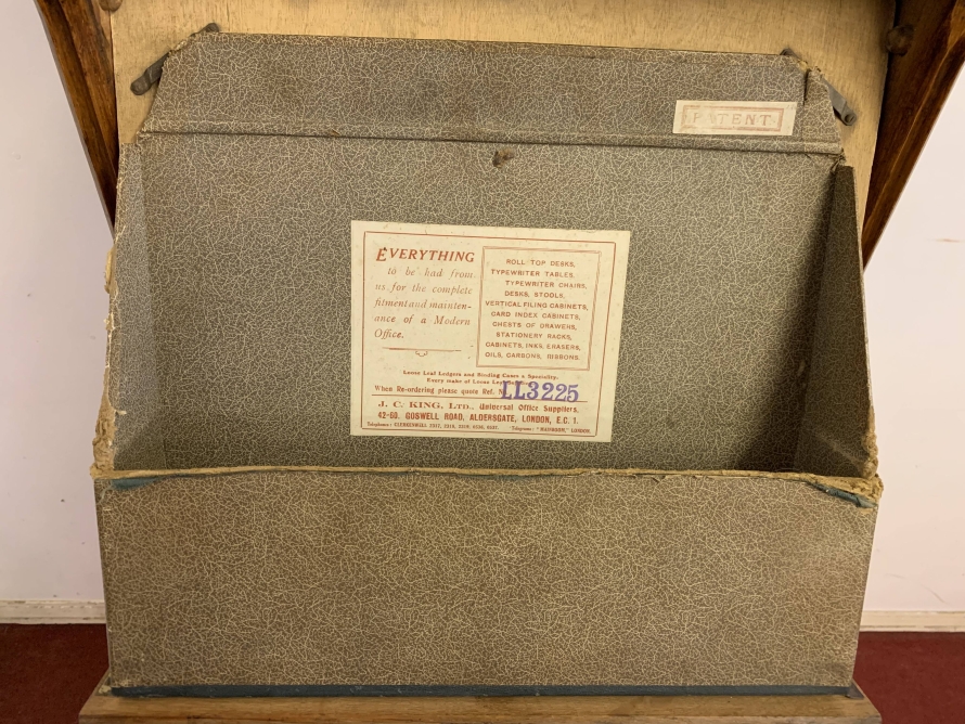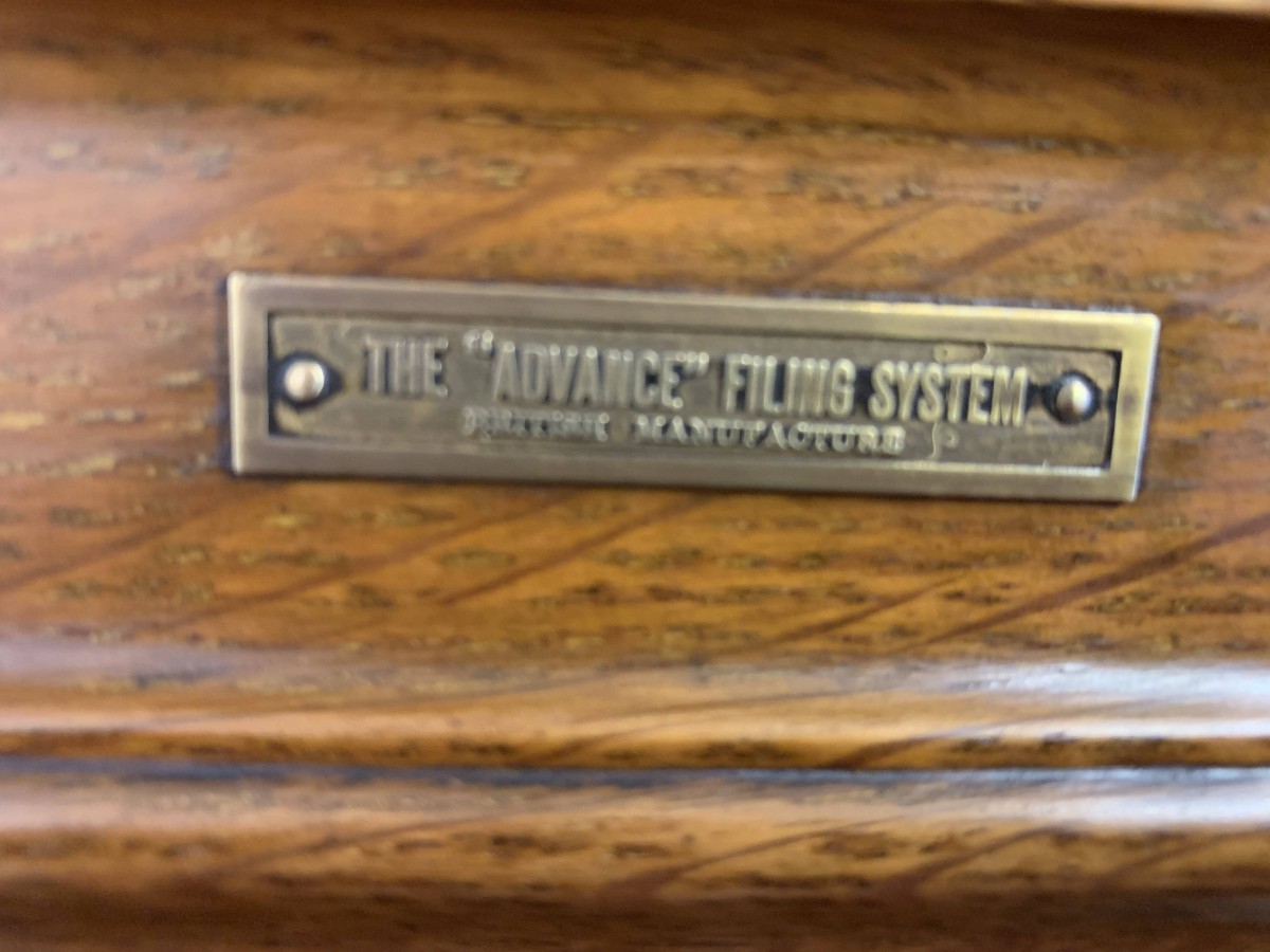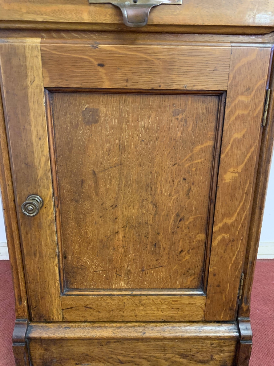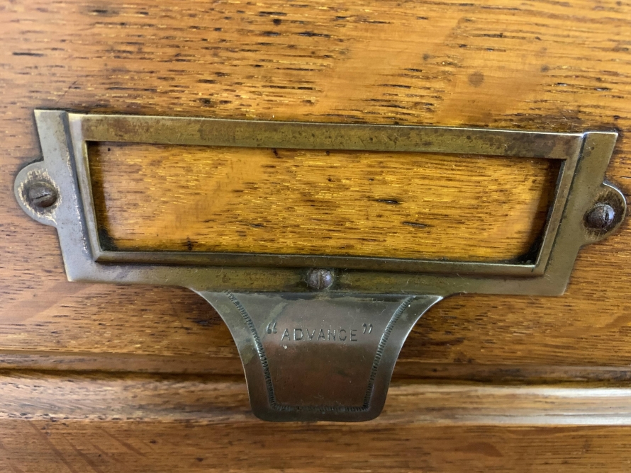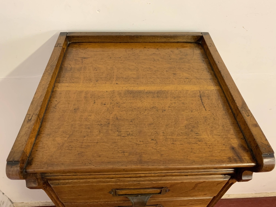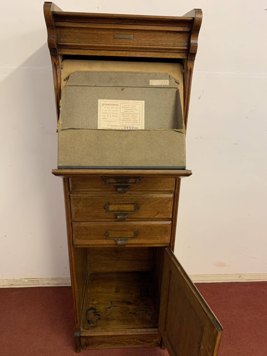 A fine example of British craftsmanship in striking golden oak – the cabinet has four sliding drawers, each drawer has a drop down function and rests open for easy access. . It is a rare item due to its slimness and also how the drawers drop for easy access to files. Each drawer has a brass nameplate and branded pull handle. Below is a cupboard door with a decorative brass knob handle, the door opens to reveal ample storage. OUTSTANDING