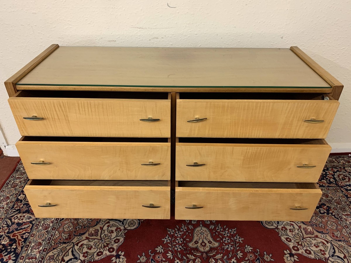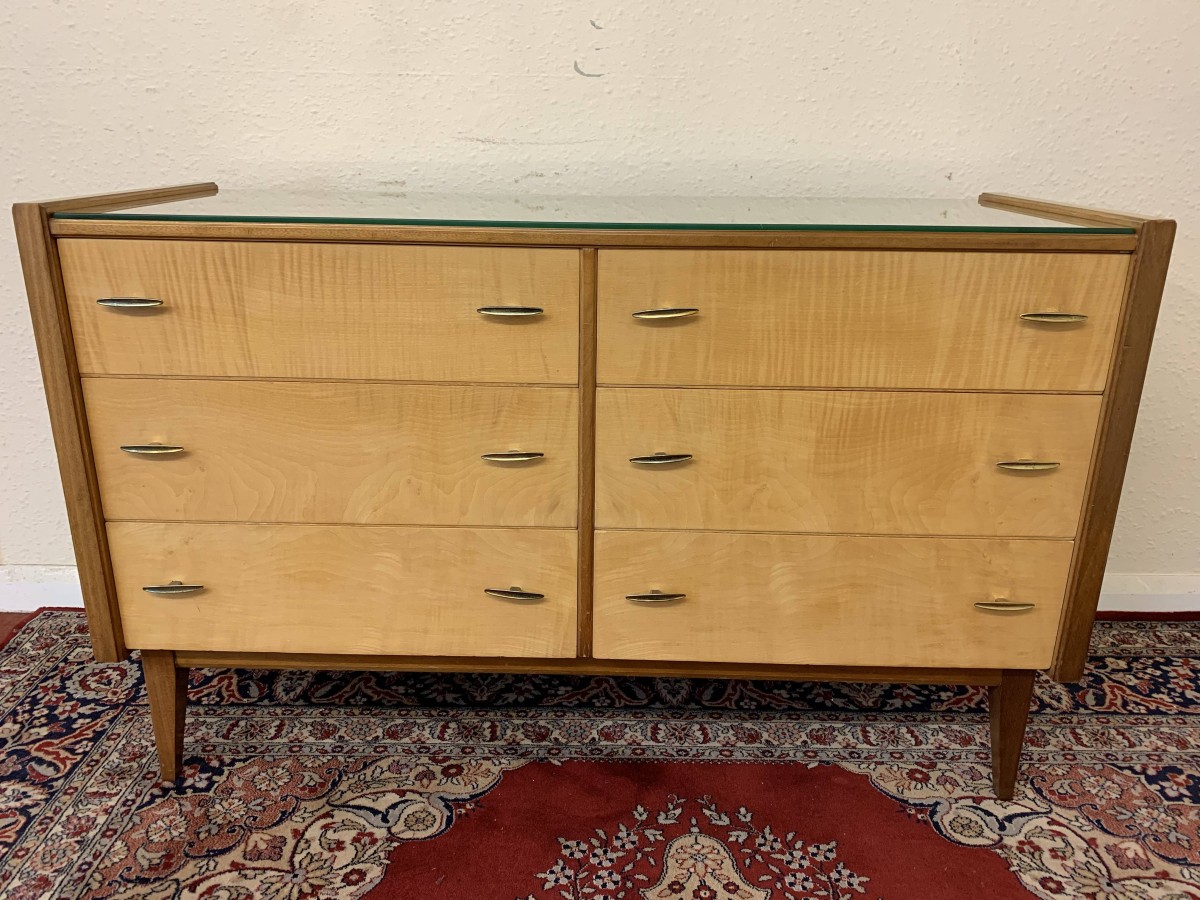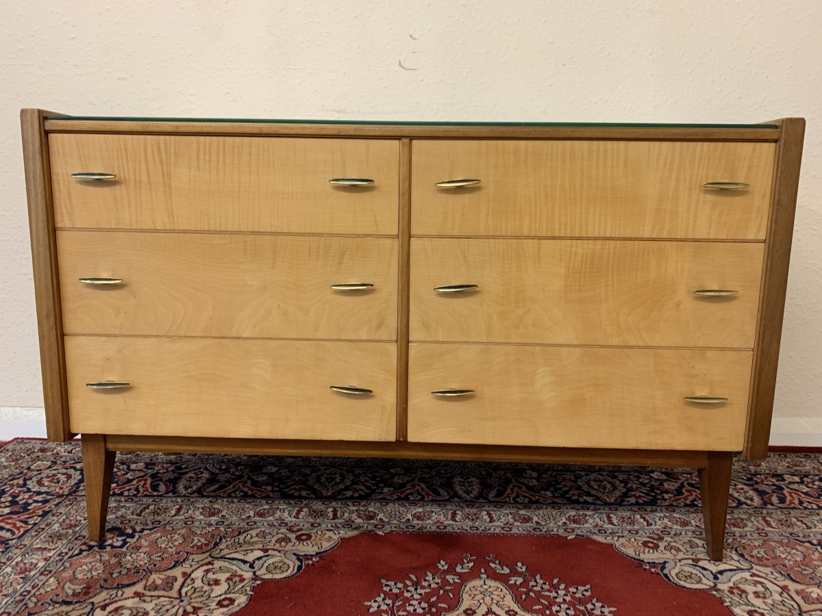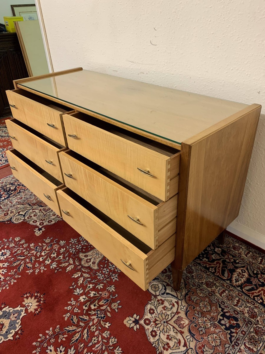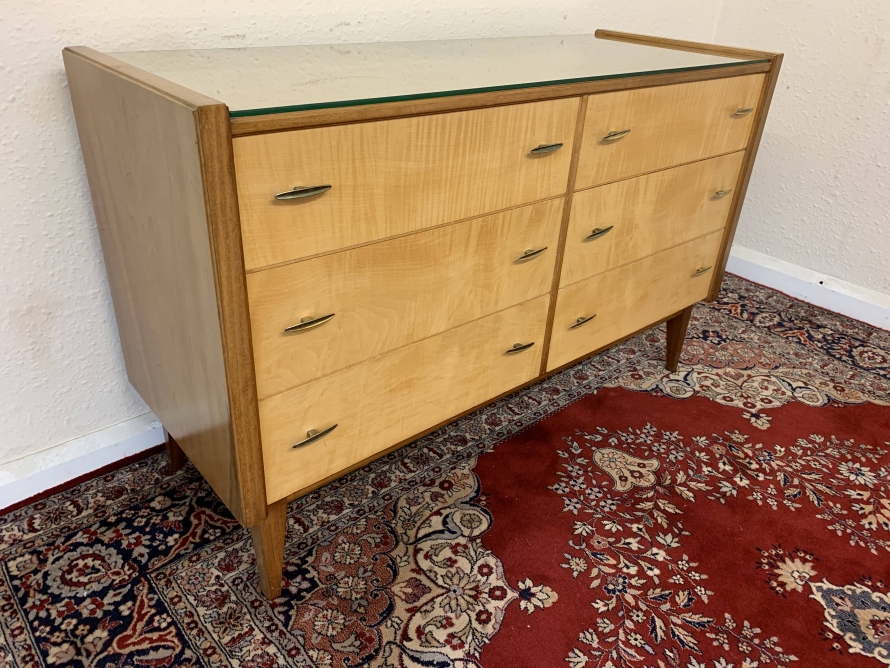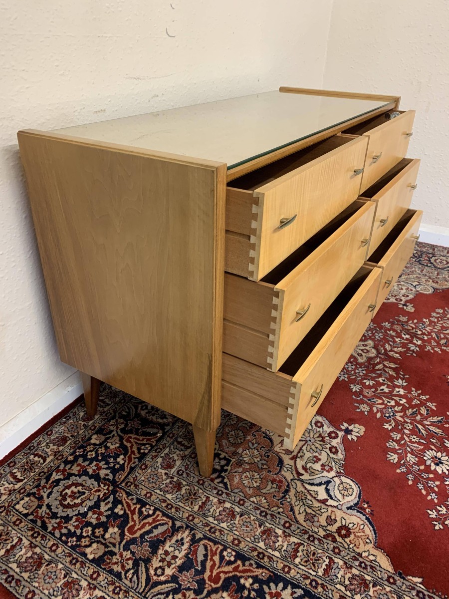 The top has a removable glass protector, below are six storage drawers each with a pair of original handles, the chest sits on four tapered legs