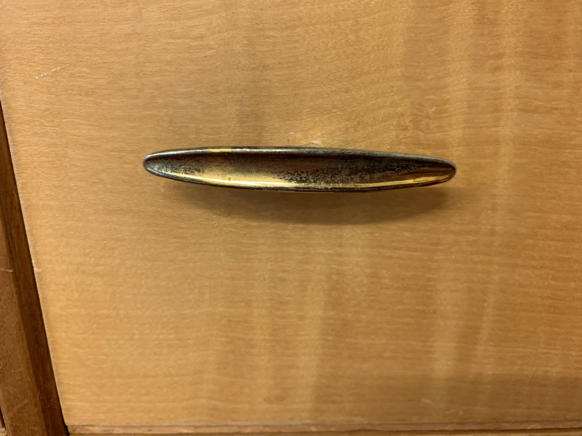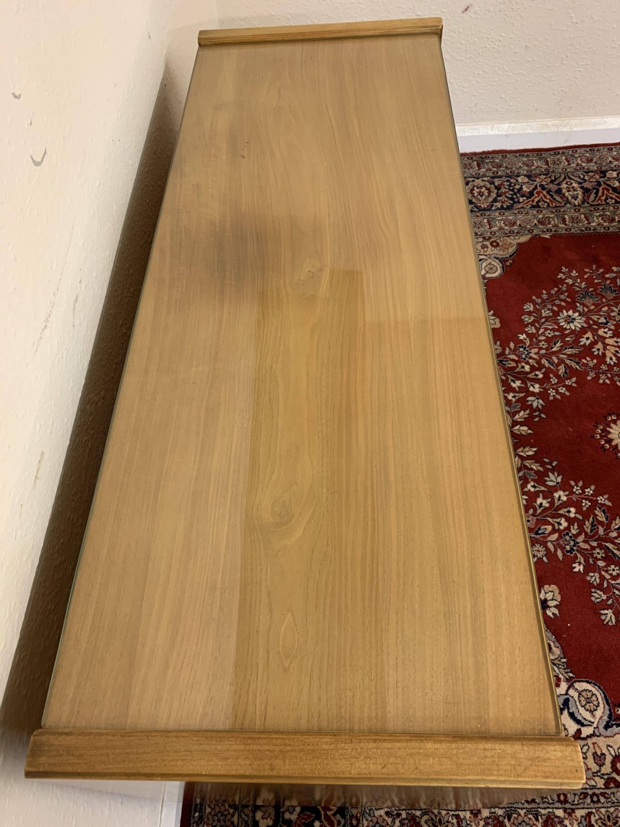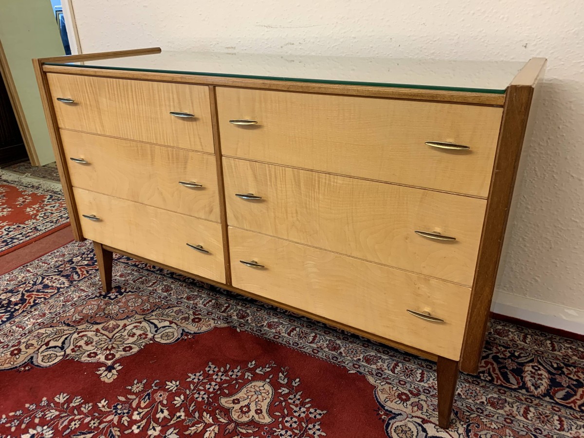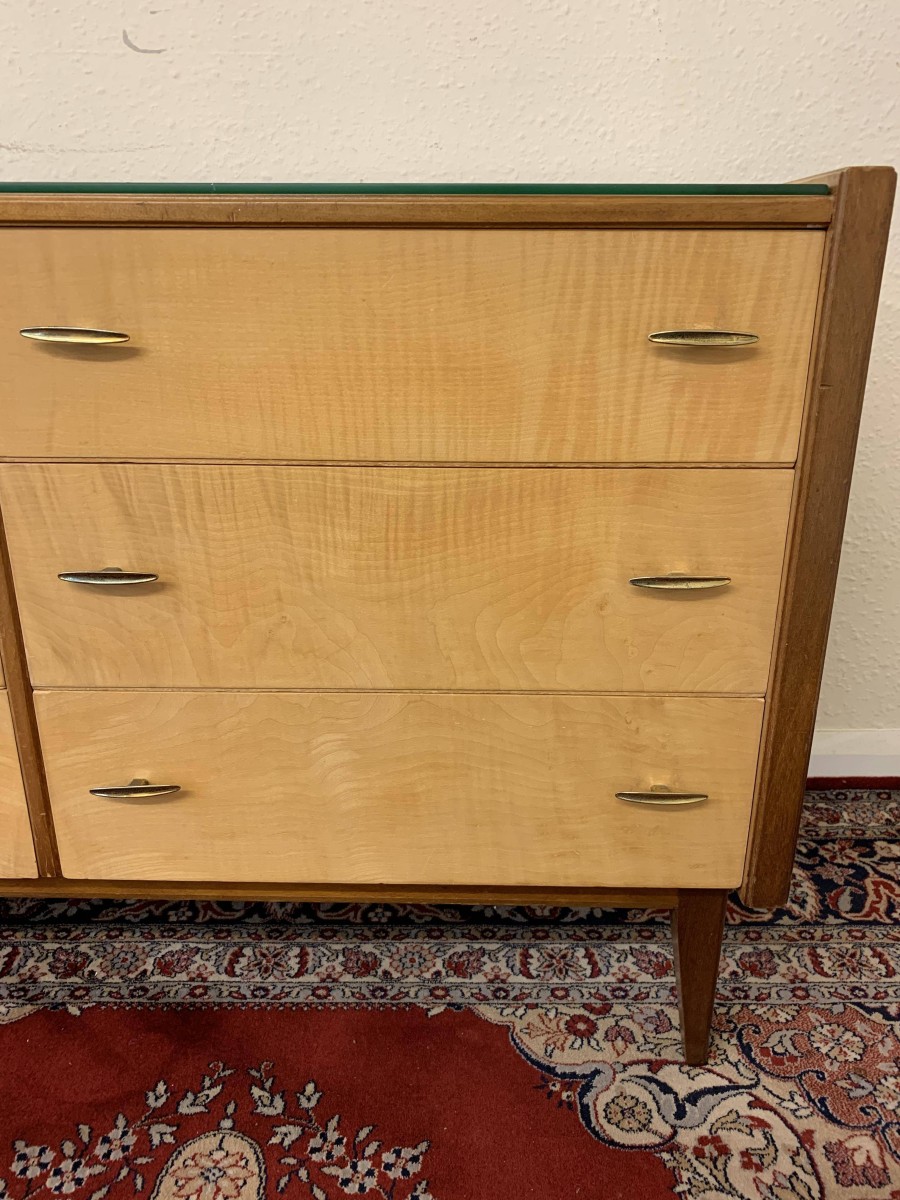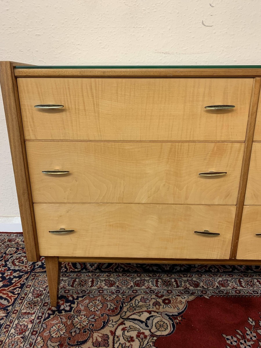 The top has a removable glass protector, below are six storage drawers each with a pair of original handles, the chest sits on four tapered legs