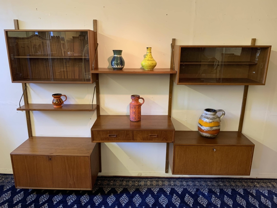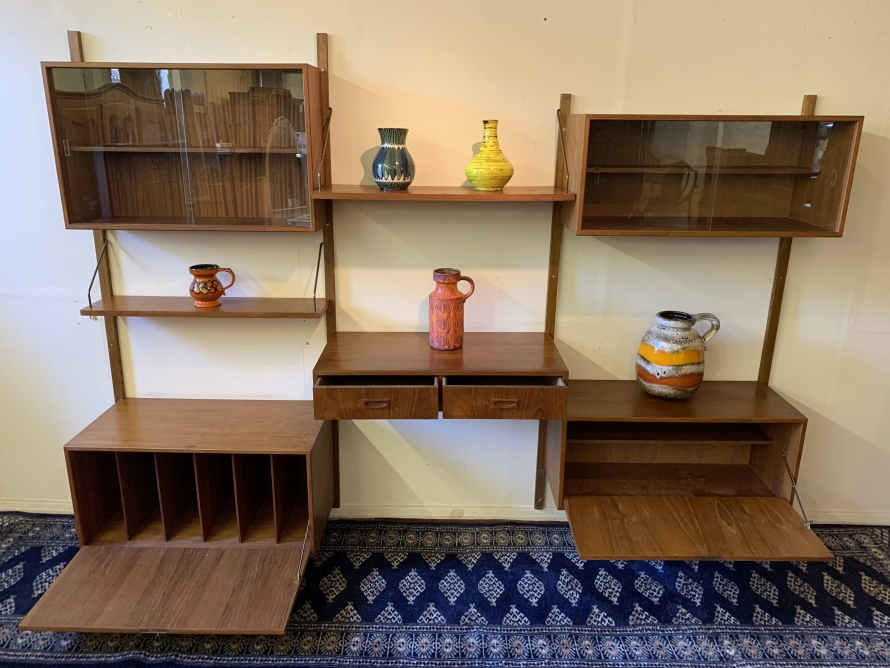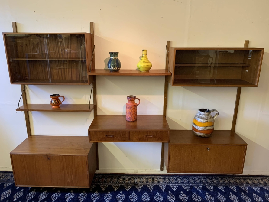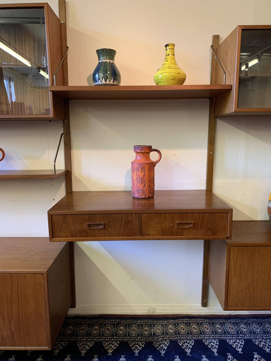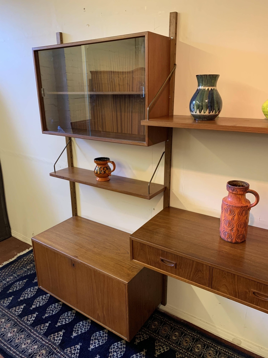 This stylish retro item is made by Skive Mobelfabrik of Denmark. Having four struts which fix to the wall and an array of adjustable shelves, drawers, cupboards and glass bookcases which can be placed to create your own personal modular design. This on trend Mid Century wall system splits down for easy transportation and delivery into any home.