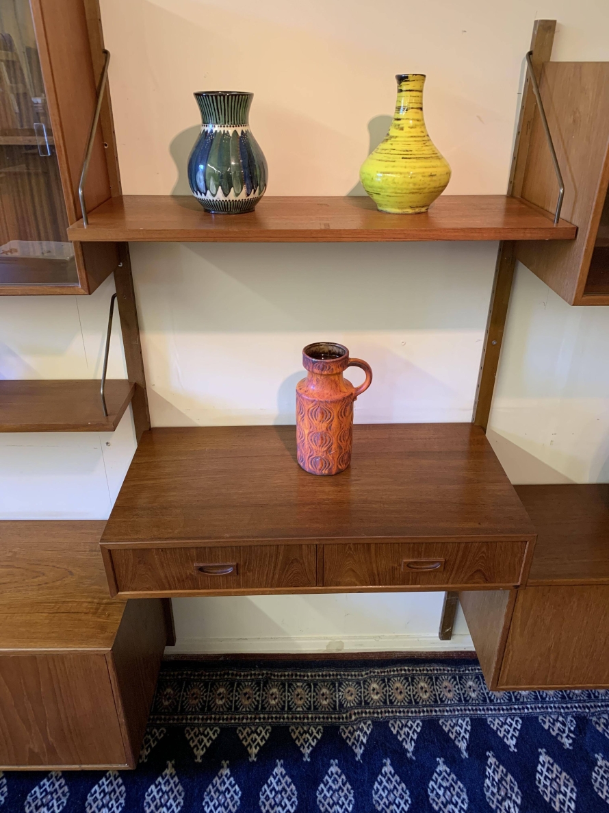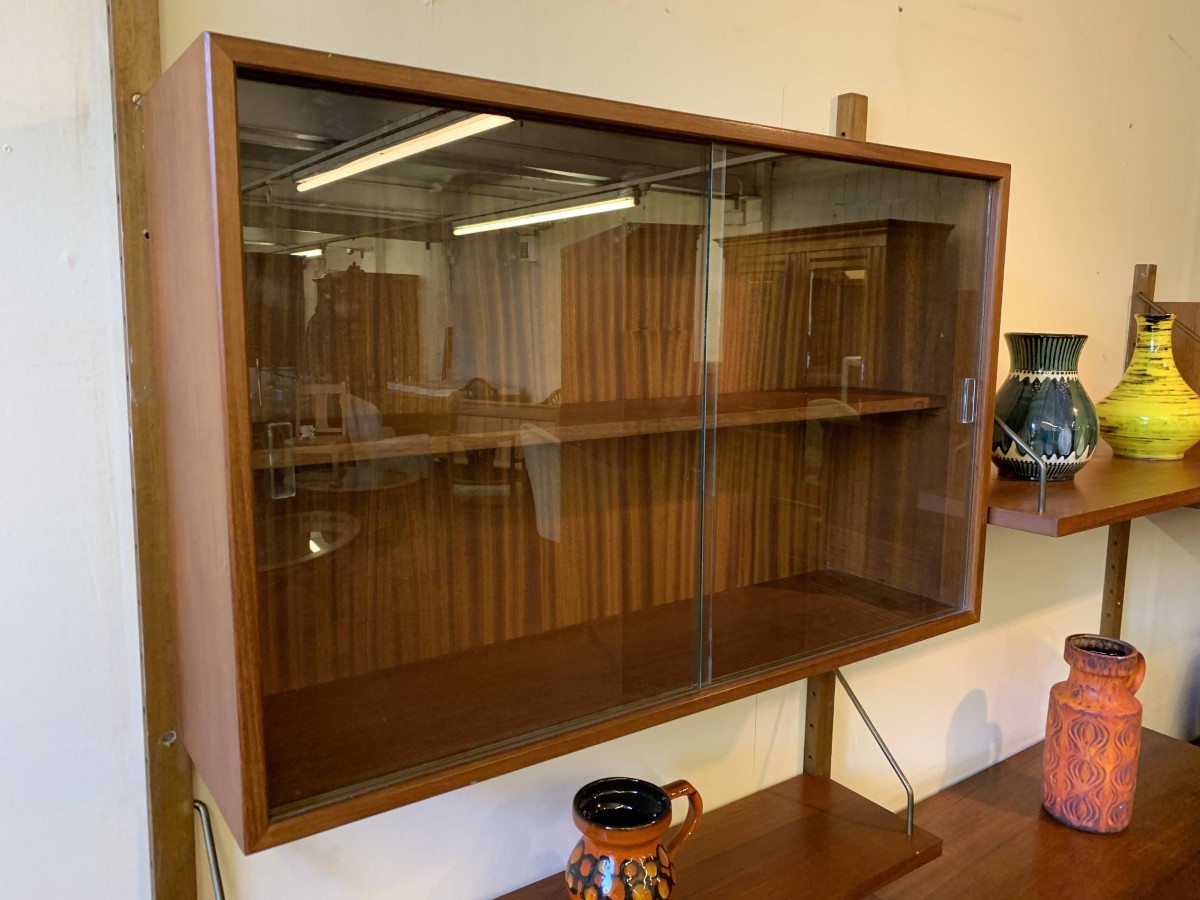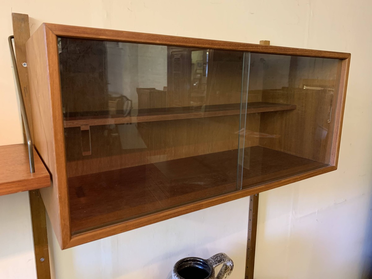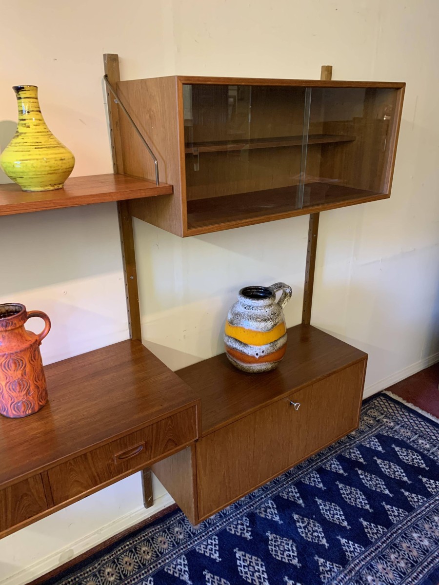 This stylish retro item is made by Skive Mobelfabrik of Denmark. Having four struts which fix to the wall and an array of adjustable shelves, drawers, cupboards and glass bookcases which can be placed to create your own personal modular design. This on trend Mid Century wall system splits down for easy transportation and delivery into any home.