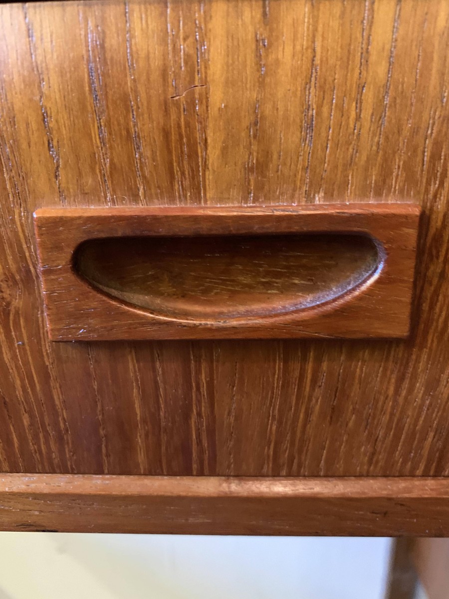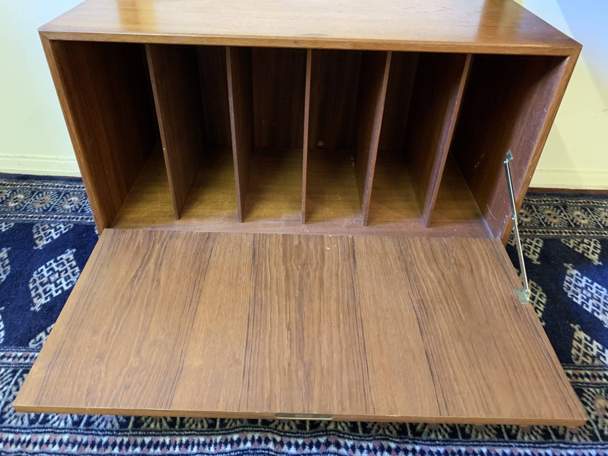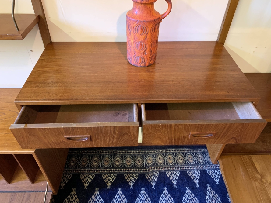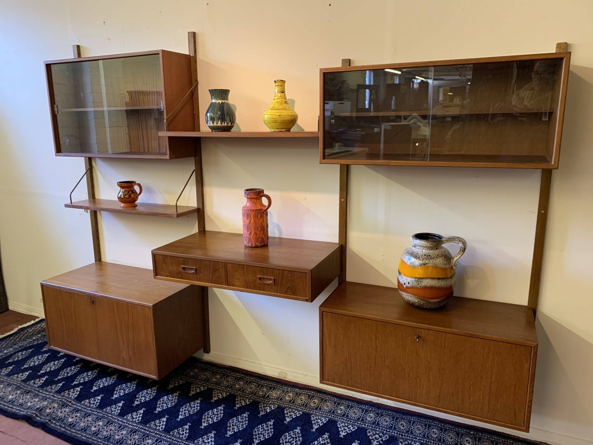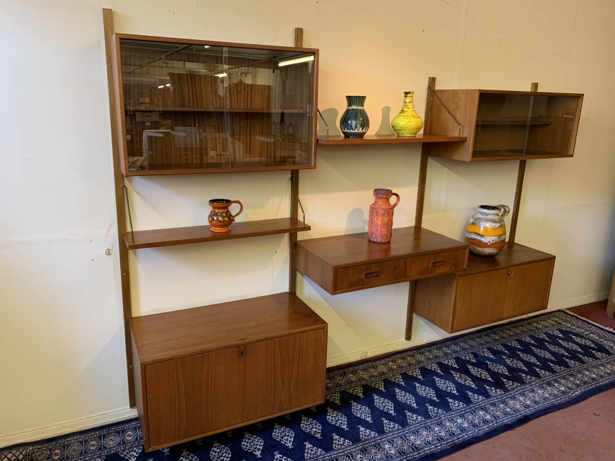This stylish retro item is made by Skive Mobelfabrik of Denmark. Having four struts which fix to the wall and an array of adjustable shelves, drawers, cupboards and glass bookcases which can be placed to create your own personal modular design. This on trend Mid Century wall system splits down for easy transportation and delivery into any home.