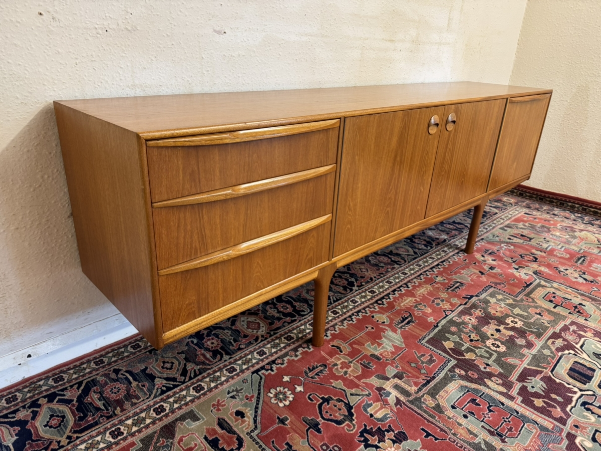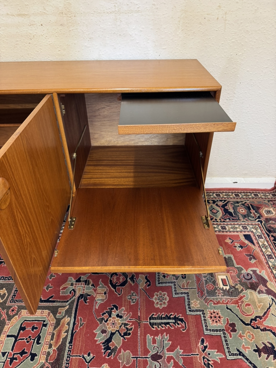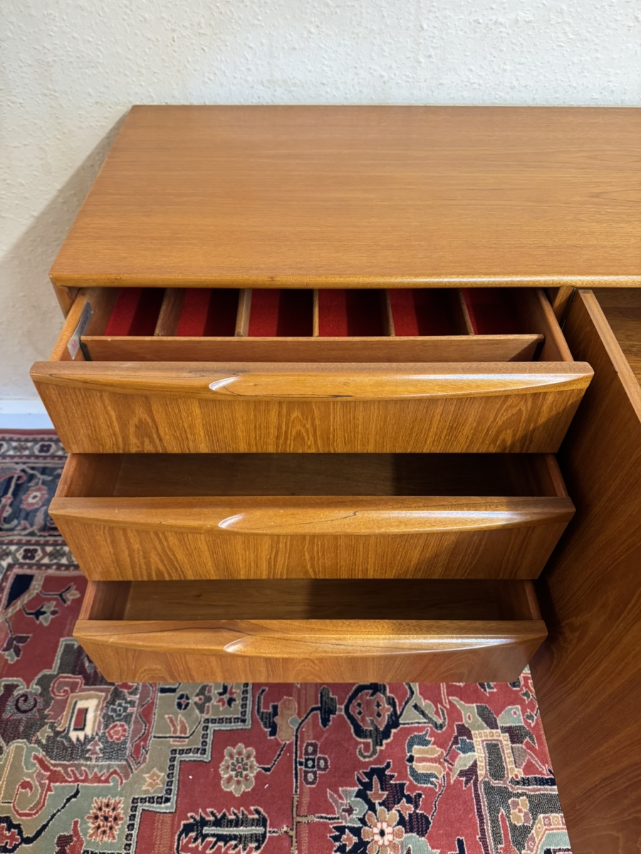 This sophisticated retro teak mid century sideboard is in excellent condition. The teak patina is striking. Three drawers, two central cupboard doors and a drop down bottle drawer to the right with hidden serving slide. This fabulous Dunvegan sideboard made by the renowned McIntosh furniture makers stands on four turned legs.