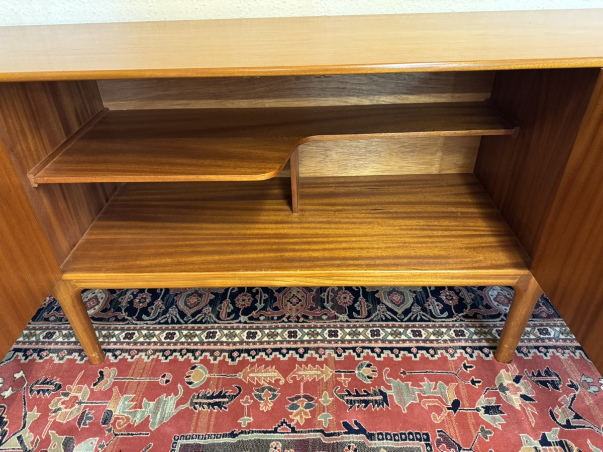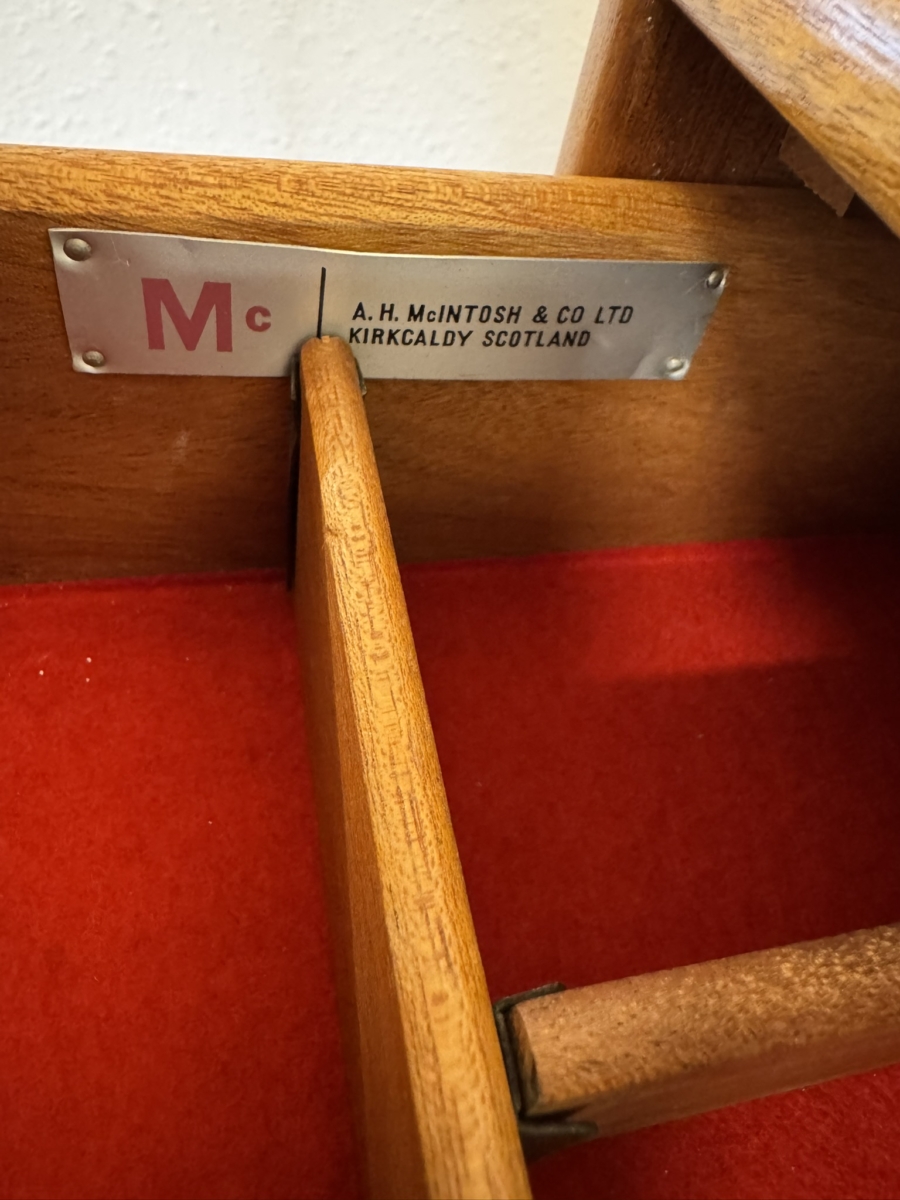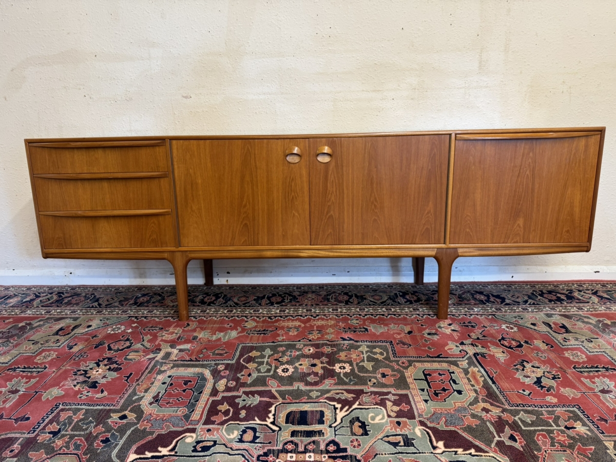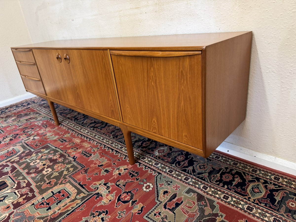 This sophisticated retro teak mid century sideboard is in excellent condition. The teak patina is striking. Three drawers, two central cupboard doors and a drop down bottle drawer to the right with hidden serving slide. This fabulous Dunvegan sideboard made by the renowned McIntosh furniture makers stands on four turned legs.