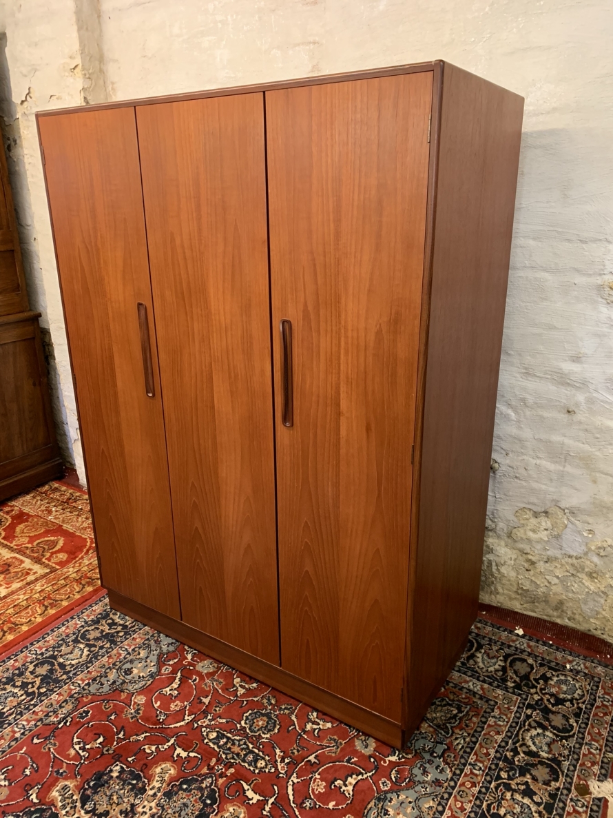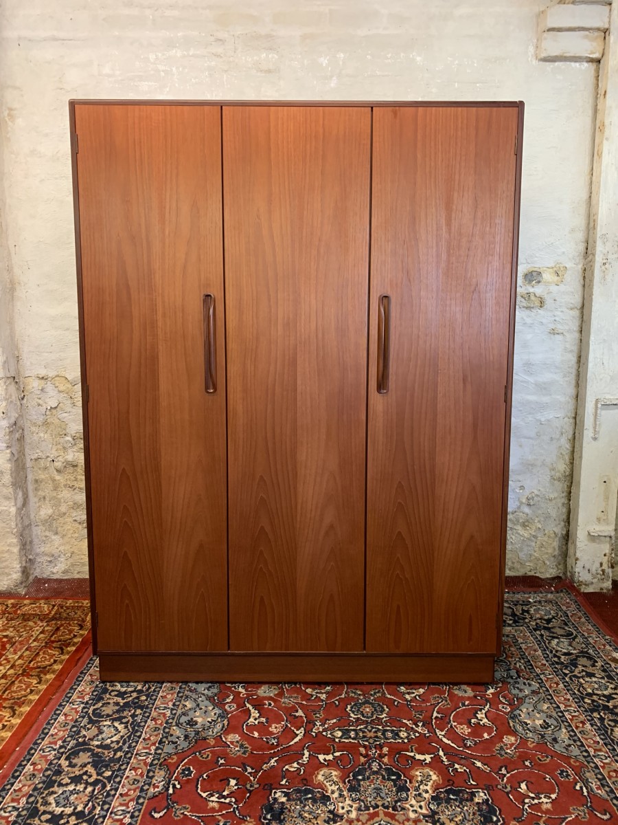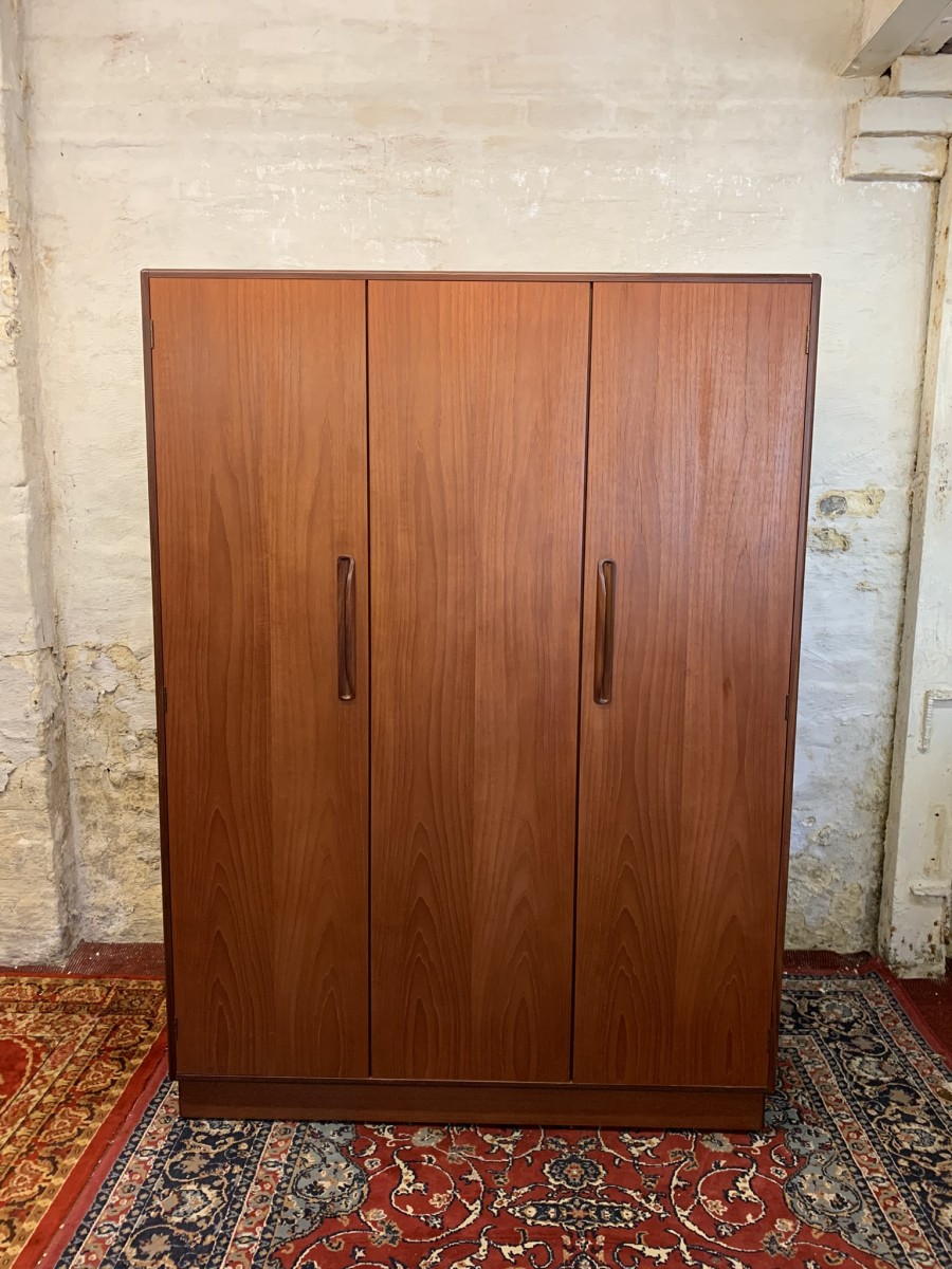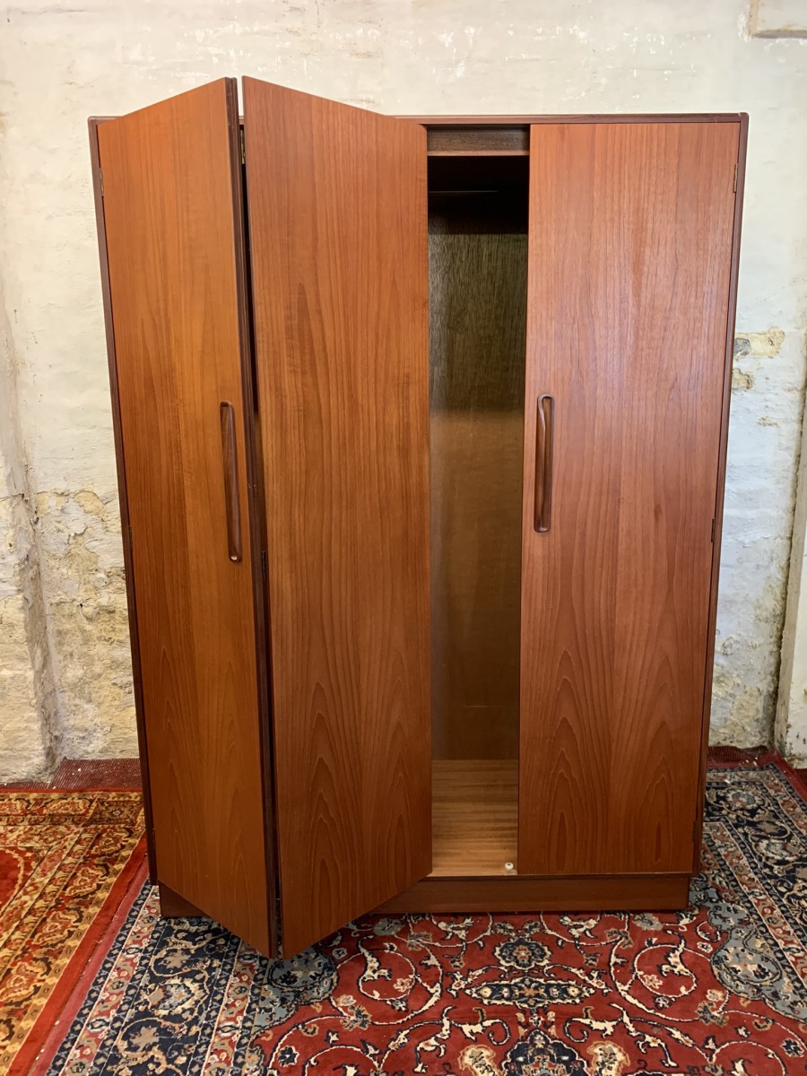 The wardrobe is made by the renowned Gplan furniture company dating 1960 and in excellent condition. Add some mid century flair to your home. The left and central concertina doors and right door open to reveal a hanging rail. The wardrobe splits down for easy transportation and delivery into any home.