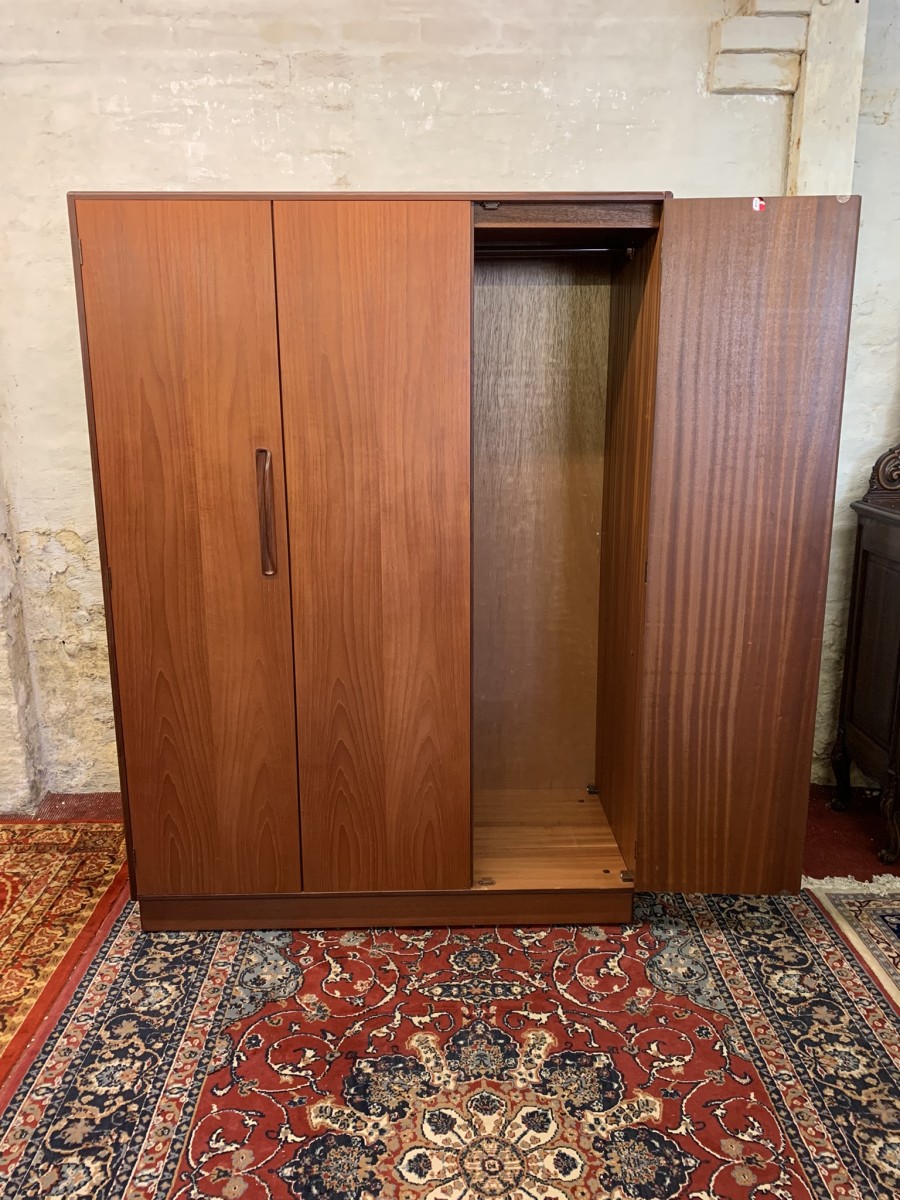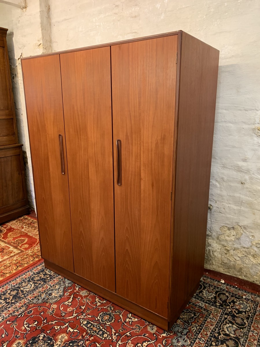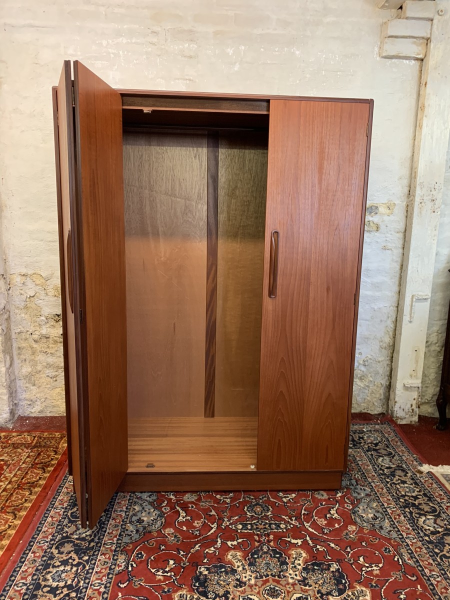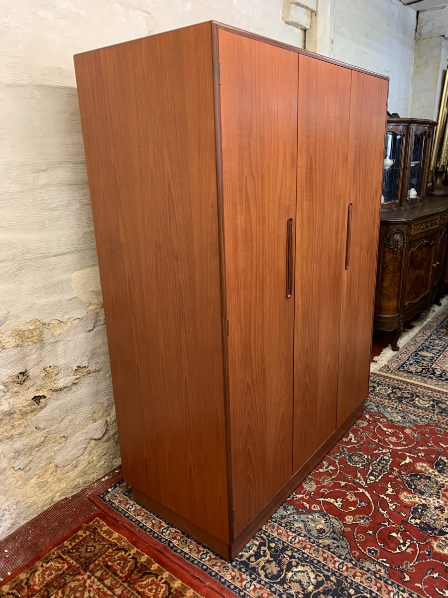 The wardrobe is made by the renowned Gplan furniture company dating 1960 and in excellent condition. Add some mid century flair to your home. The left and central concertina doors and right door open to reveal a hanging rail. The wardrobe splits down for easy transportation and delivery into any home.