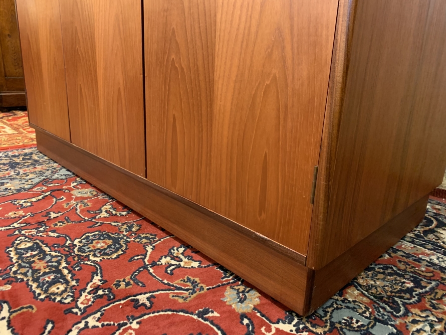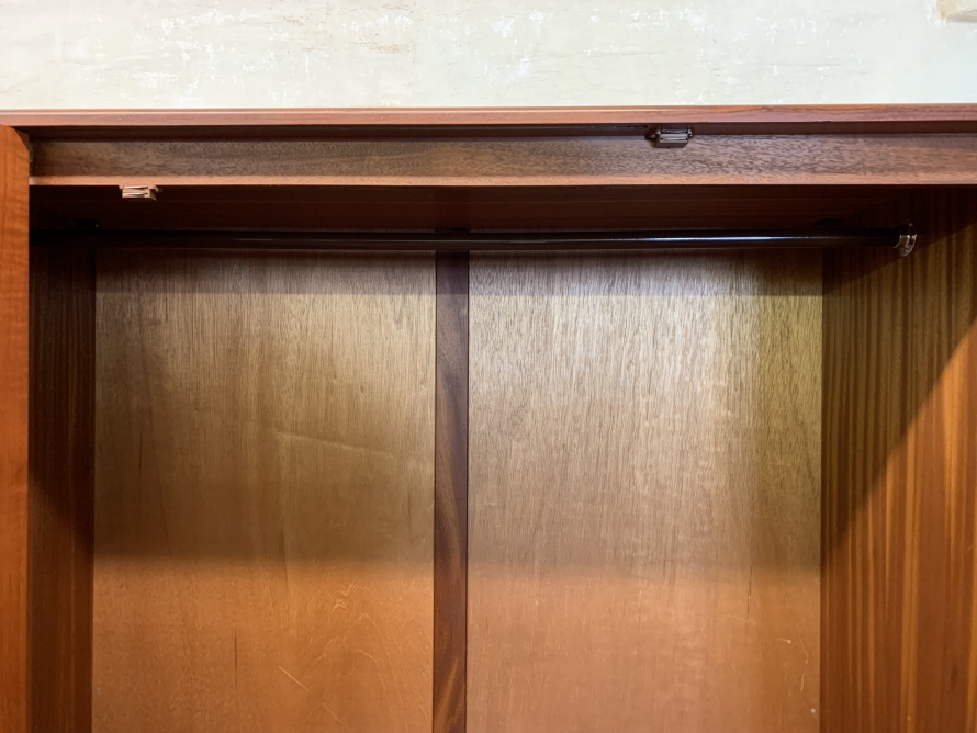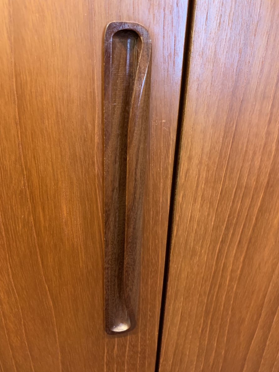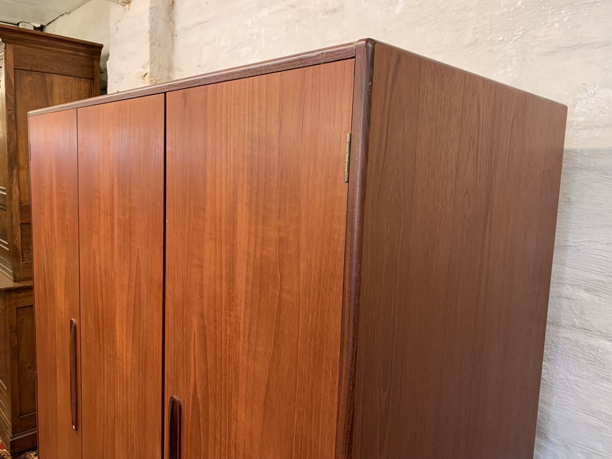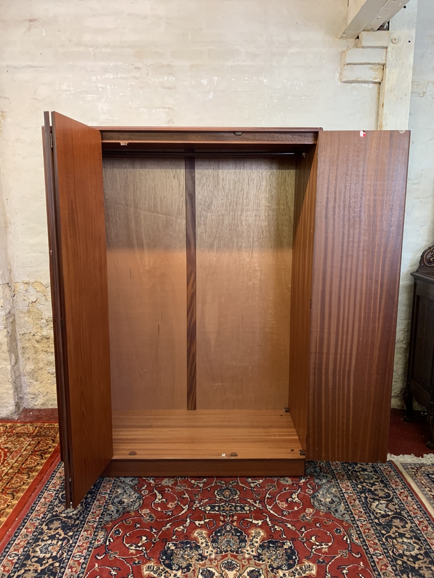 The wardrobe is made by the renowned Gplan furniture company dating 1960 and in excellent condition. Add some mid century flair to your home. The left and central concertina doors and right door open to reveal a hanging rail. The wardrobe splits down for easy transportation and delivery into any home.
