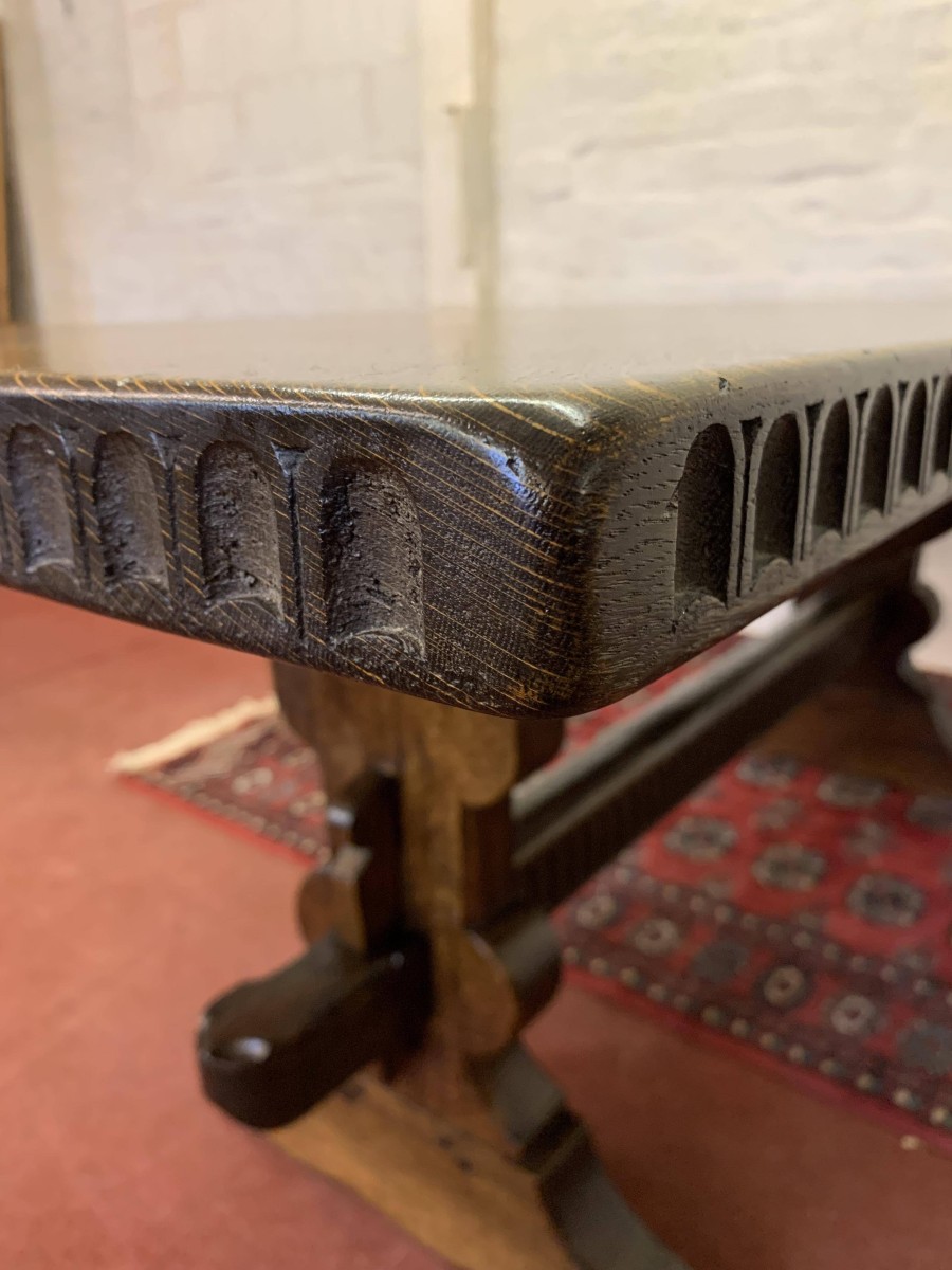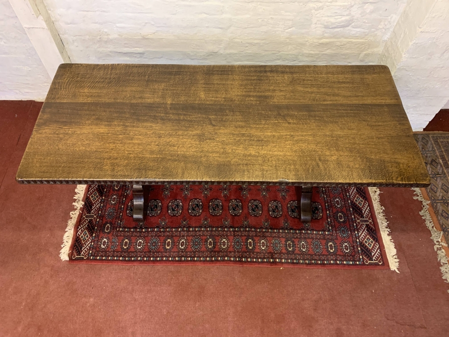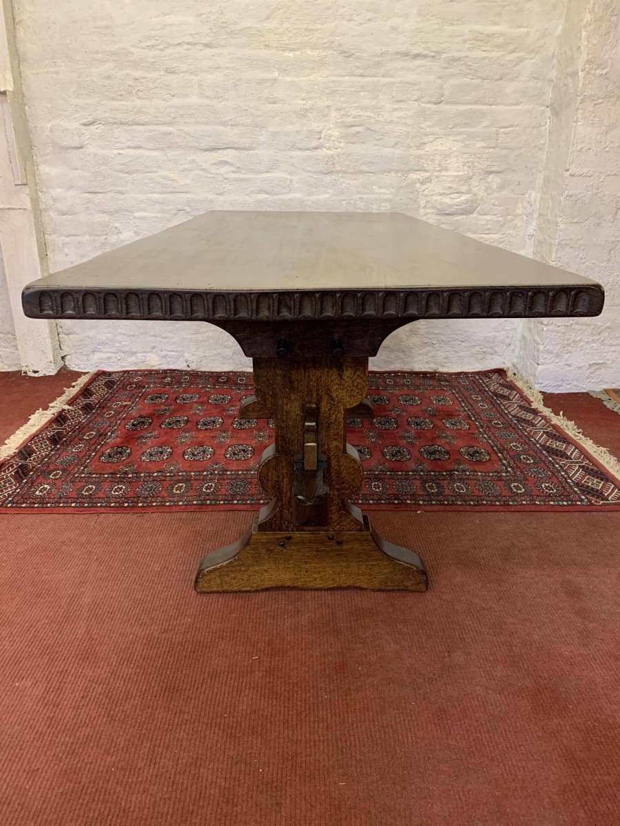 This fantastic solid carved oak table was made by the renowned Rupert Nigel Griffiths furniture makers. Each of their items is individually crafted with hand cut dovetails and is carved, stained and polished by hand. Made entirely of quality solid oak with a beautiful graining throughout the thick top table has a carved edge. Having outstretched legs with sturdy blocked feet, carved central stretcher held in place by two handmade pegs at either end, its a stunning table which is in excellent condition.